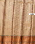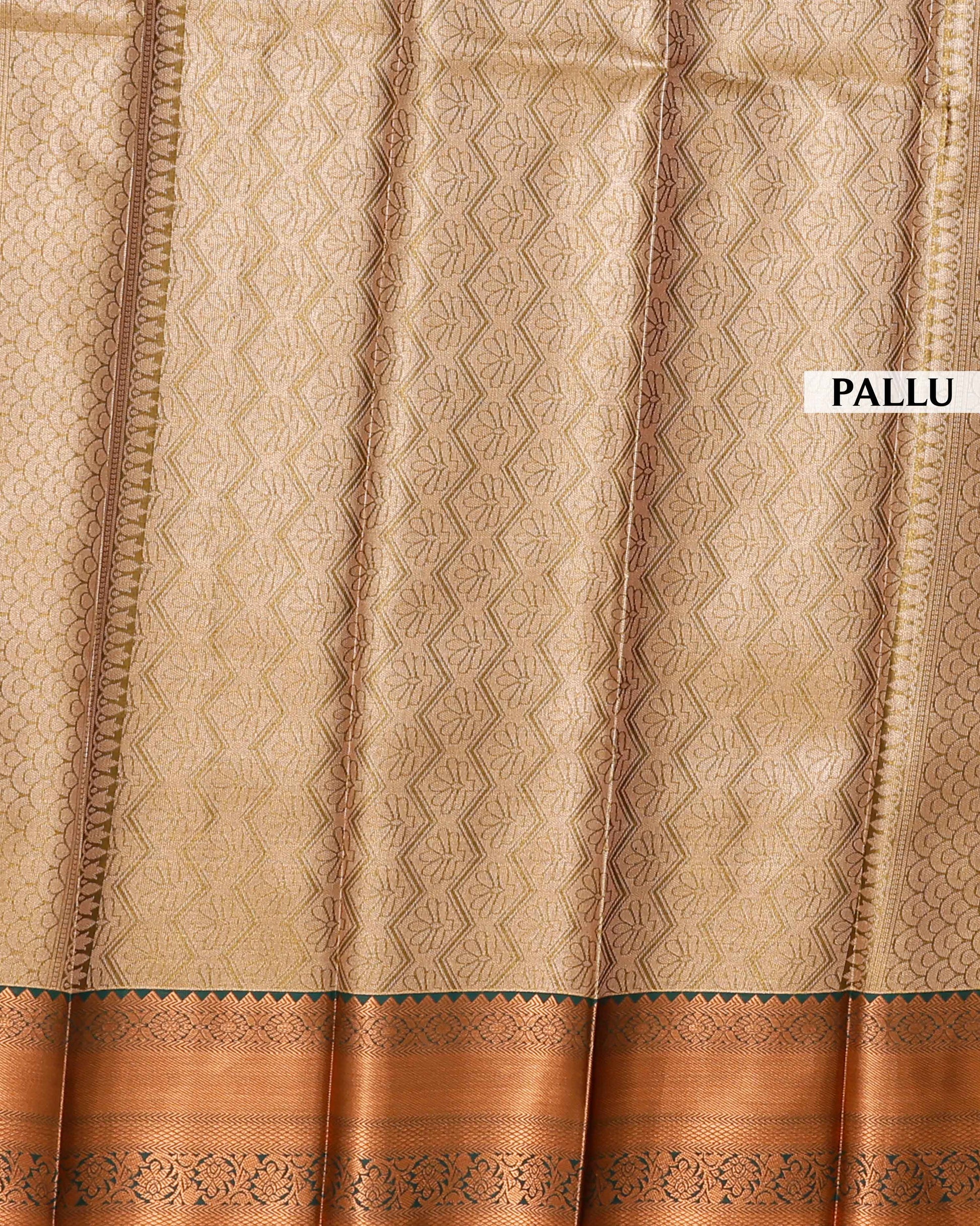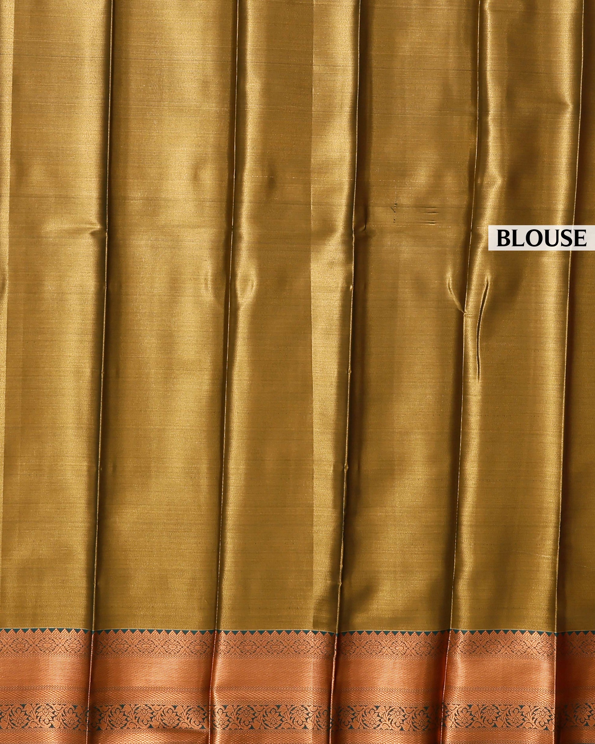 - The saree is finished with a striking contrast zari border in a copper tone, detailed with intricate patterns and a bright blue edge.