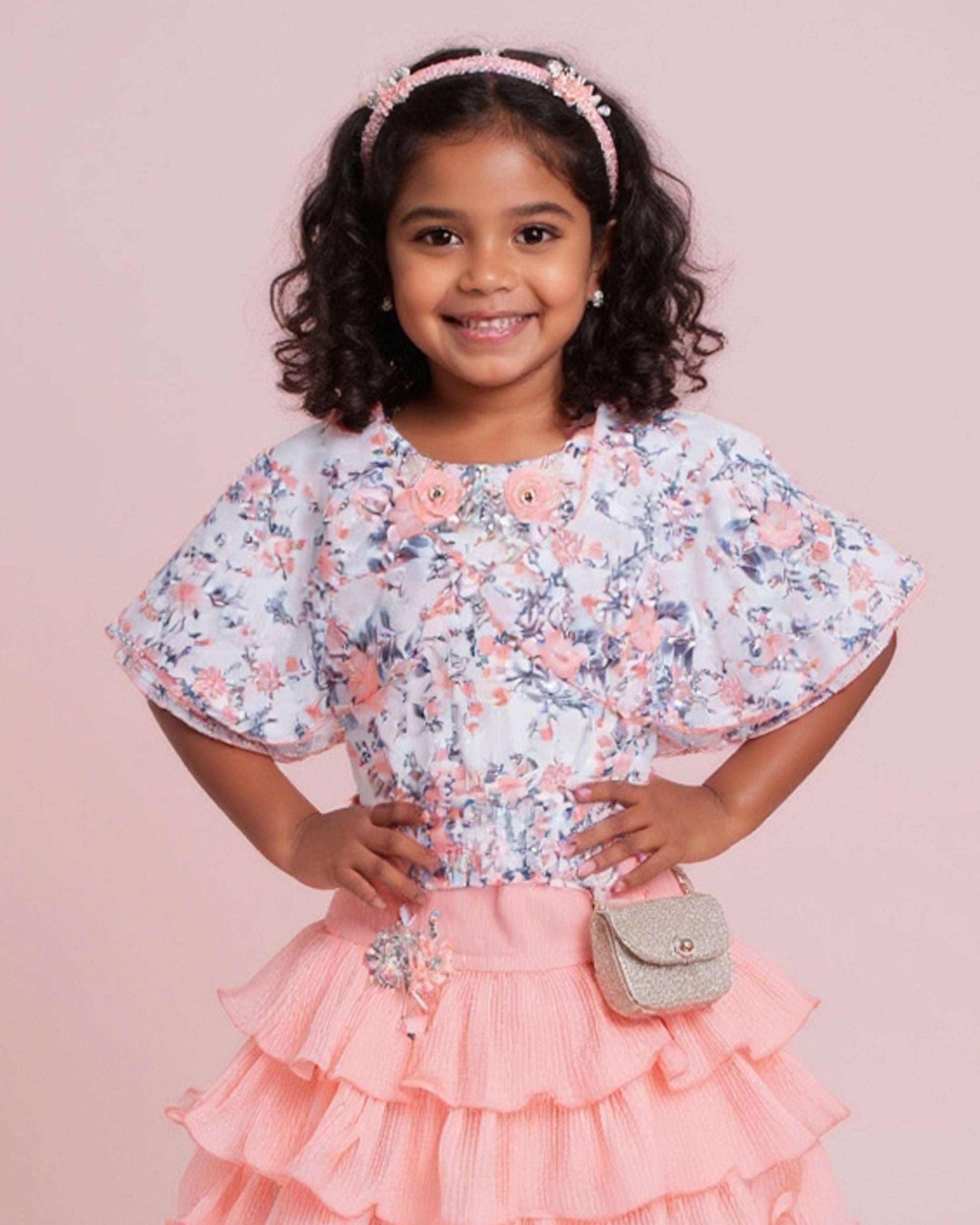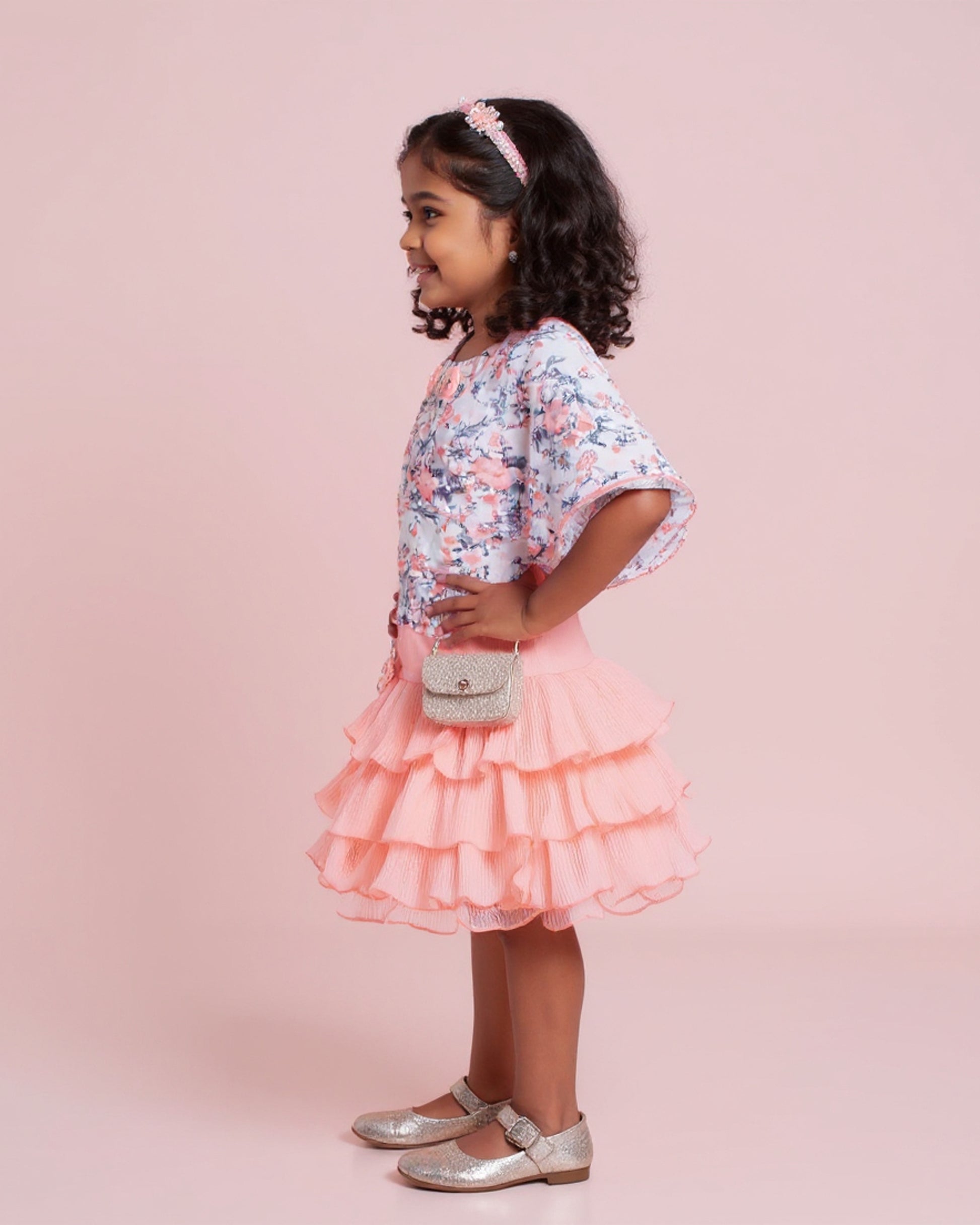 Girls' Ruffled Skirt and Floral Top Set with Embellished - Peach