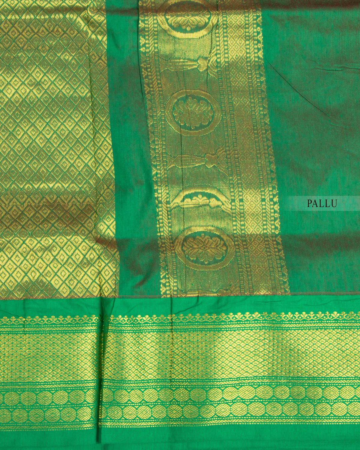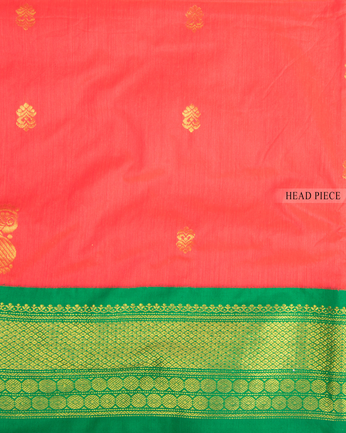 - Elevate your traditional wardrobe with this stunning Kalyani Cotton Saree a vibrant red body and a rich contrasting green border with intricate zari work.