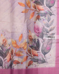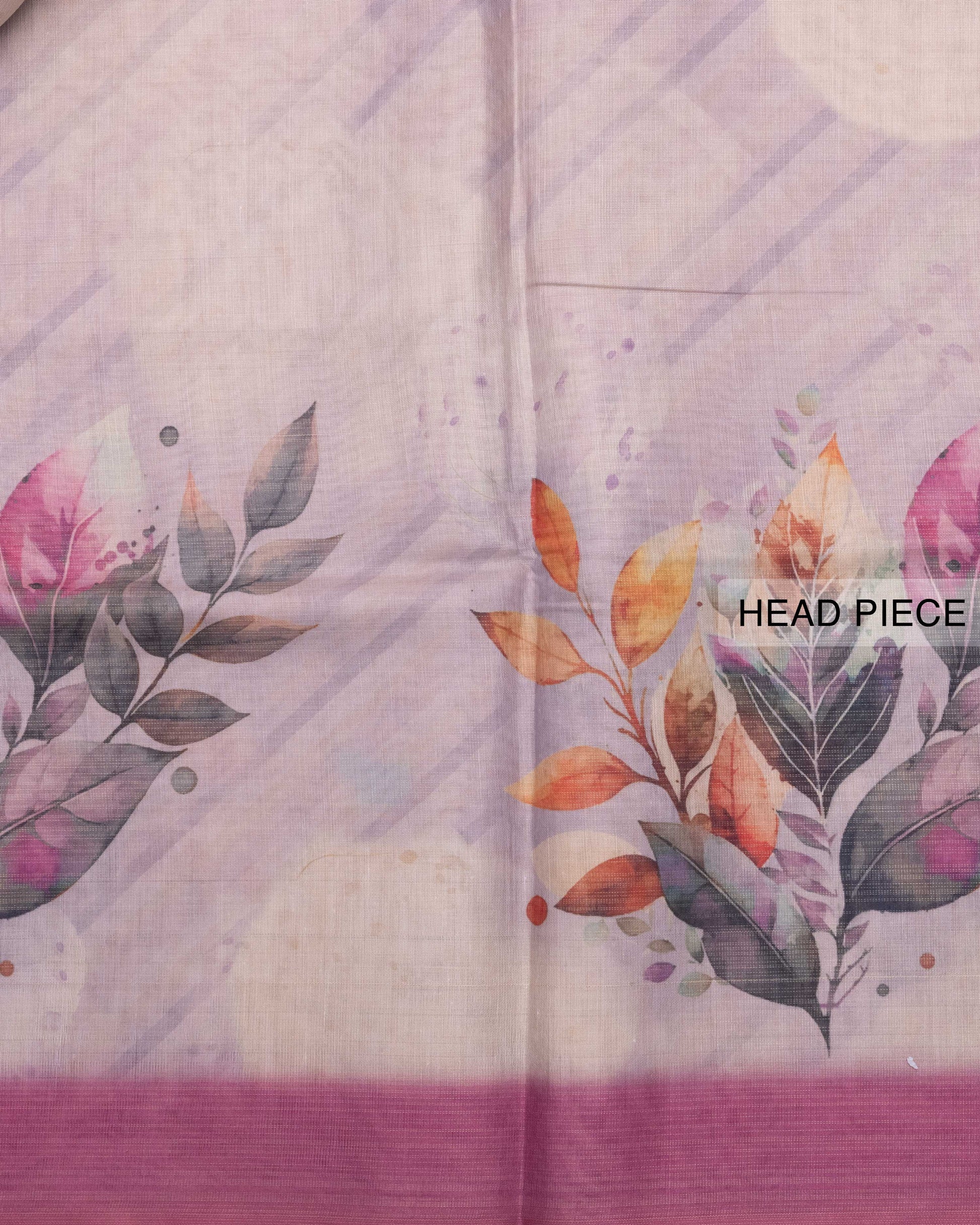 - This elegant tissue saree a stunning digital print of autumn leaves on a subtle lavender-grey base