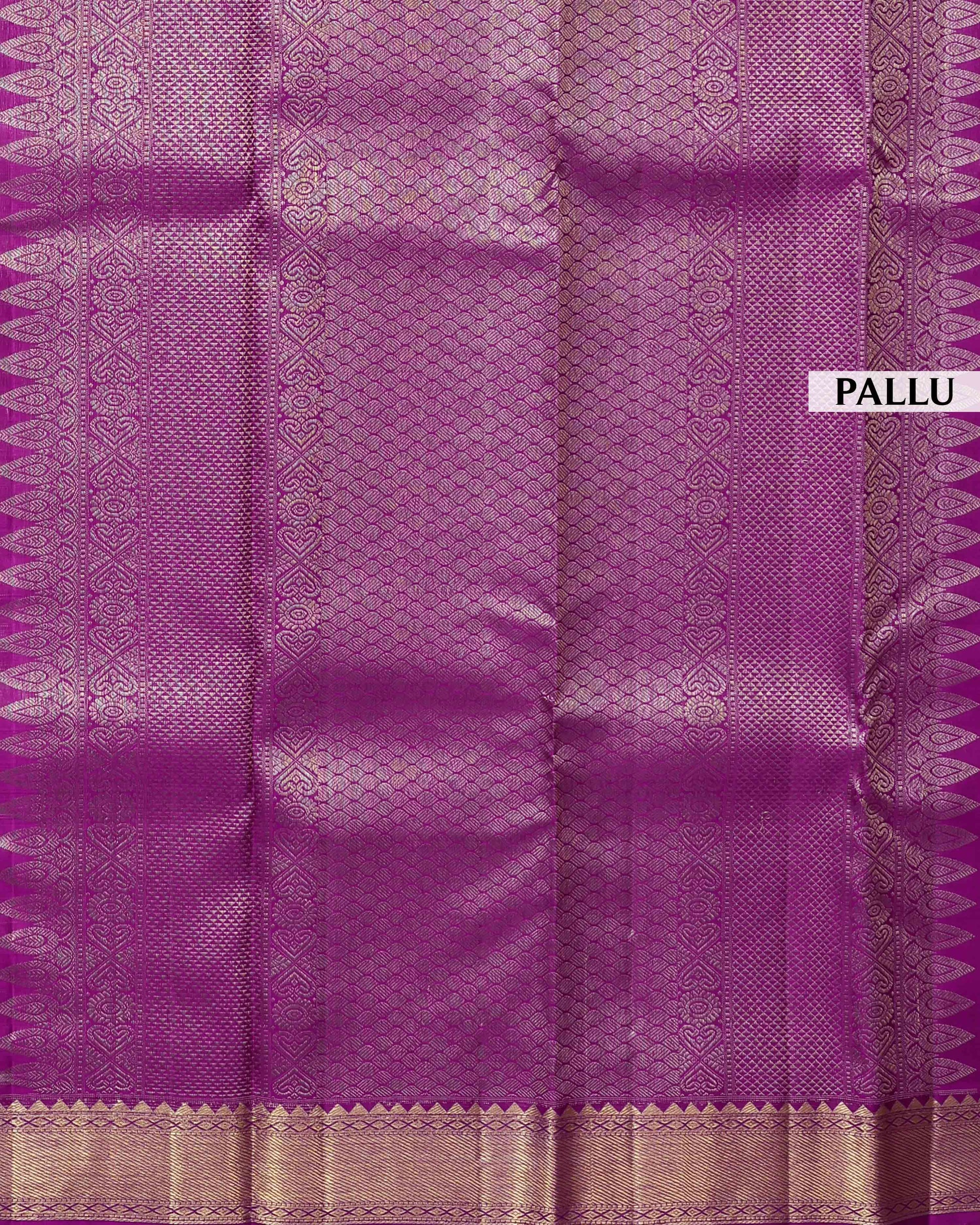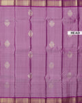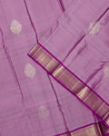 - This exquisite handloom Kanchipuram pure silk saree a soft lavender body with intricate golden zari motifs and a striking magenta border