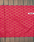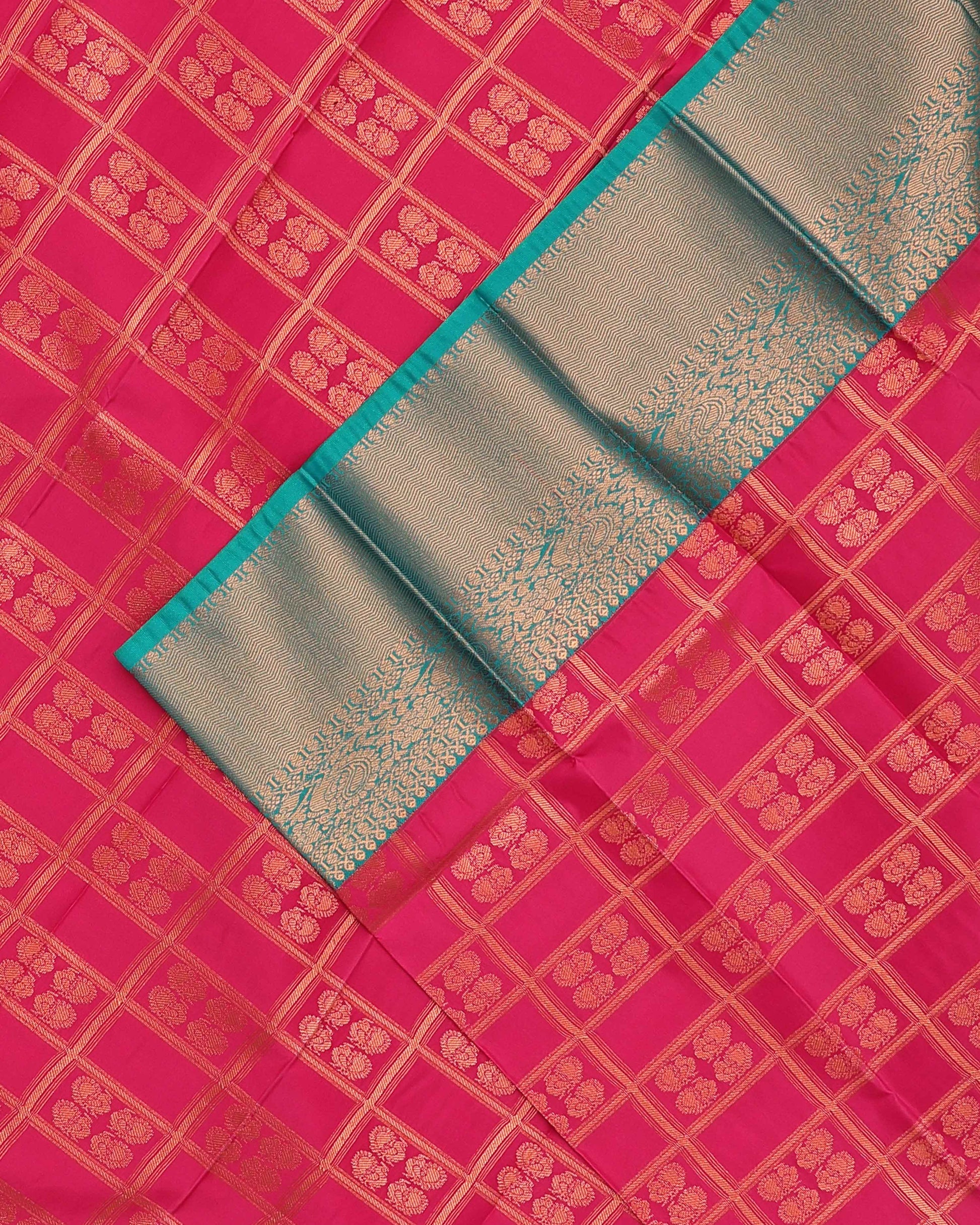 - This stunning premium silk saree a vibrant Rani Pink body with intricate gold zari checks