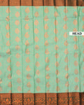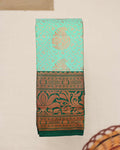 - Elevate your style with this premium pista green silk saree, a luxurious zari-woven body and a rich, contrasting dark green border with intricate peacock and floral motifs