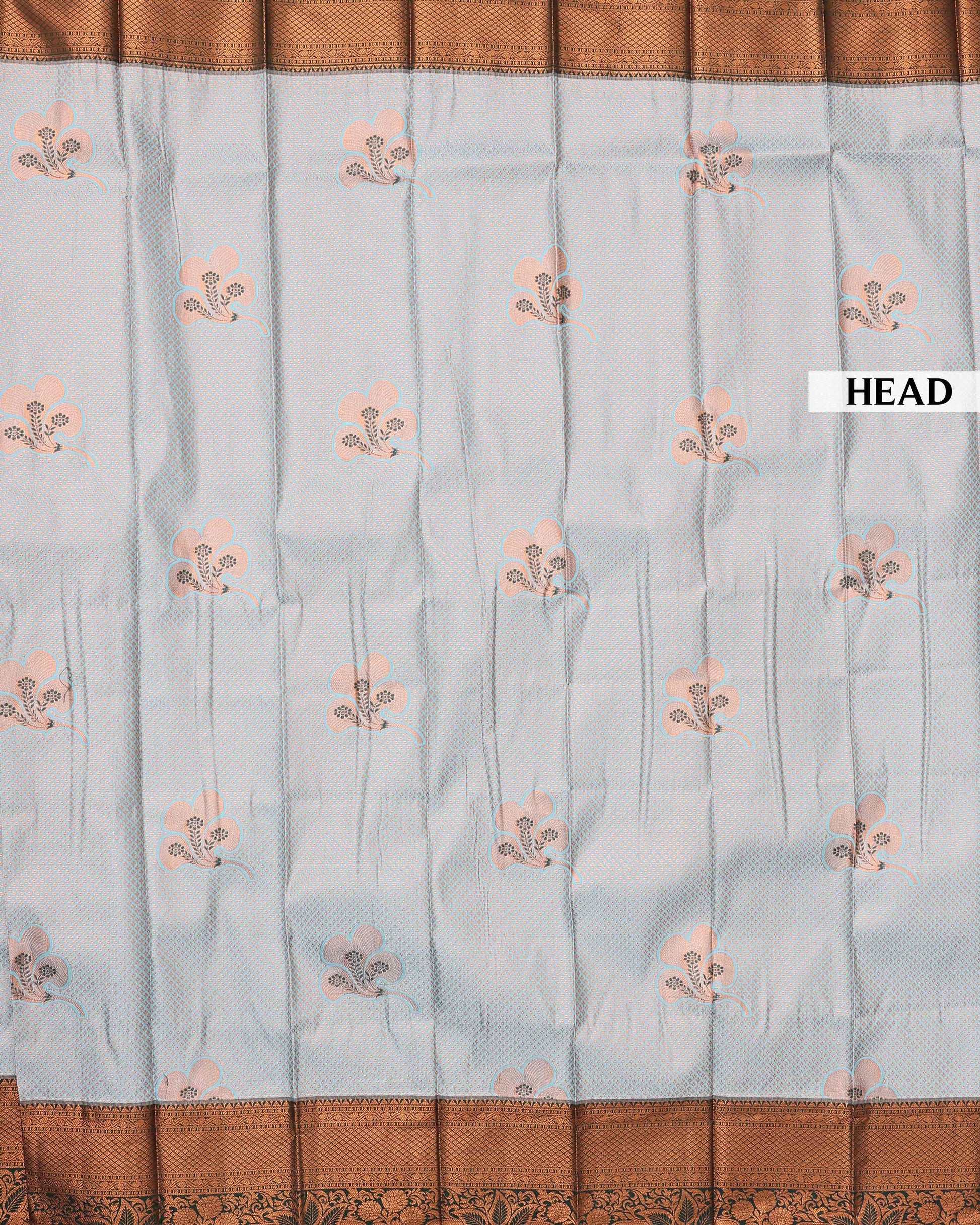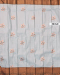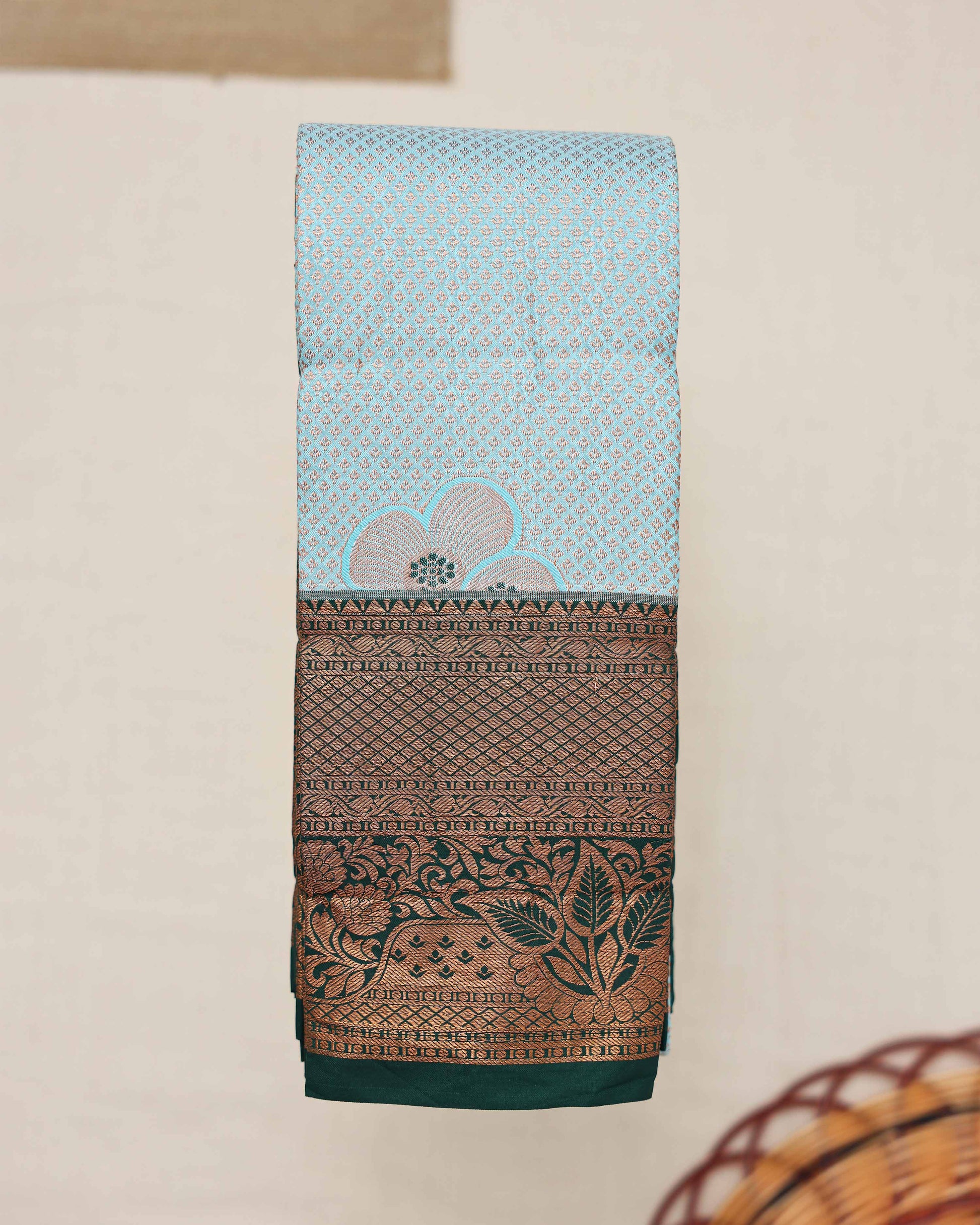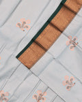 - This premium silk saree showcases a serene sky blue body with a subtle pattern, creating an elegant and sophisticated look.