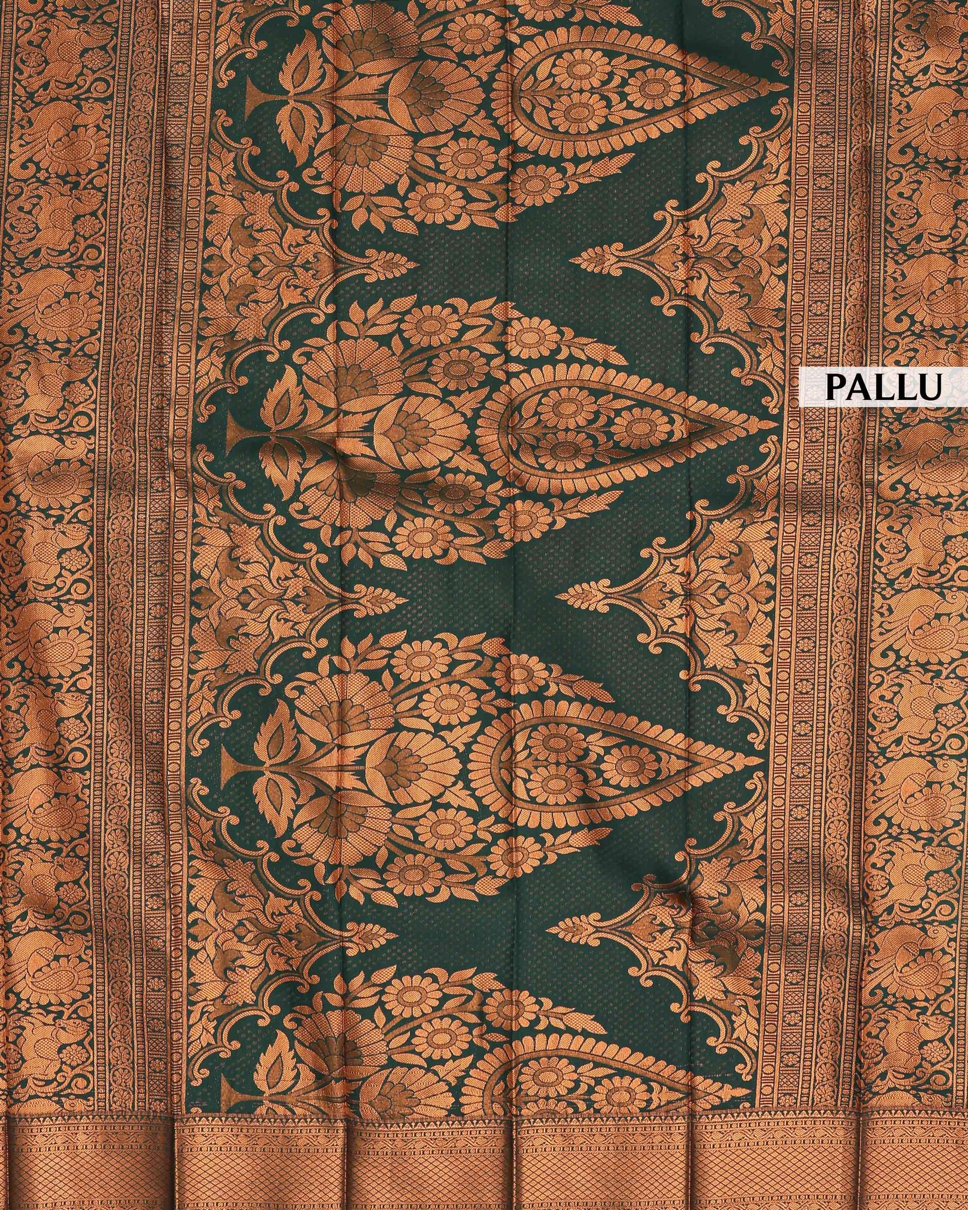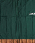 - The saree is beautifully complemented by a rich, dark green border featuring intricate zari work and traditional leaf motifs, perfect for special occasions.