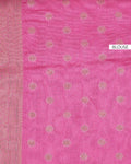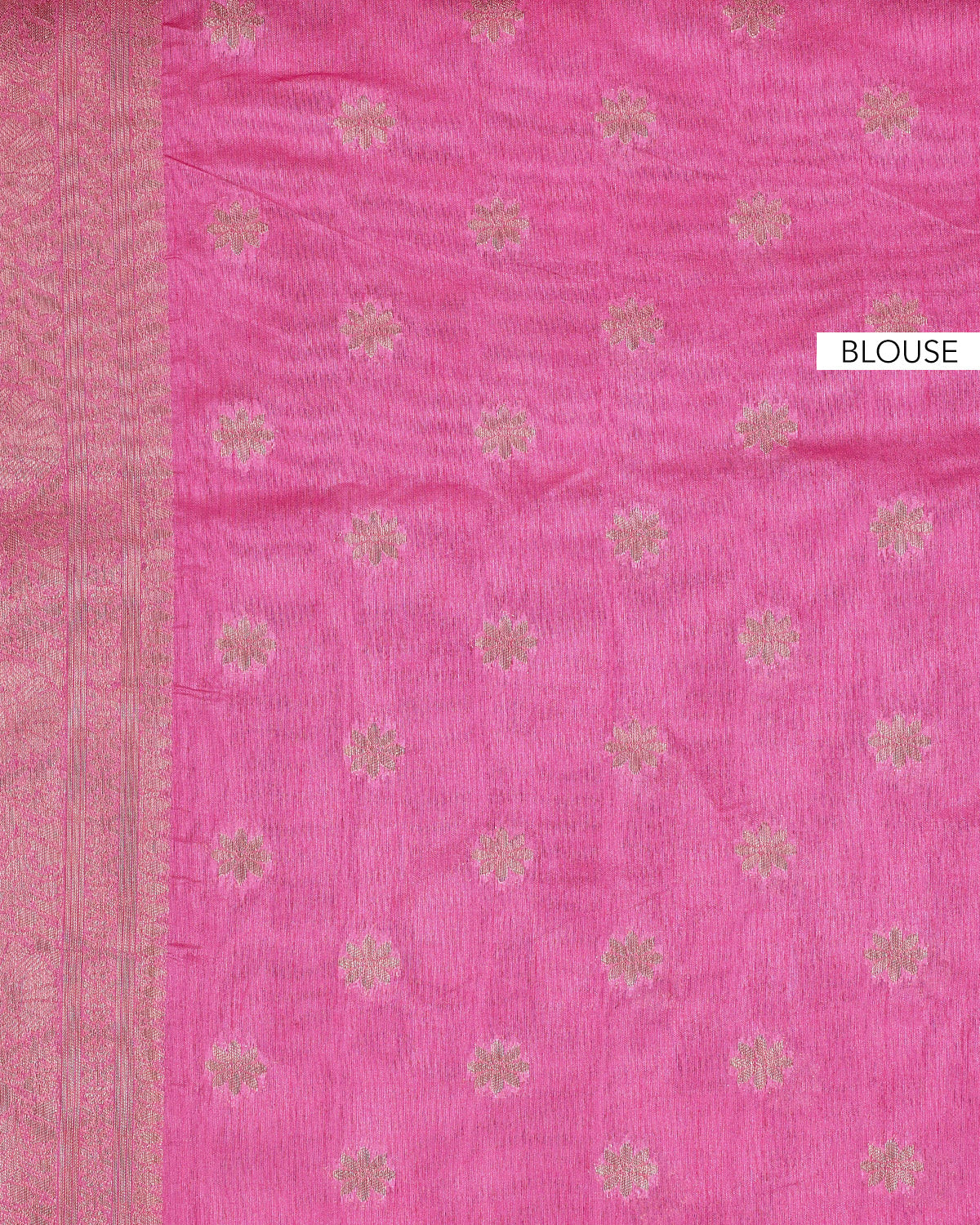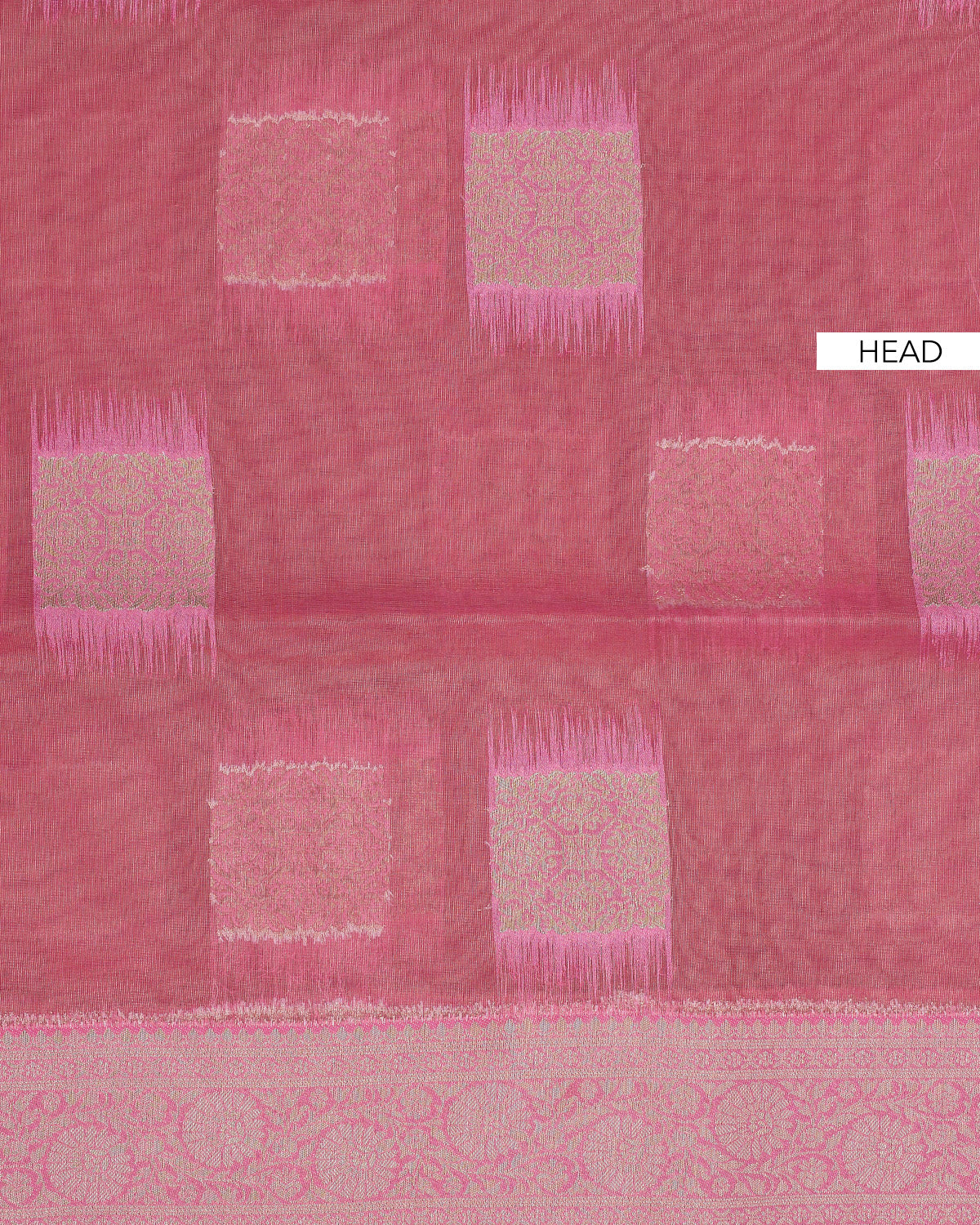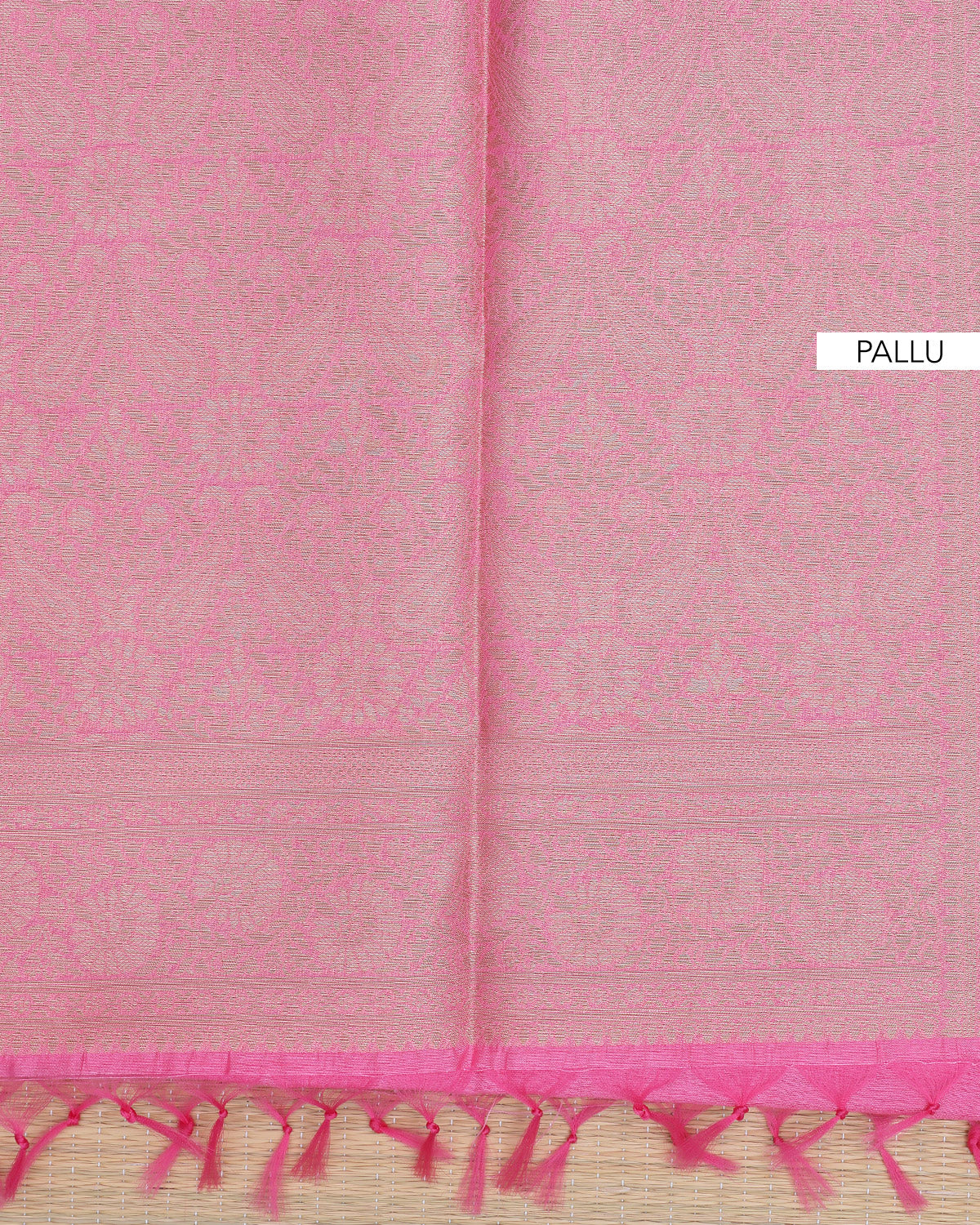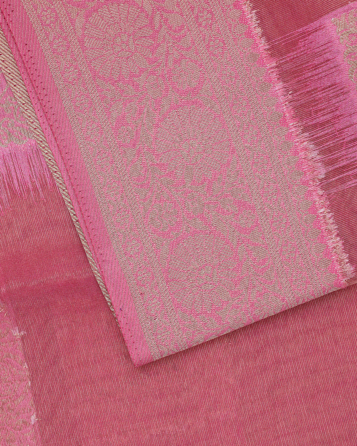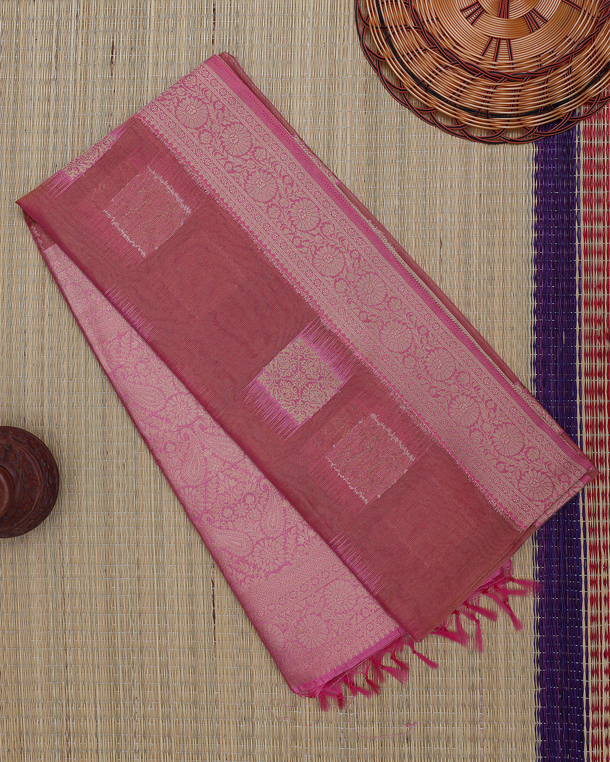 - This elegant tissue silk saree features a beautiful dusty rose hue, complemented by a contrast zari border with intricate floral and paisley motifs.