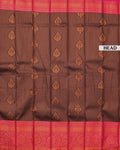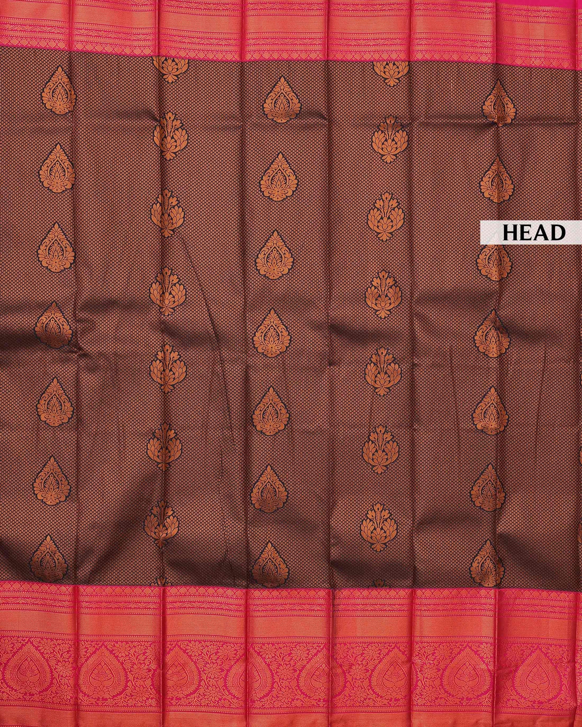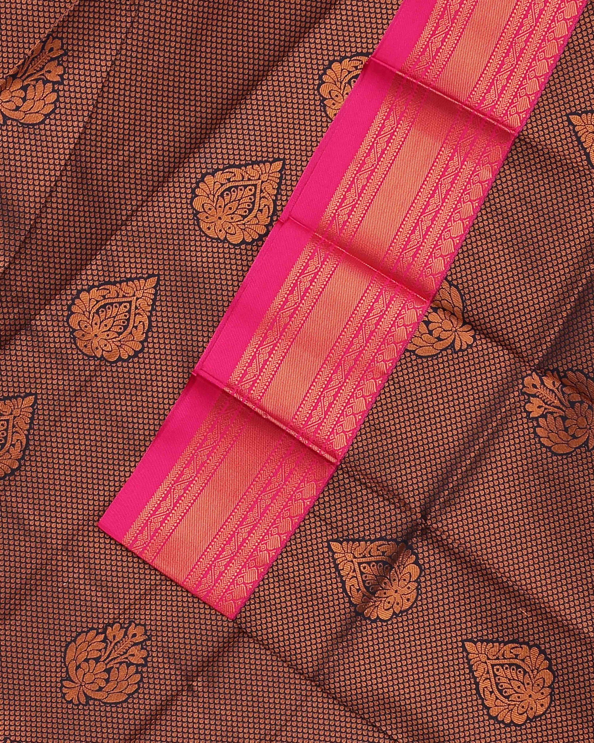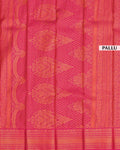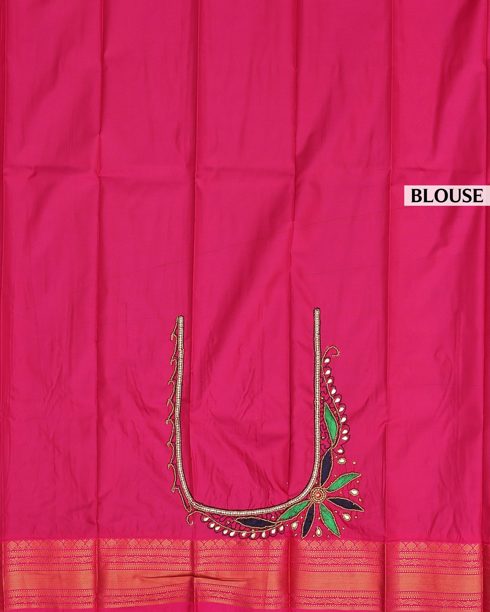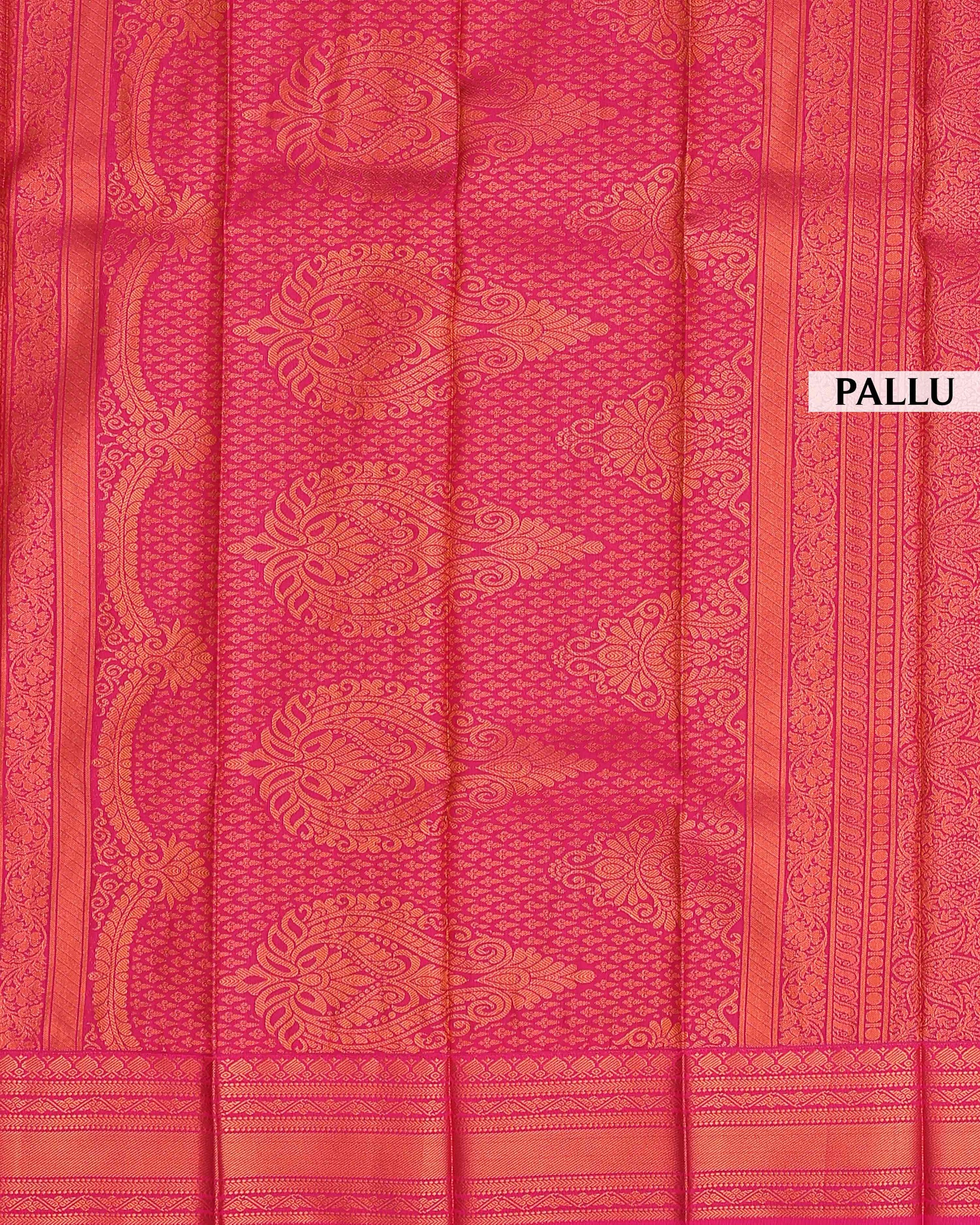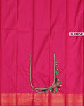 - This exquisite Premium silk saree a vibrant rani pink body with intricate gold zari work and a contrasting dark pallu