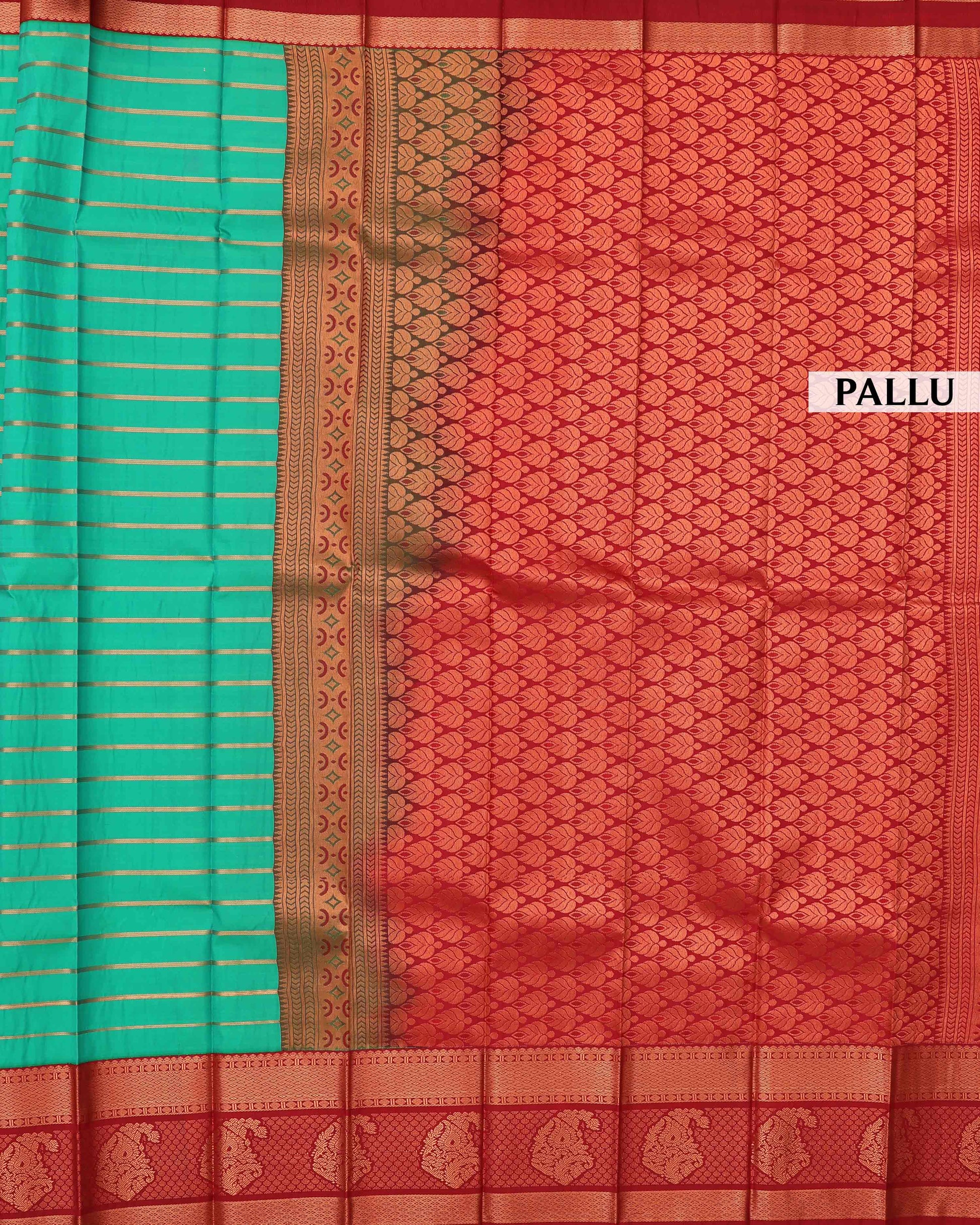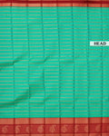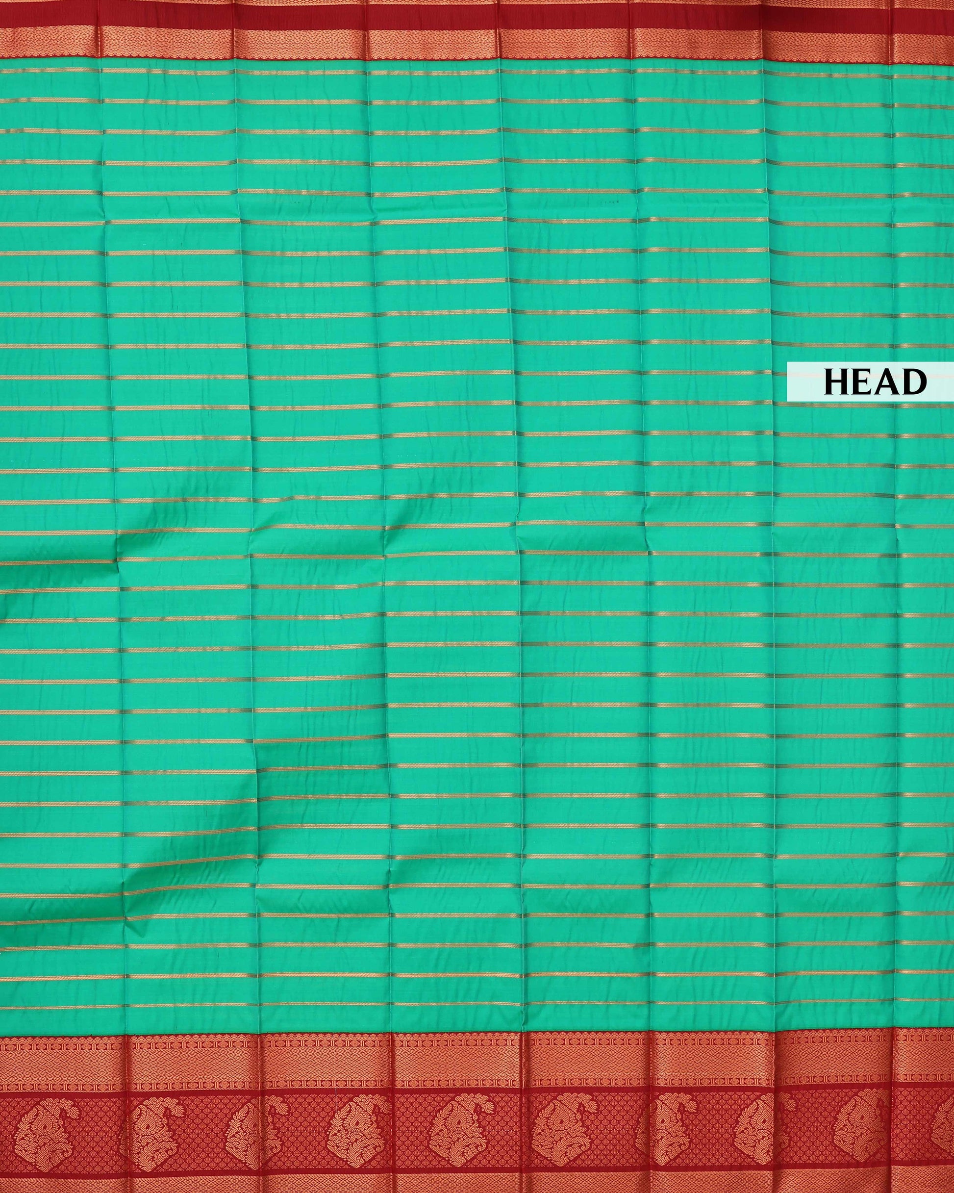 - This stunning premium silk saree a vibrant turquoise-green body with elegant gold zari stripes.