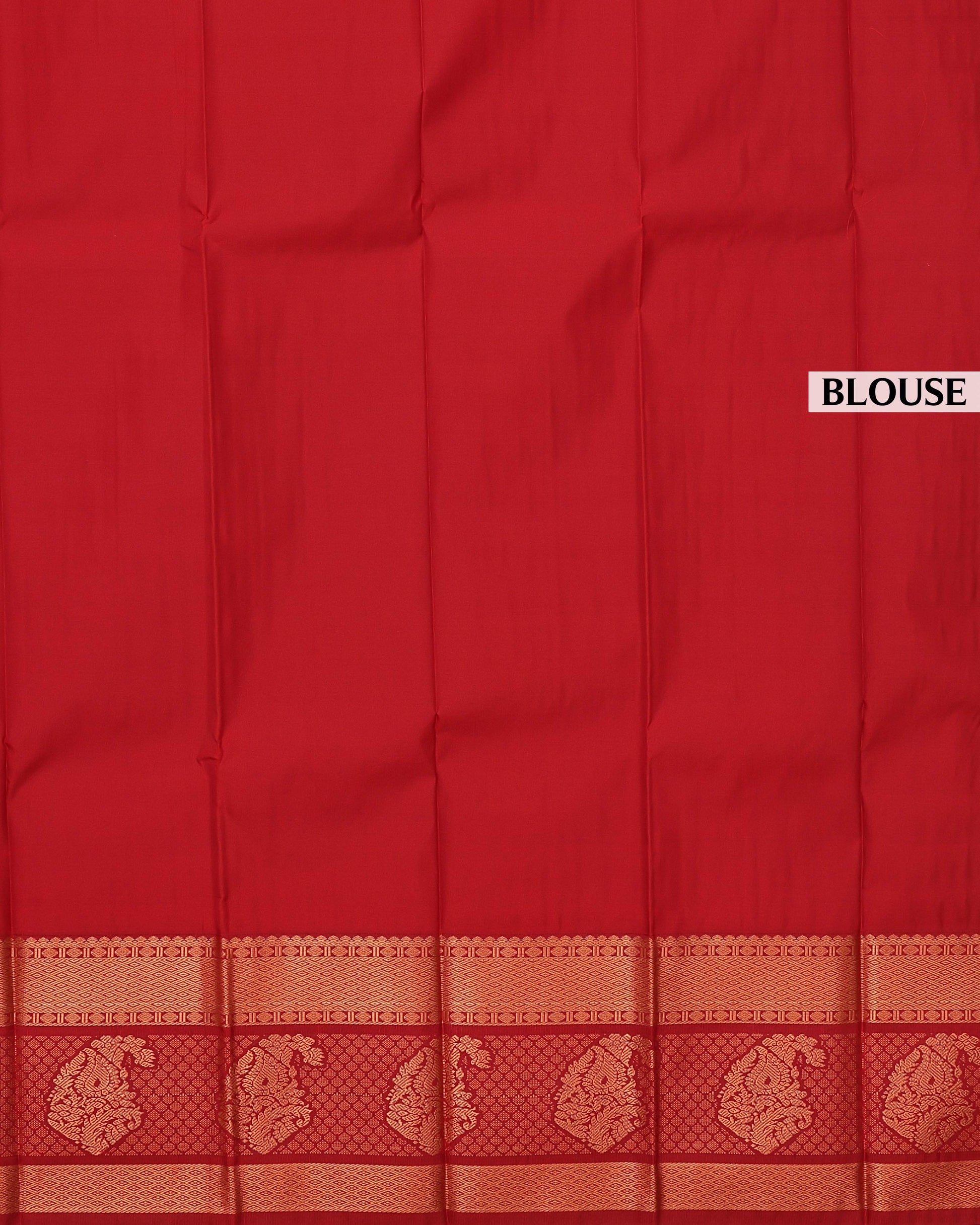 - The saree is beautifully contrasted with a rich maroon border and pallu, intricately woven with traditional gold brocade motifs, making it perfect for festive and special occasions.