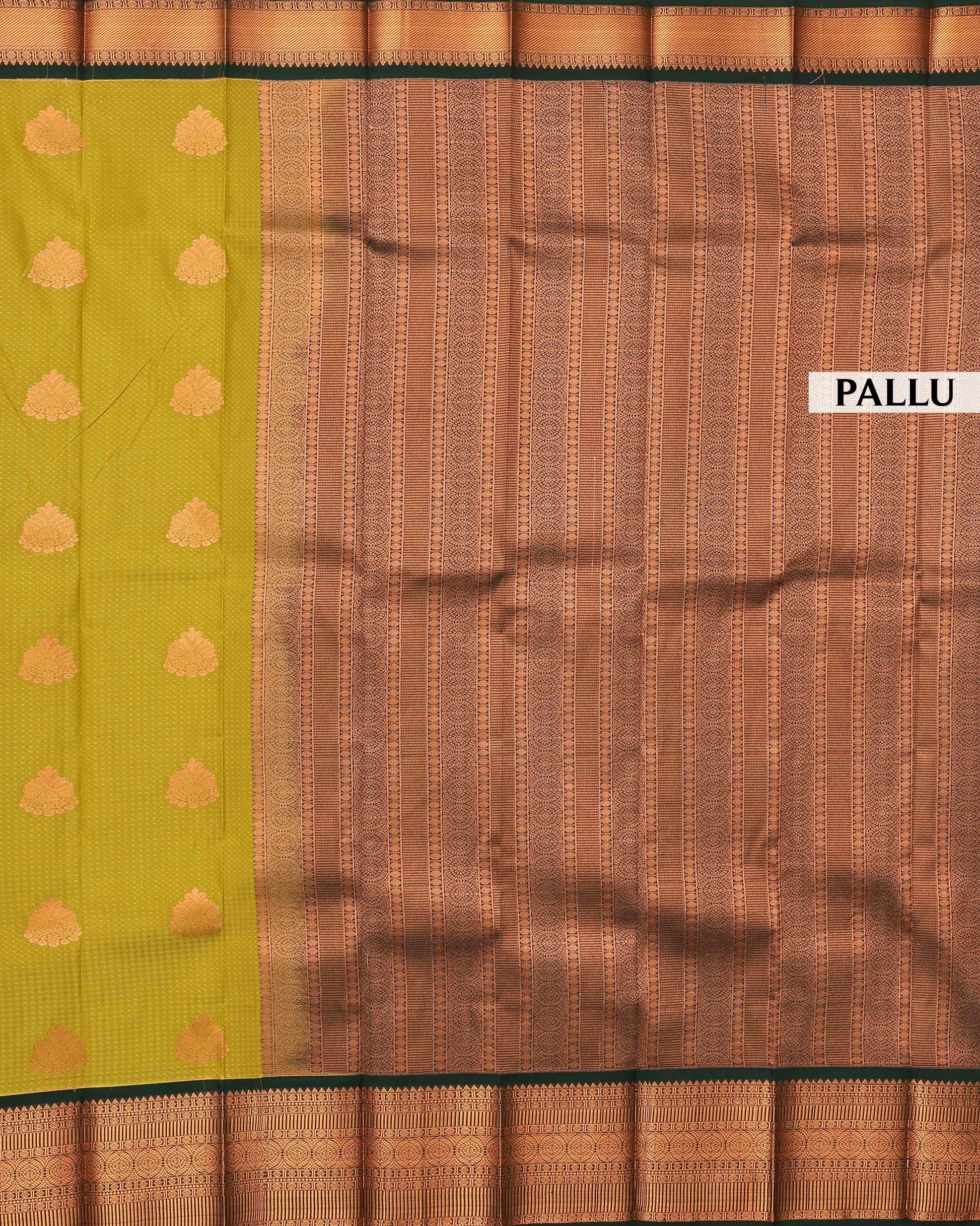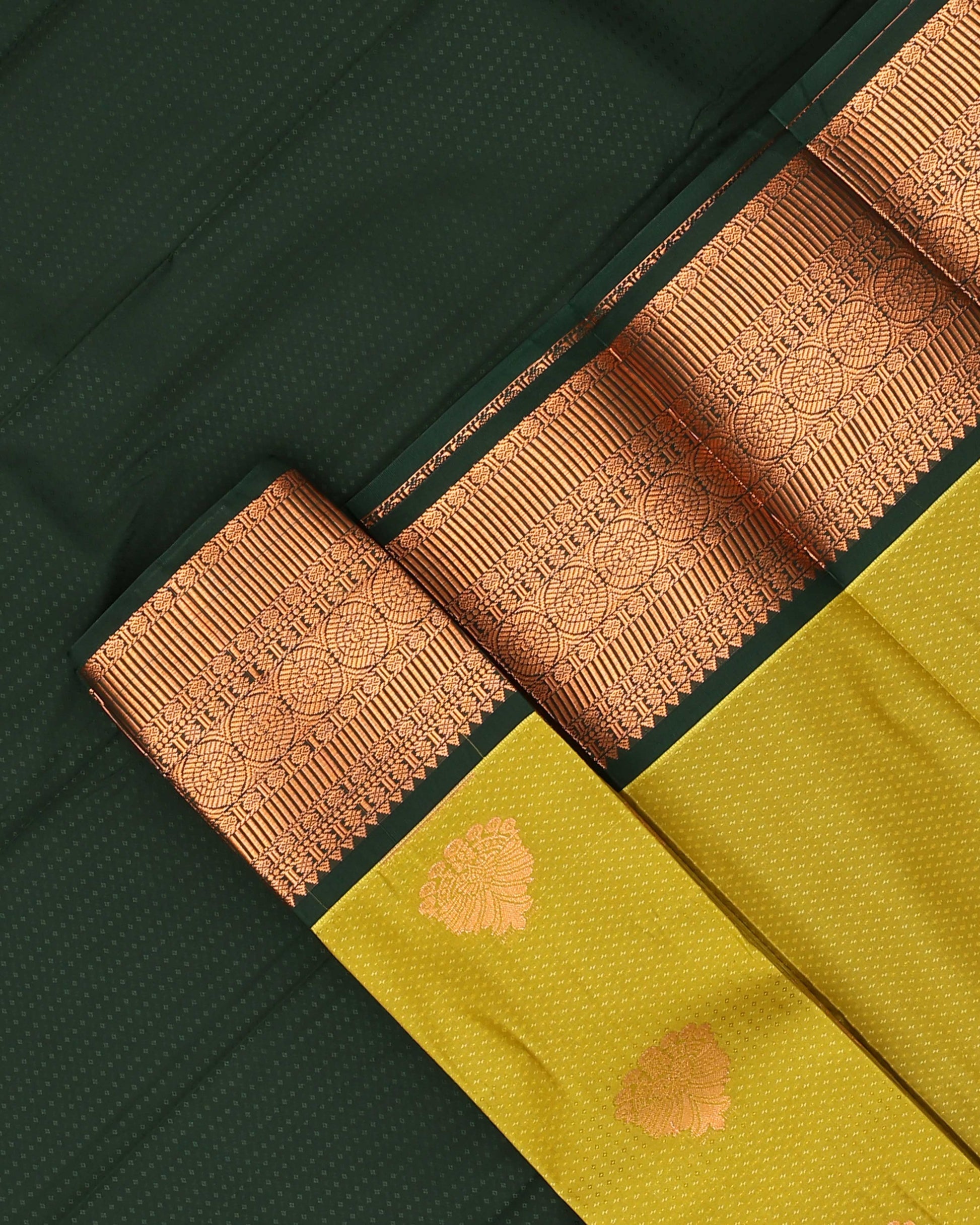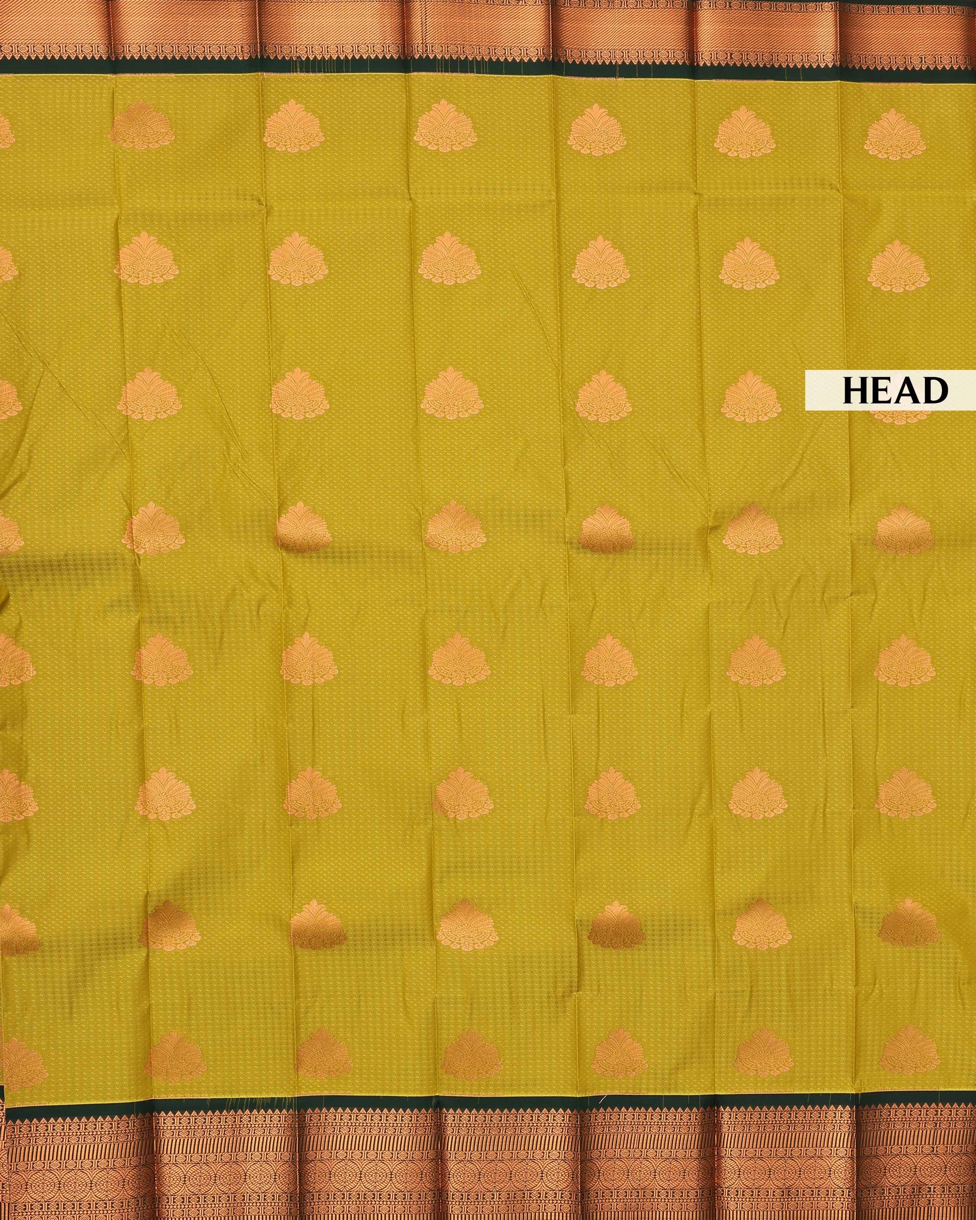 - a vibrant lime-green body with elegant gold zari buttas and a rich, contrast dark green border, this saree is perfect for weddings and festive occasions.