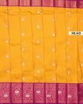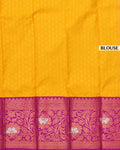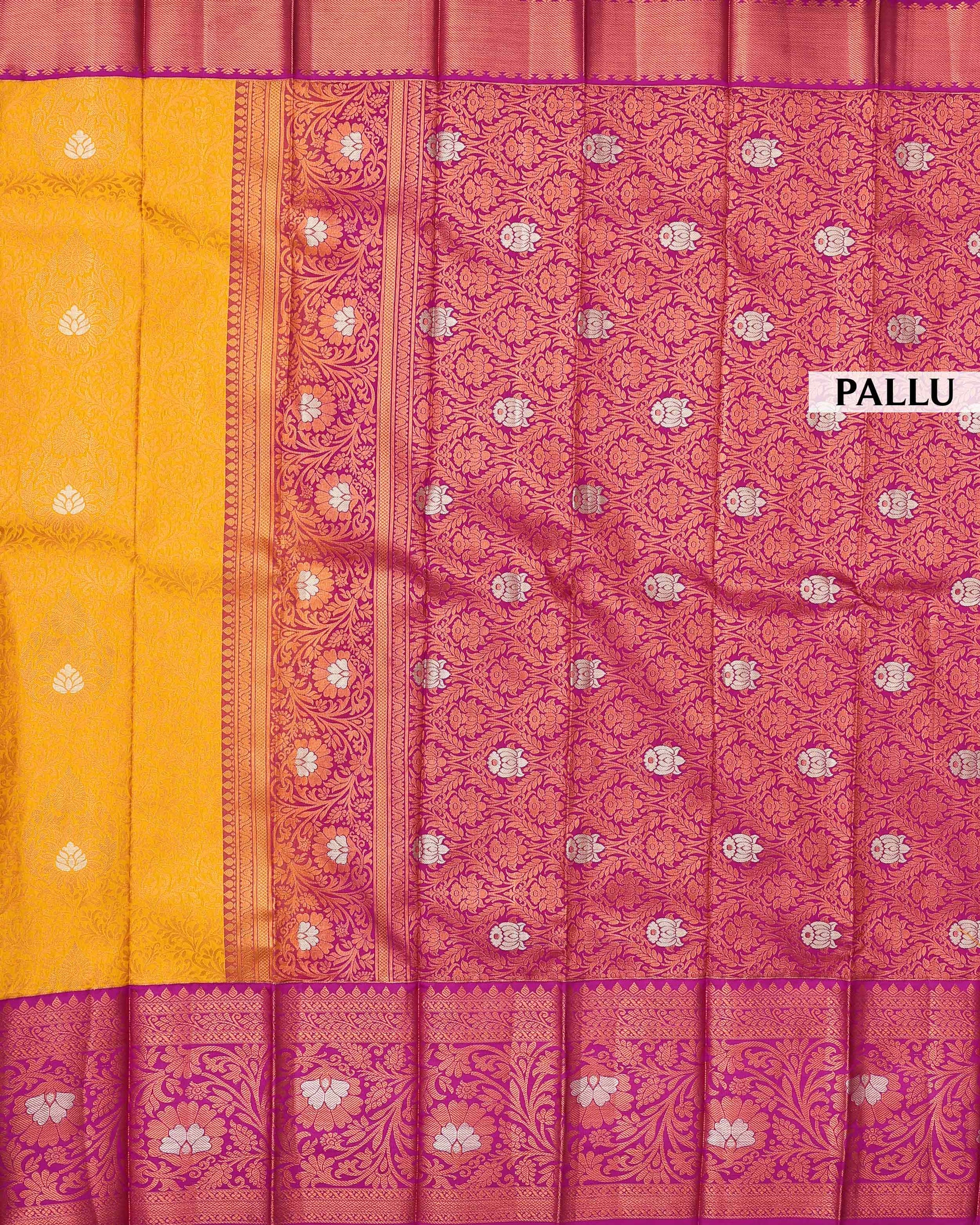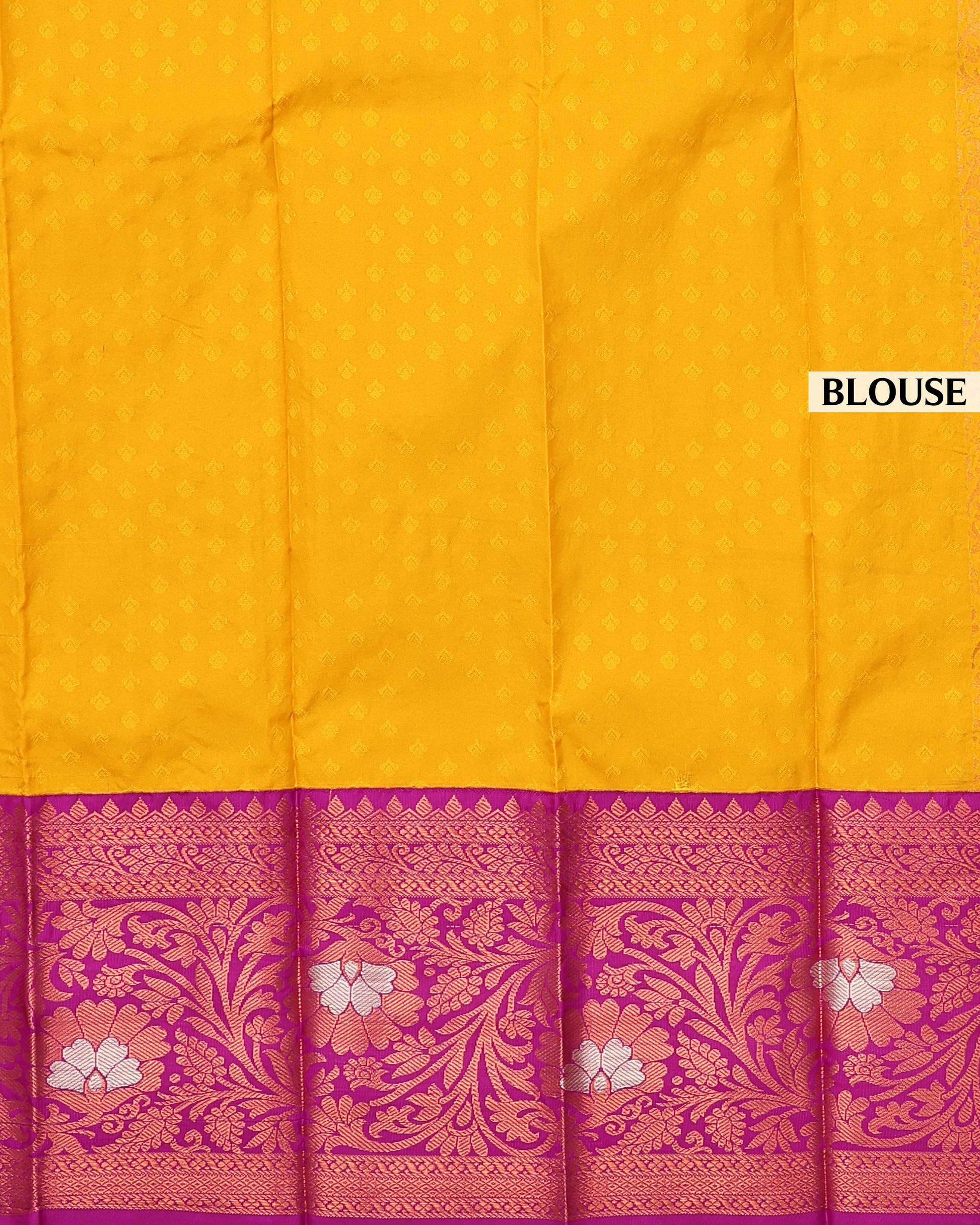 - This exquisite Kanchipuram silk saree a radiant mango yellow body with delicate brocade, complemented by a rich magenta border adorned with intricate floral zari motifs.