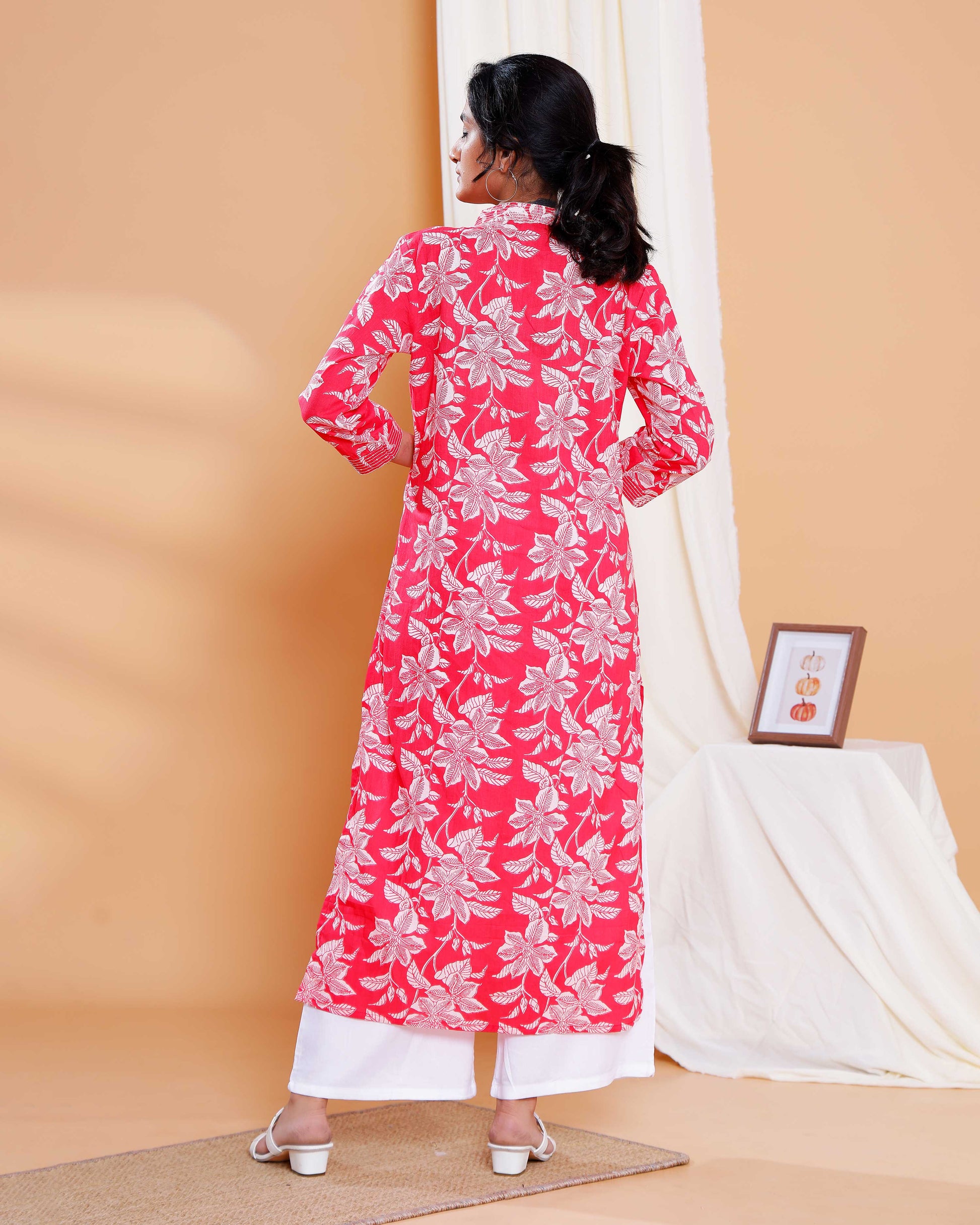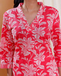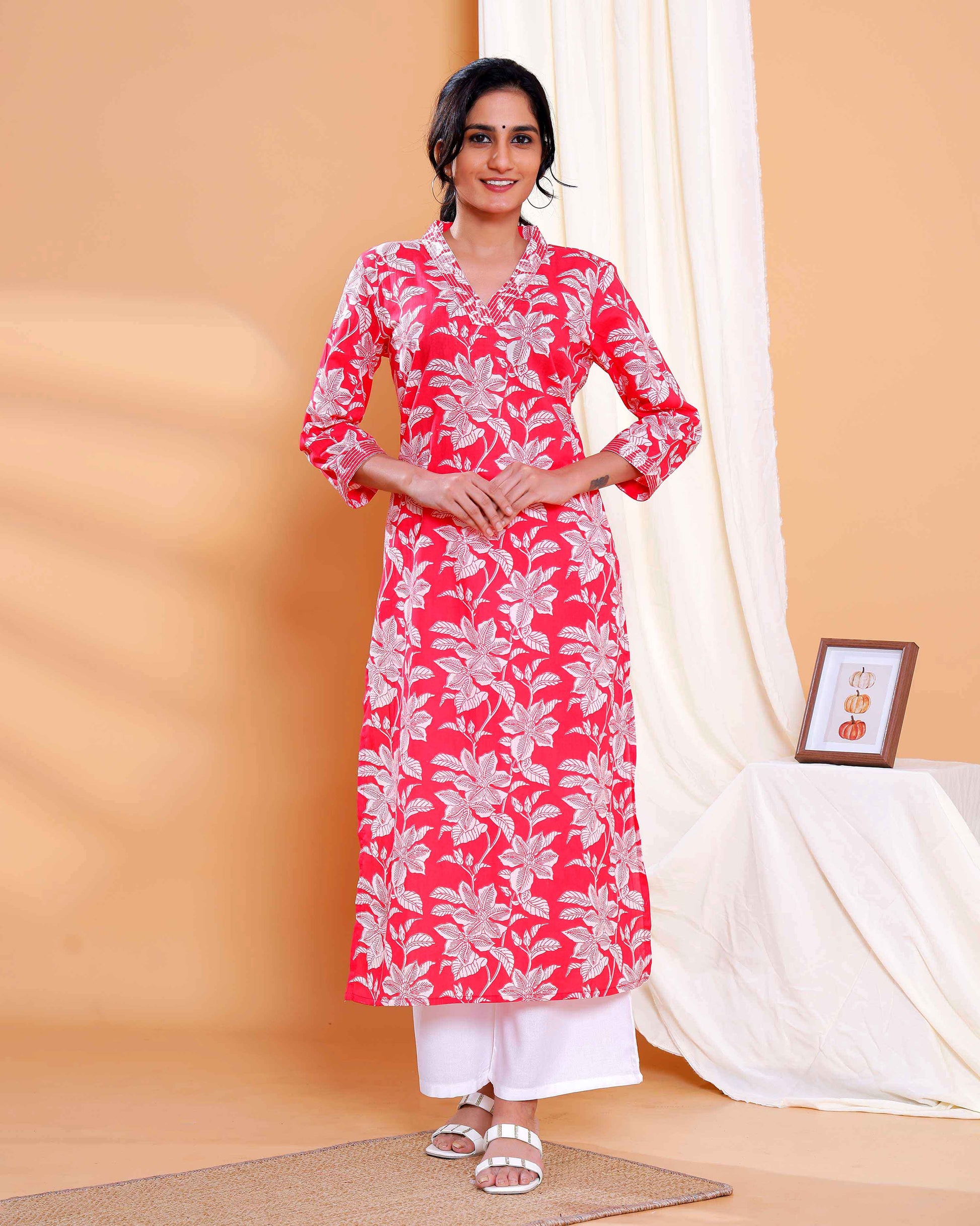 Print Straight Kurta with V-Neck and 3/4th Sleeves - Light Red