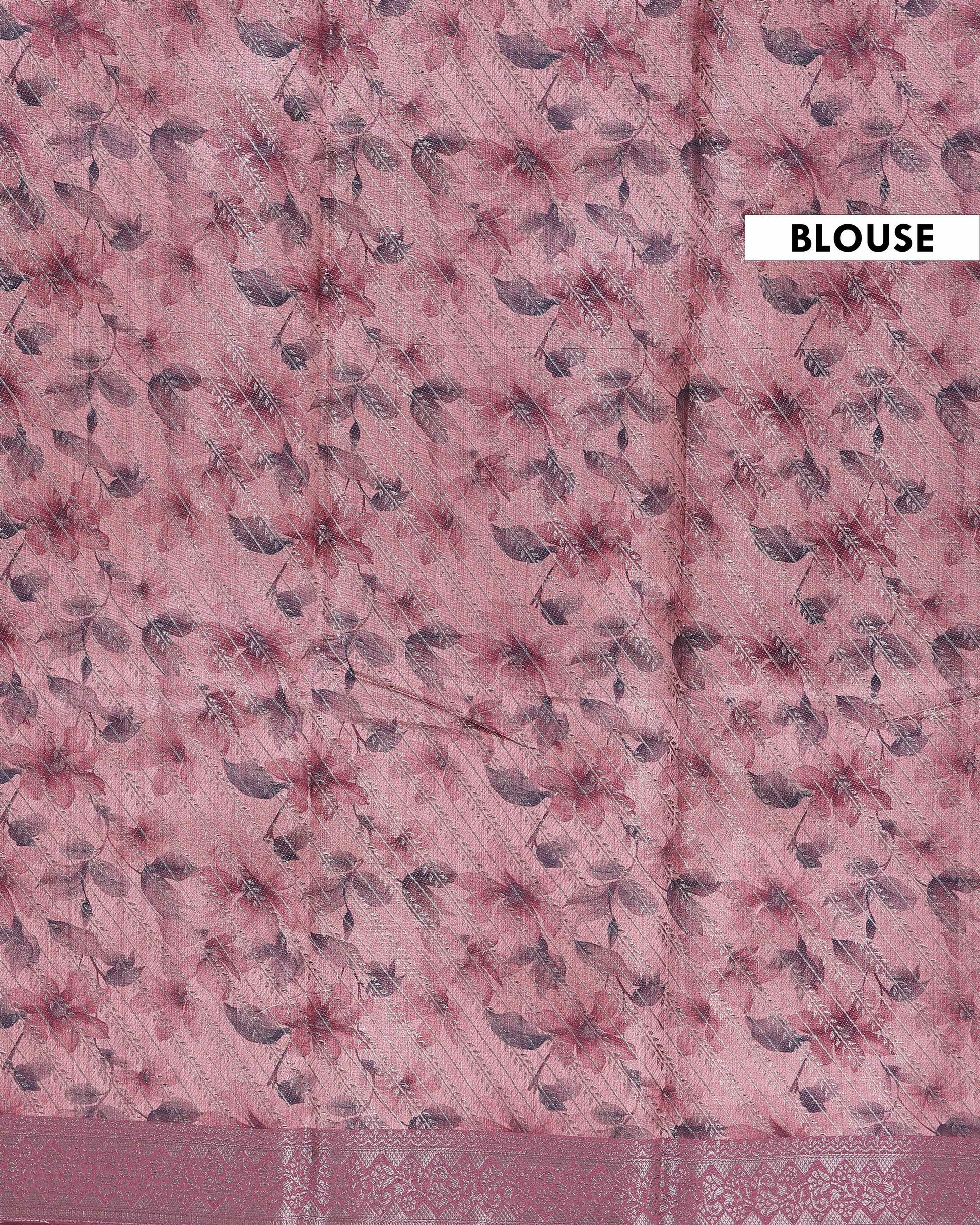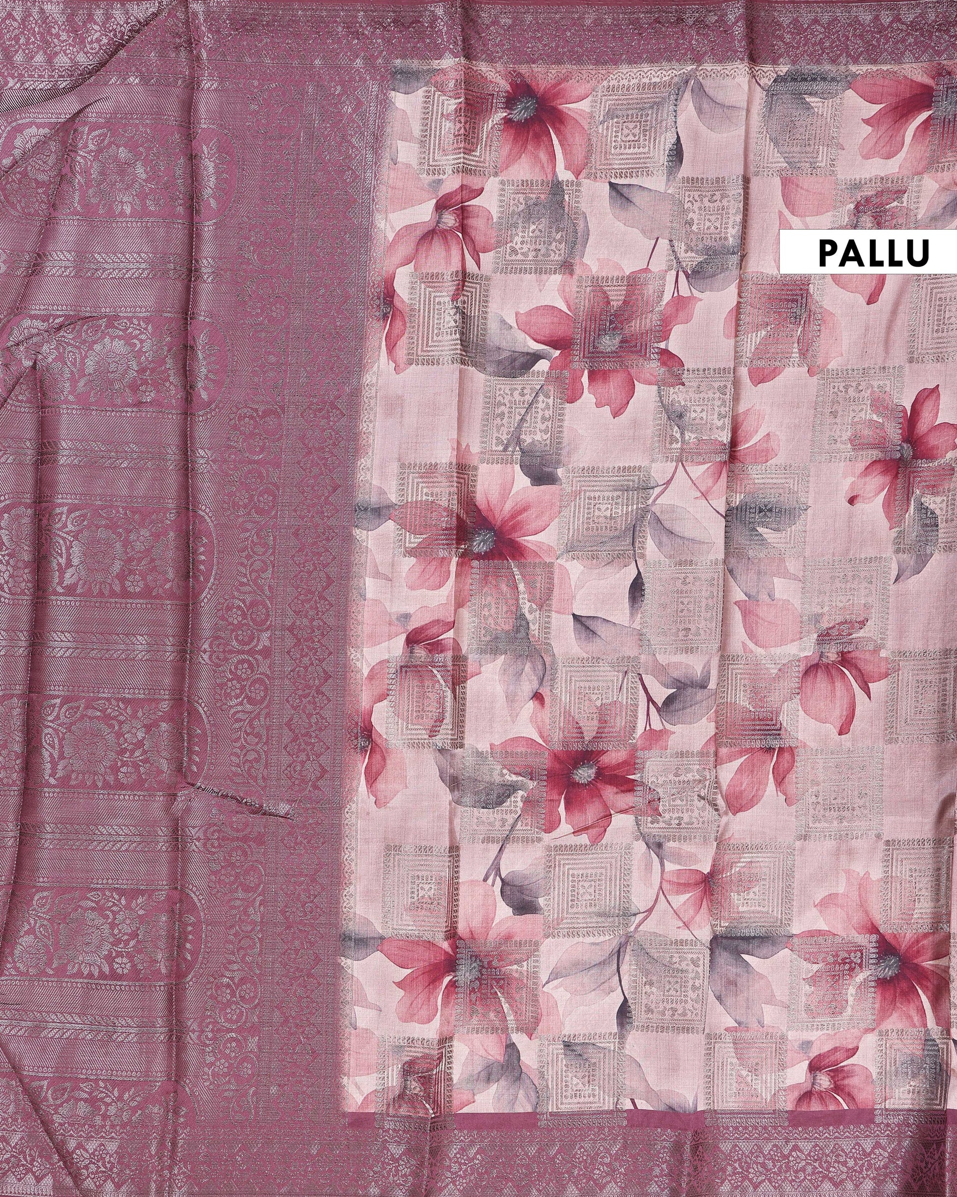 - This elegant Dola Silk saree a beautiful floral print in subtle grey tones perfect for a sophisticated look.