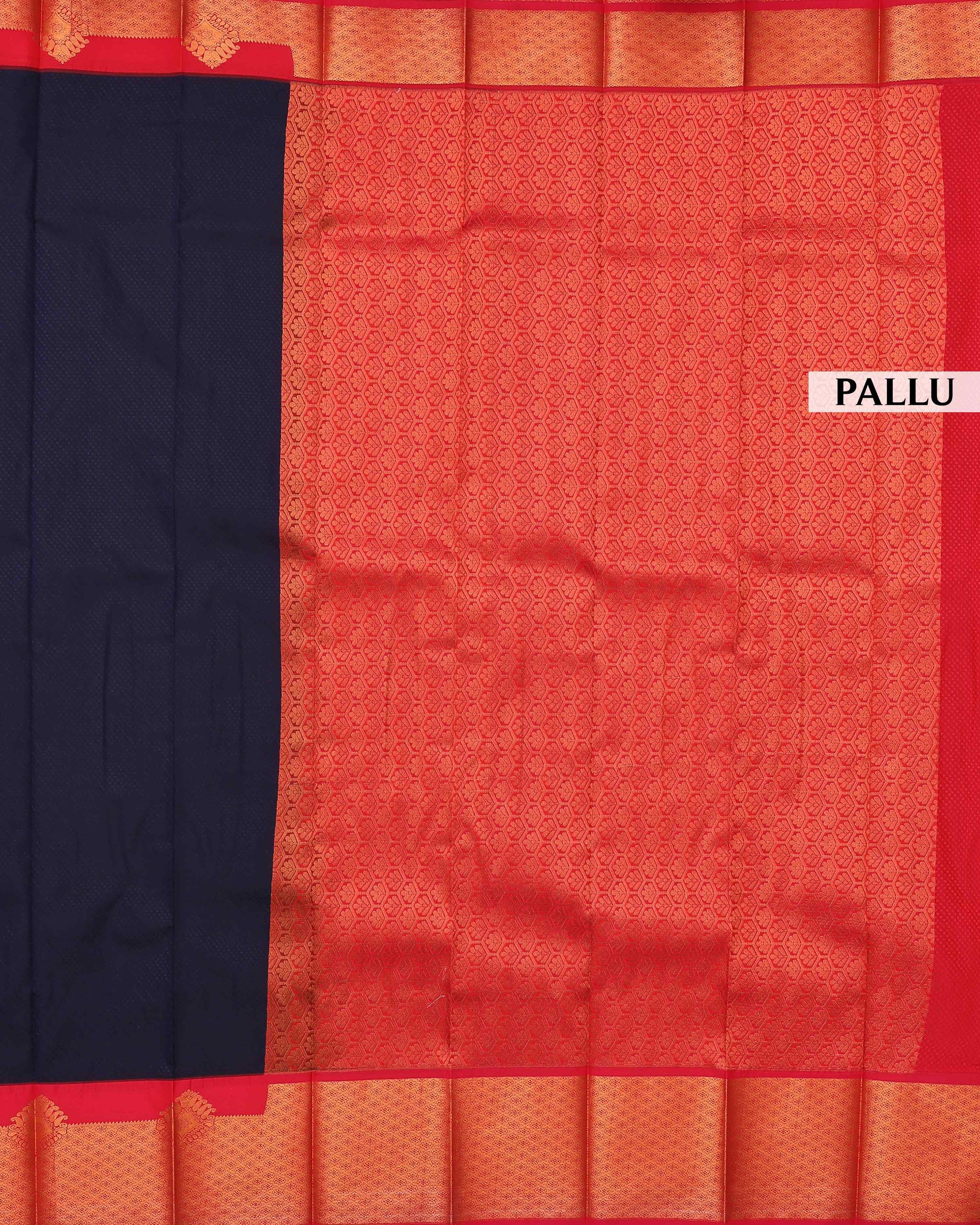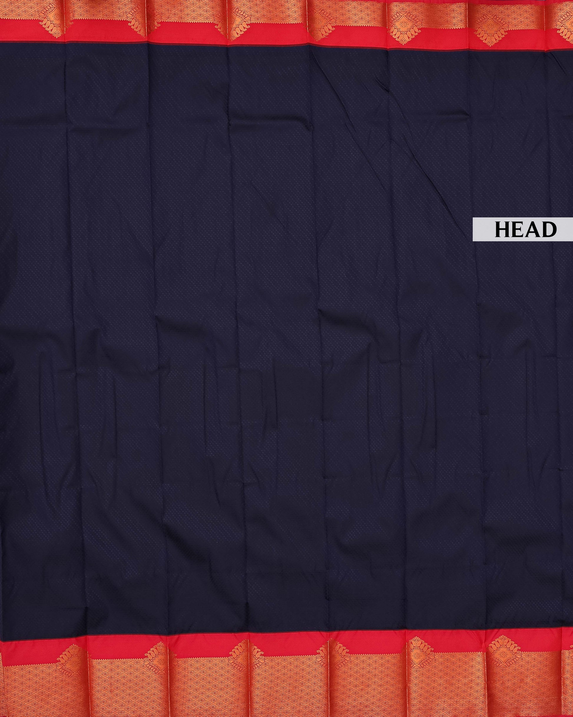 - Draped in a rich navy blue, this premium silk saree is a timeless classic