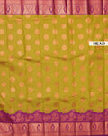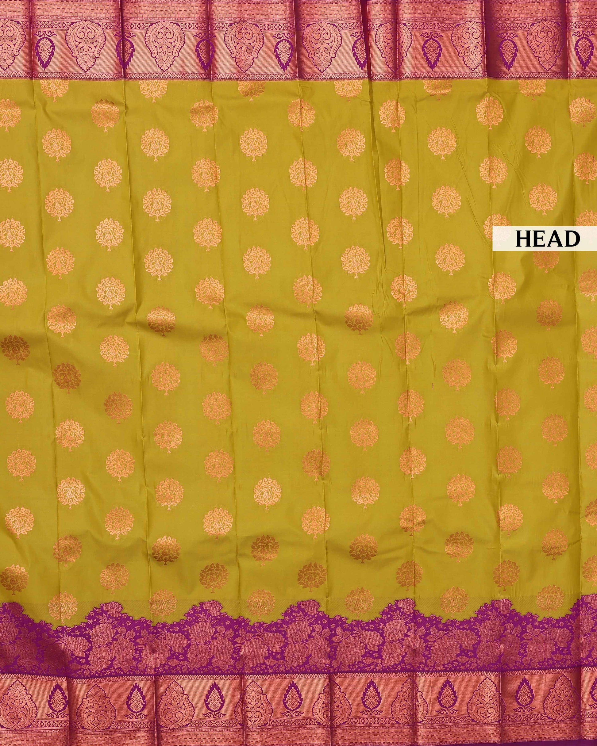 - This enchanting green Premium silk saree a contrasting purple border with traditional zari work, perfect for weddings and special occasions.