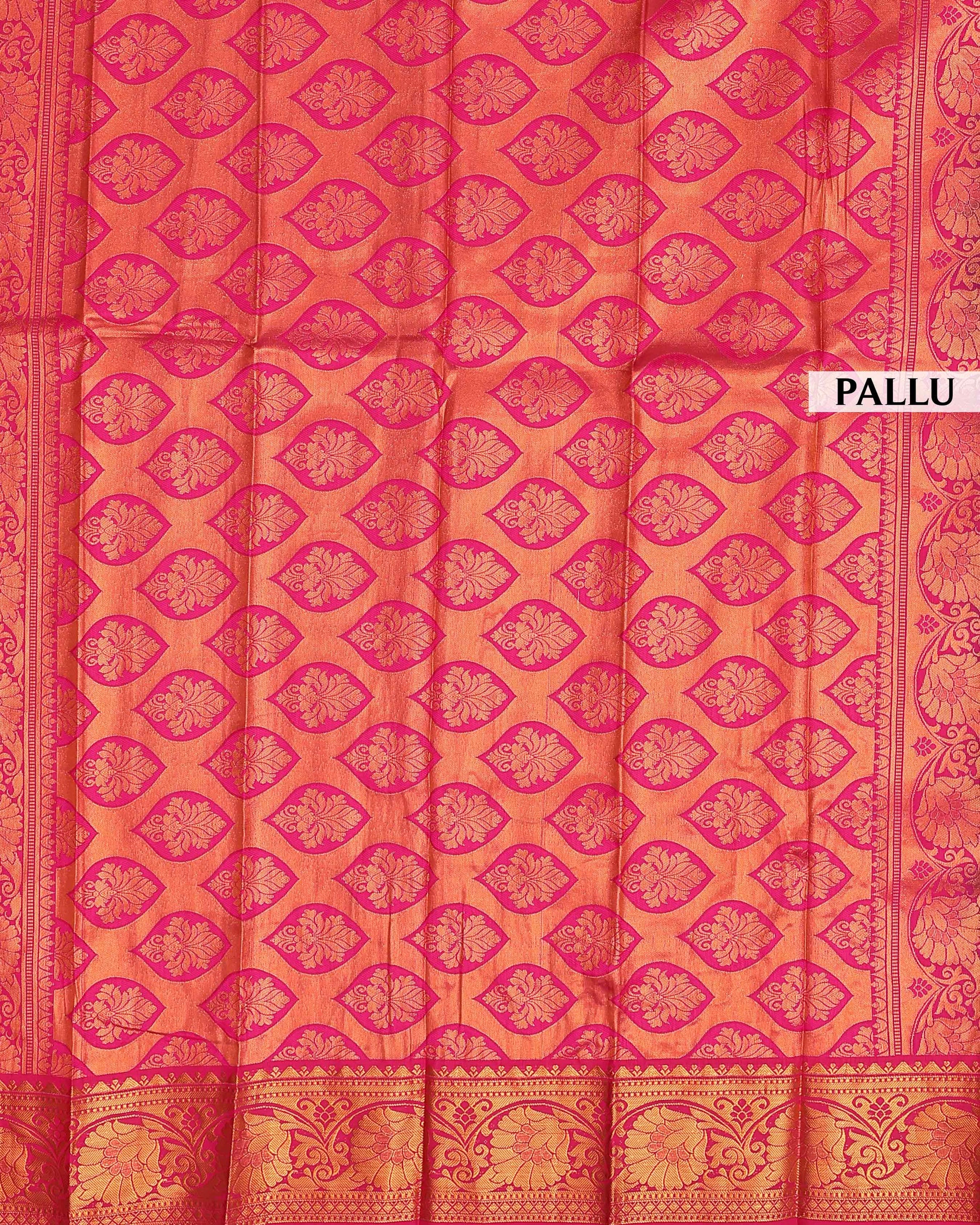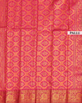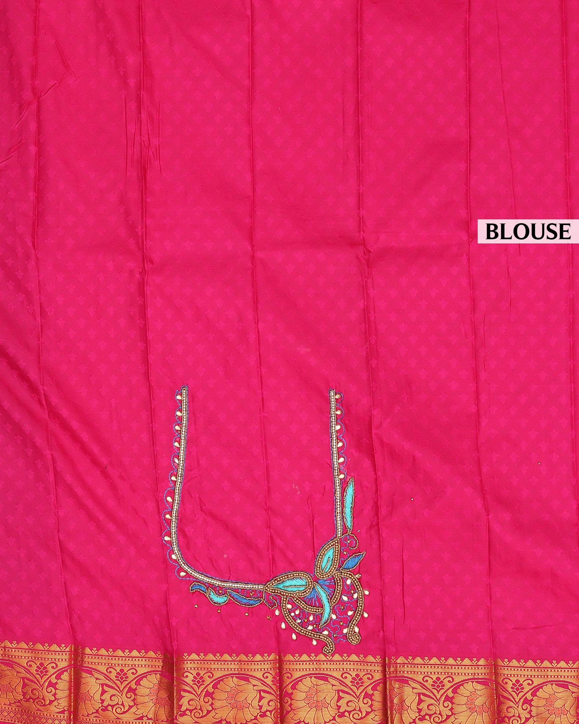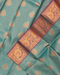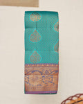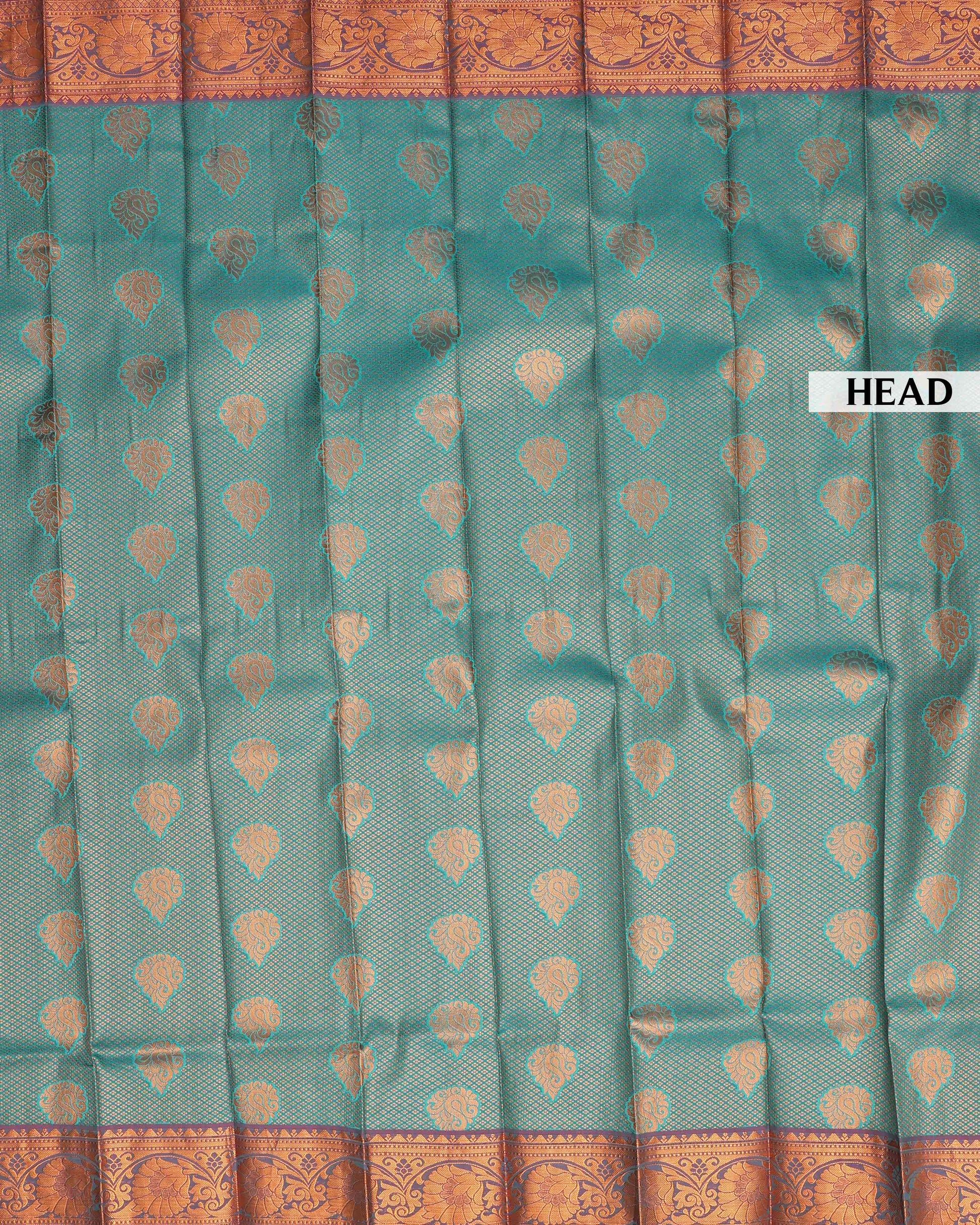 - This exquisite Premium silk saree a stunning peacock blue body with intricate gold zari motifs and a contrast border