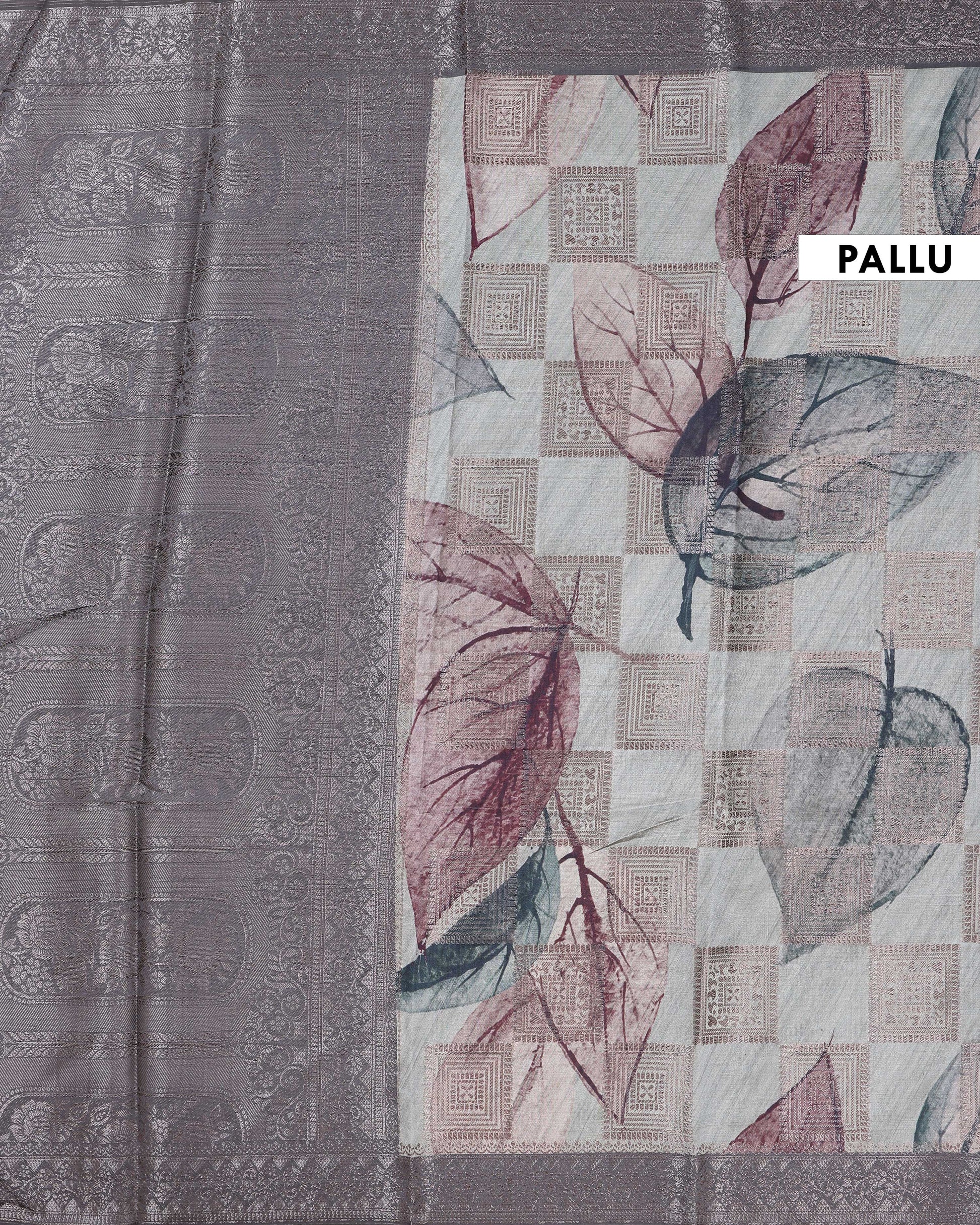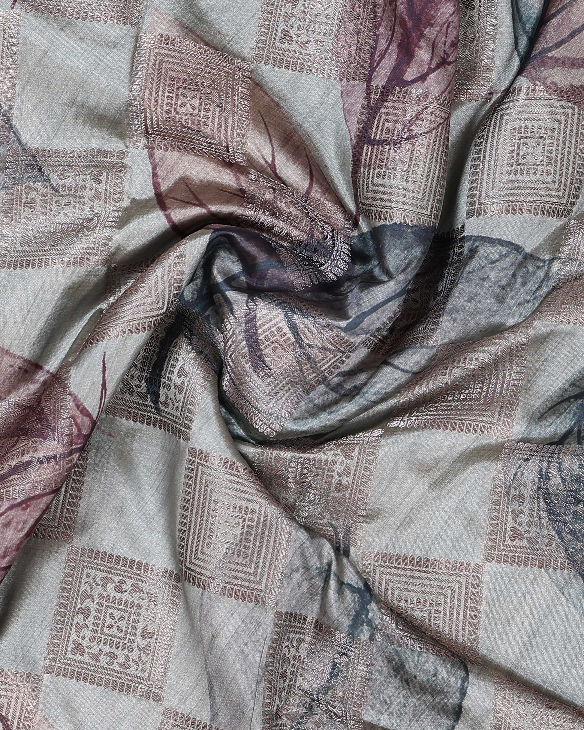 - Elevate your wardrobe with this stunning multicolor Dola silk saree a beautiful digital print and an intricately woven border.