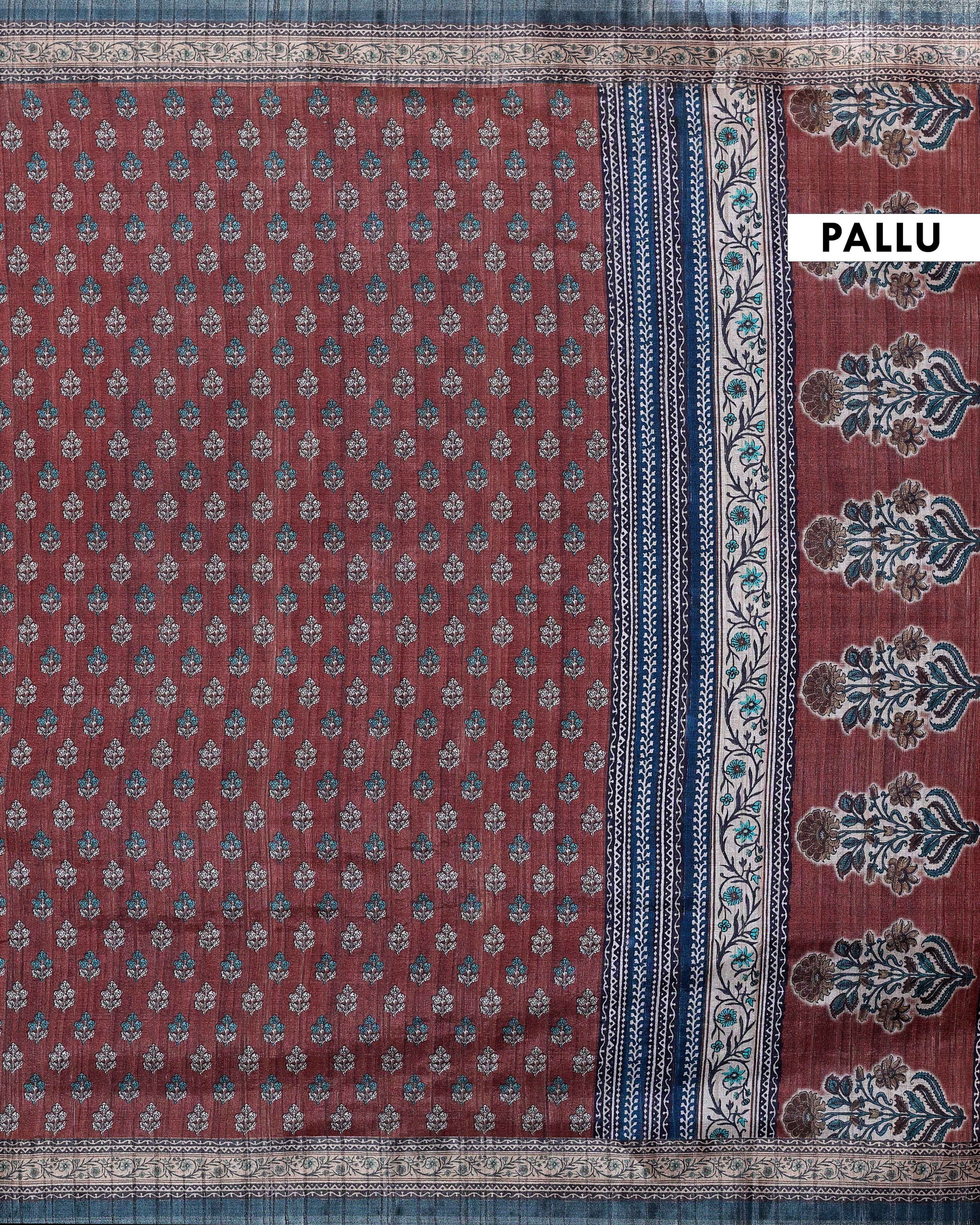 - This exquisite art silk saree features a rich reddish-brown body adorned with delicate floral buti motifs