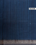The saree is elegantly framed by a contrasting blue border with intricate traditional patterns, making it perfect for festive and special occasions