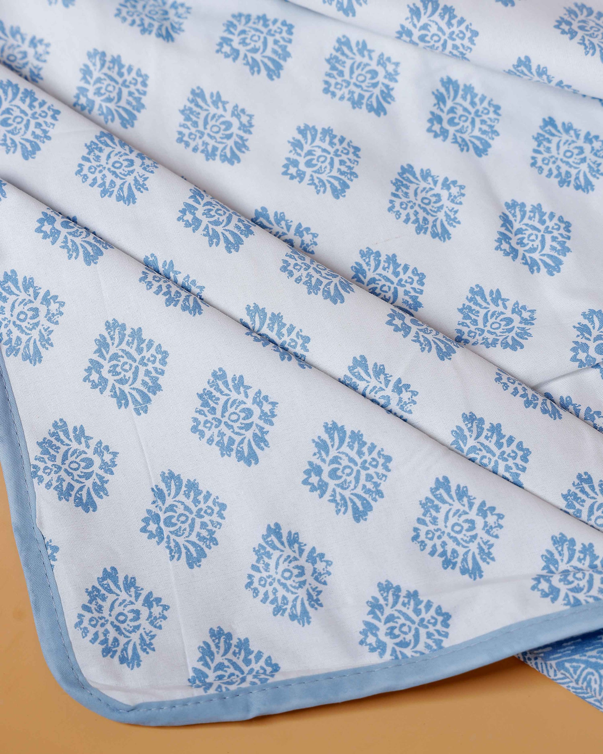 Reversible Cotton Double Quilt with Tribal Block Print and Floral Motifs - Blue