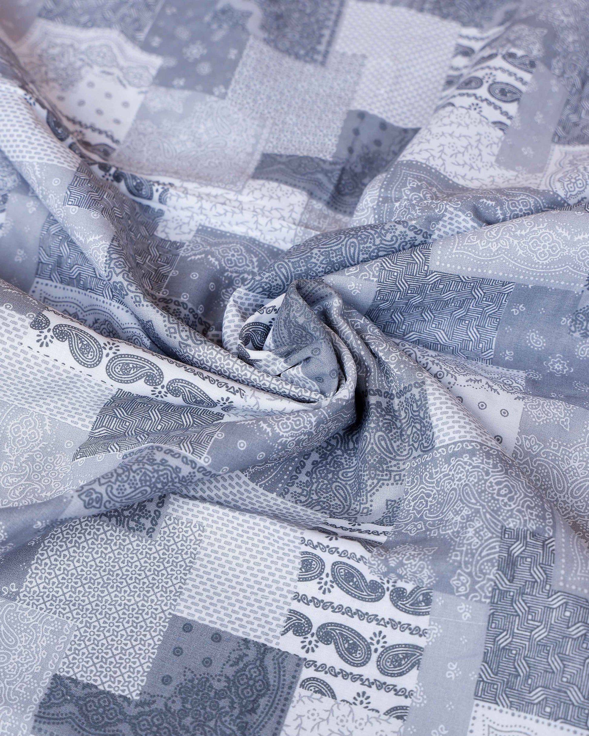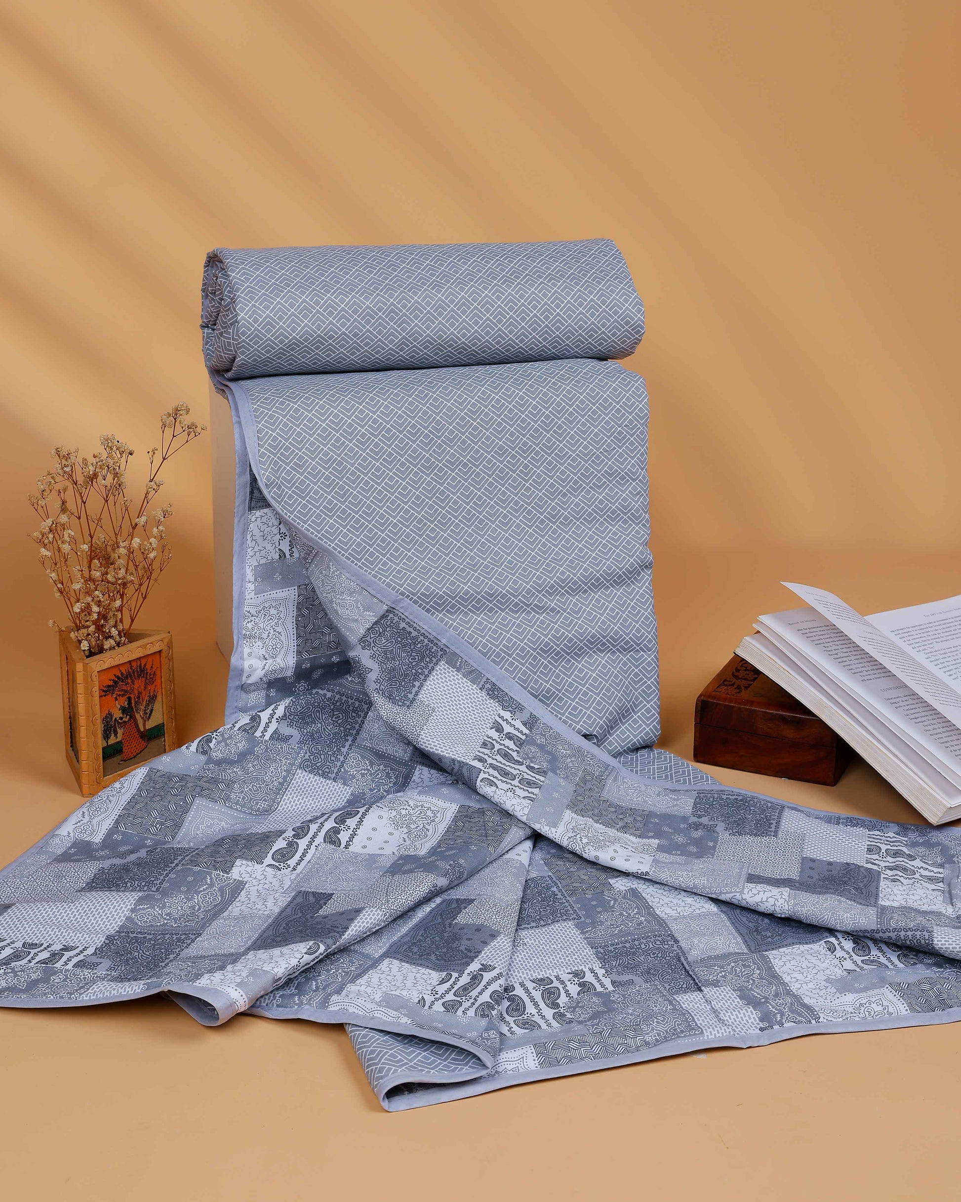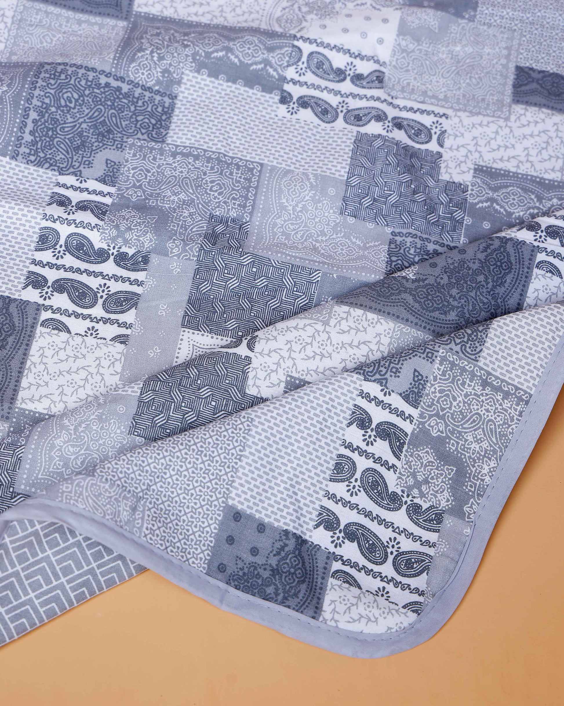 Reversible Patchwork Printed Cotton Double Quilt with Geometric and Paisley Designs - Grey