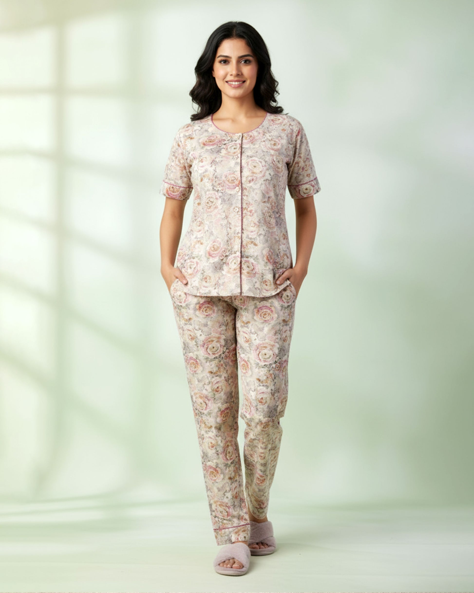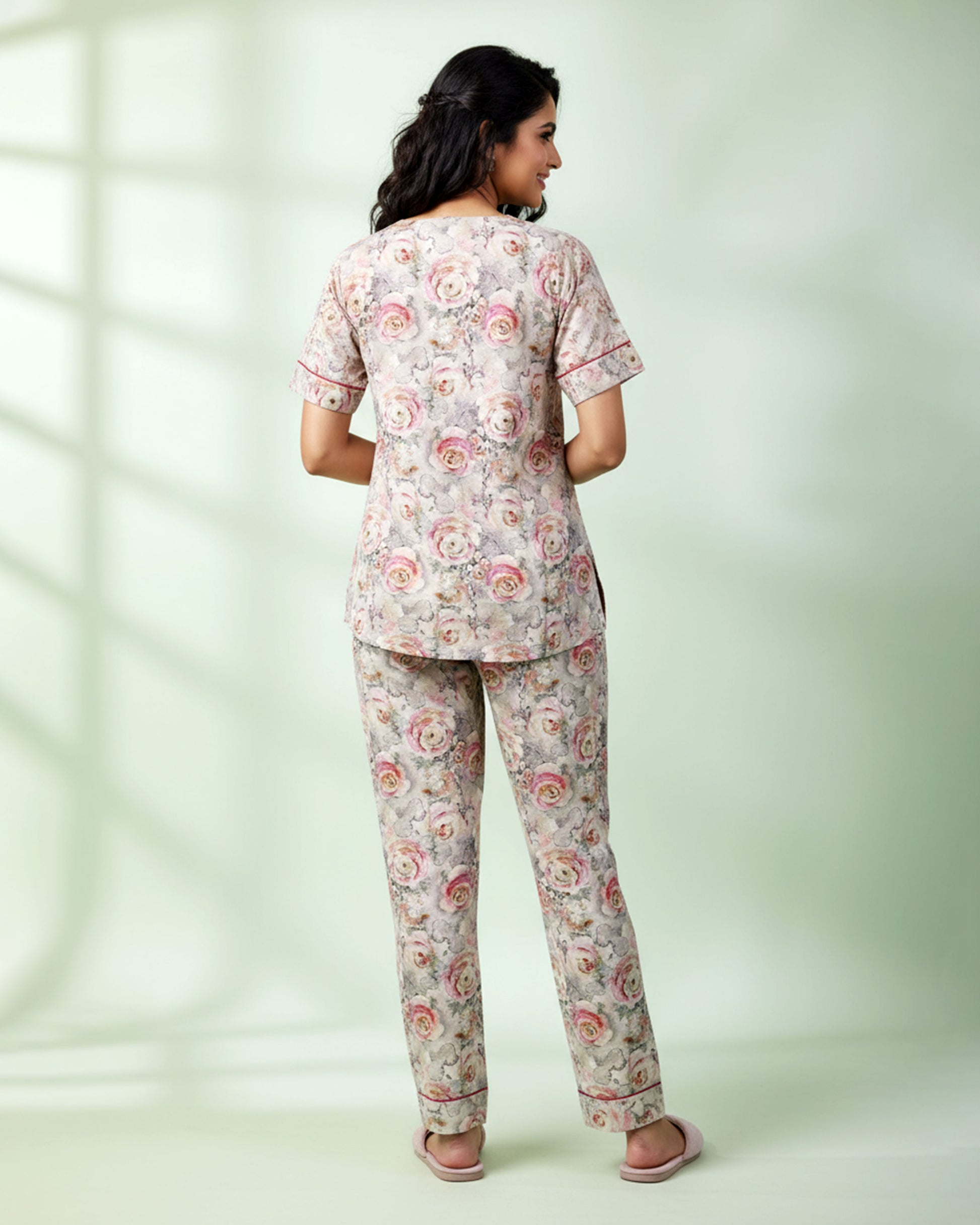 Women's Floral Print Short Sleeve Night Wear - Sandal