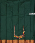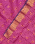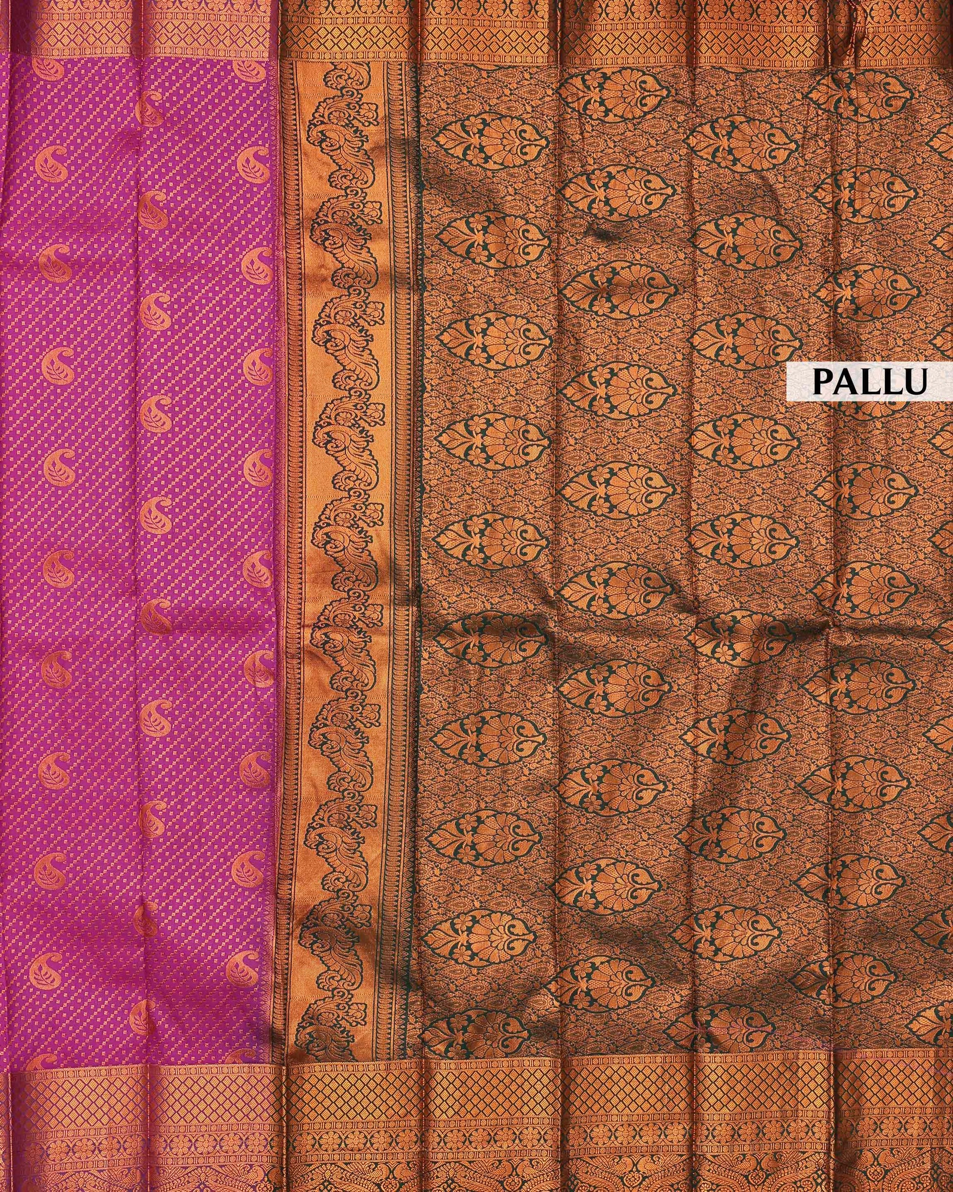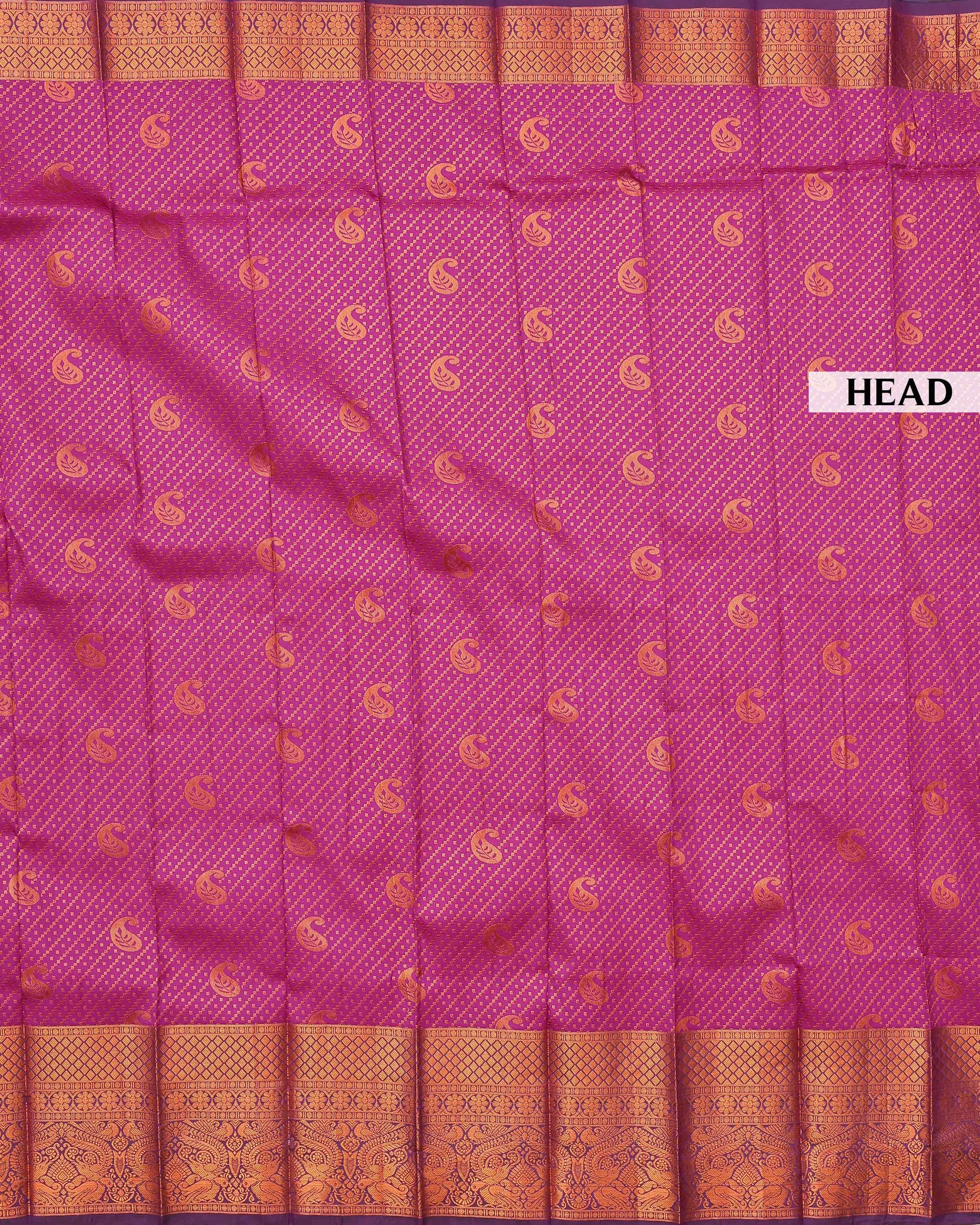 - This magenta Premium silk saree intricate copper zari work with traditional peacock and floral motifs on the border.