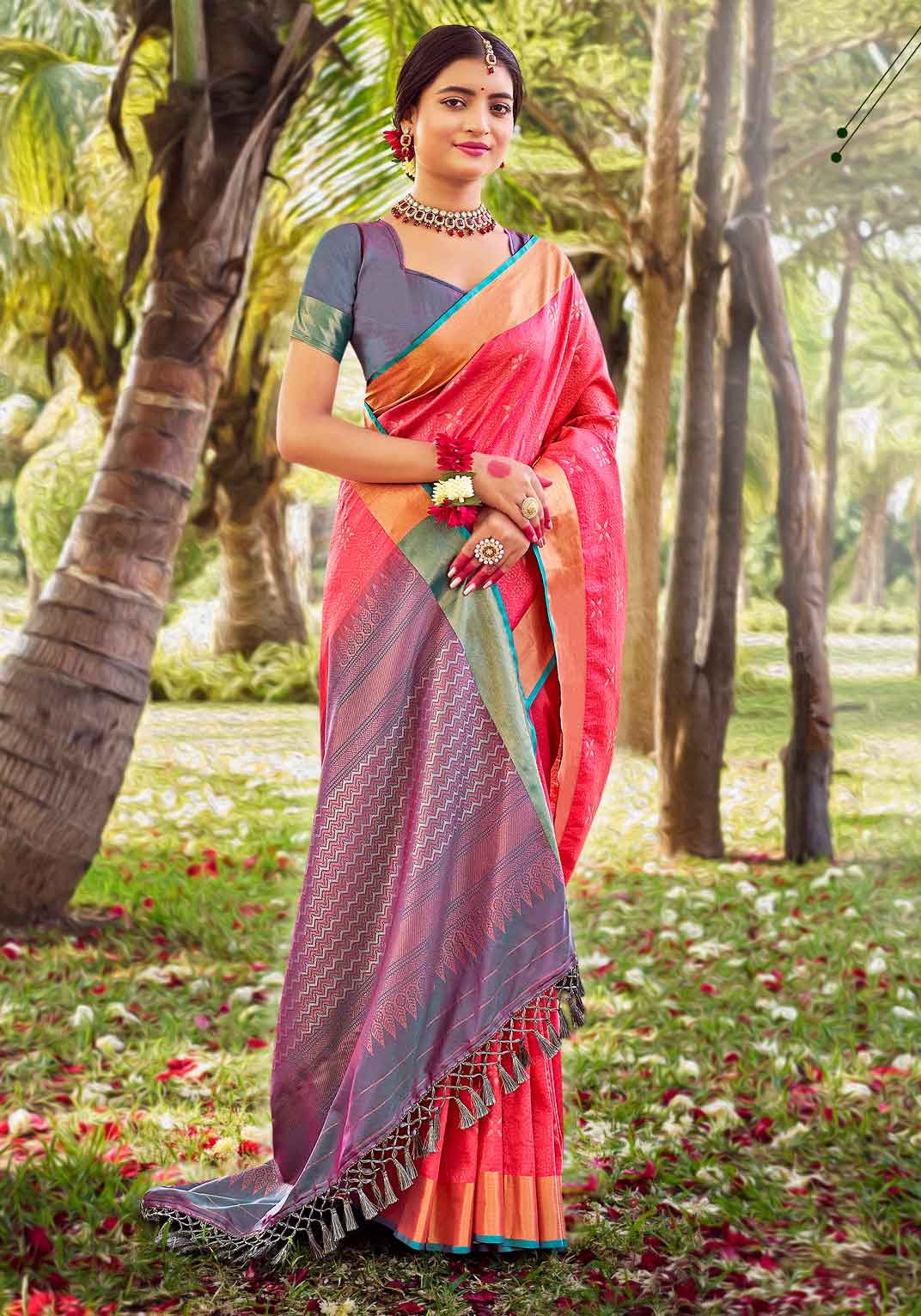 - Draped in a luxurious soft silk saree, this stunning piece a vibrant pink and purple body with intricate zari weaving and a contrasting border