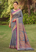 - Elevate your festive look with this elegant grey soft silk saree, intricate zari weaving and a contrasting border