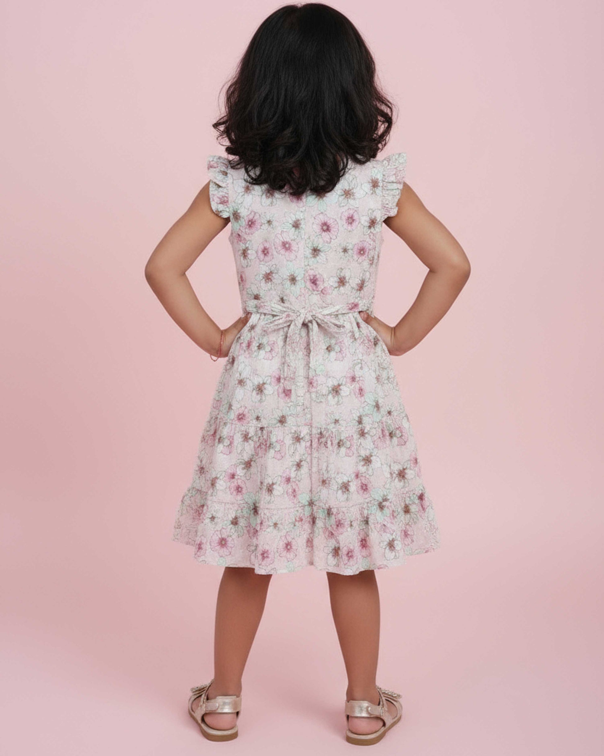 Stylish Floral Print Girls' Ruffled Sleeve Tiered Frock Dress - White