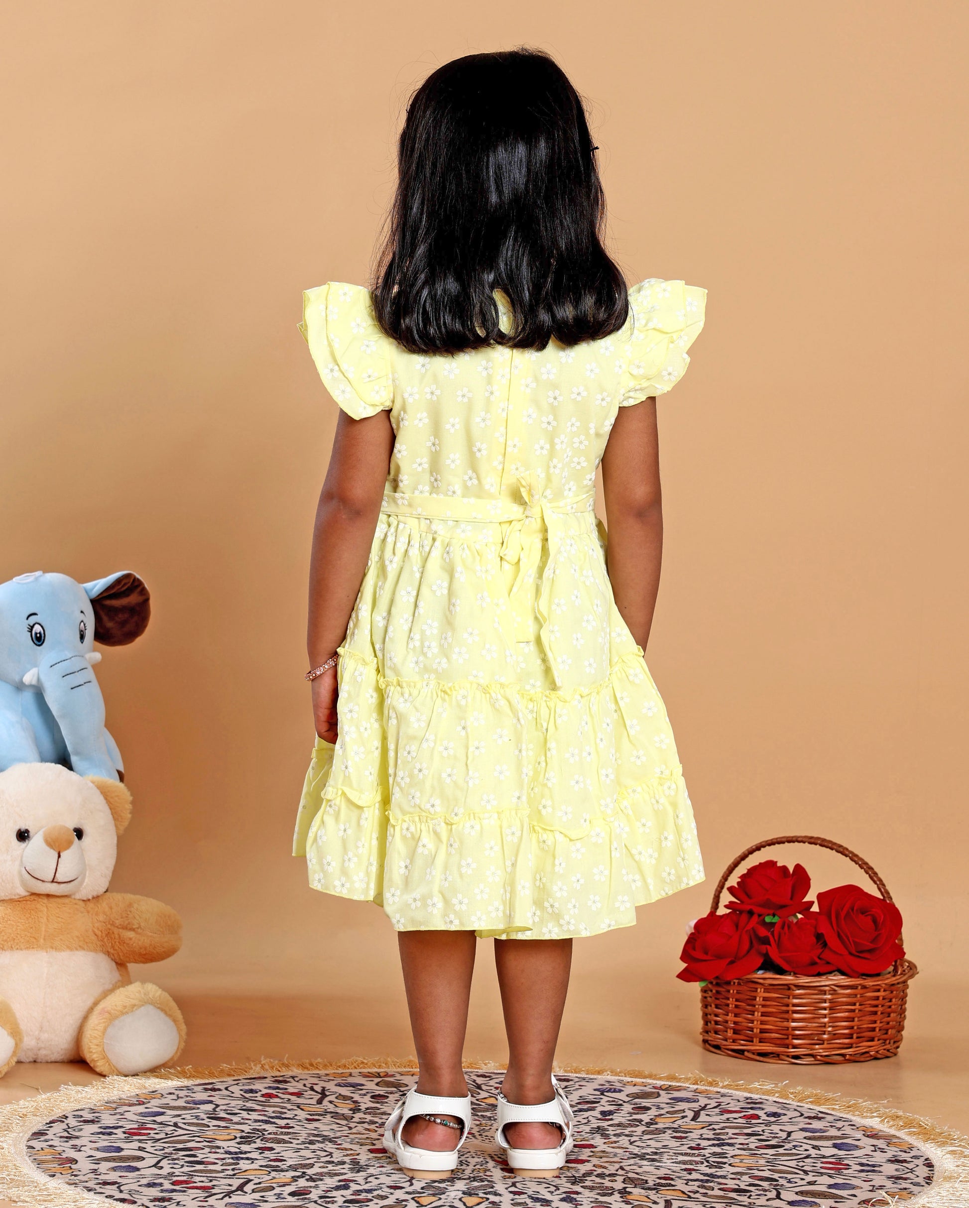 Stylish Floral Print Layered Kids Frock with Ruffled Sleeves and Waist Tie Bow Design - Yellow