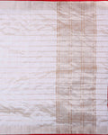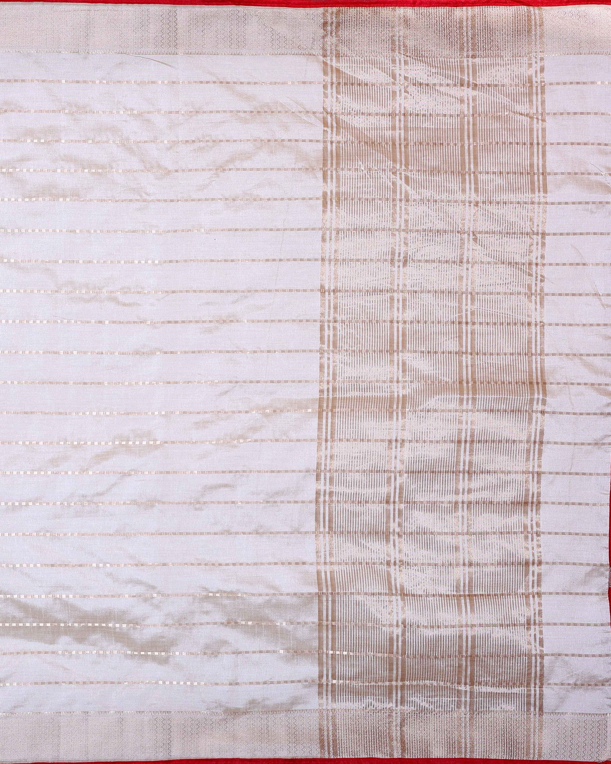 - Drape yourself in elegance with this serene off-white art silk saree, featuring delicate golden vertical lines and a contrasting red border
