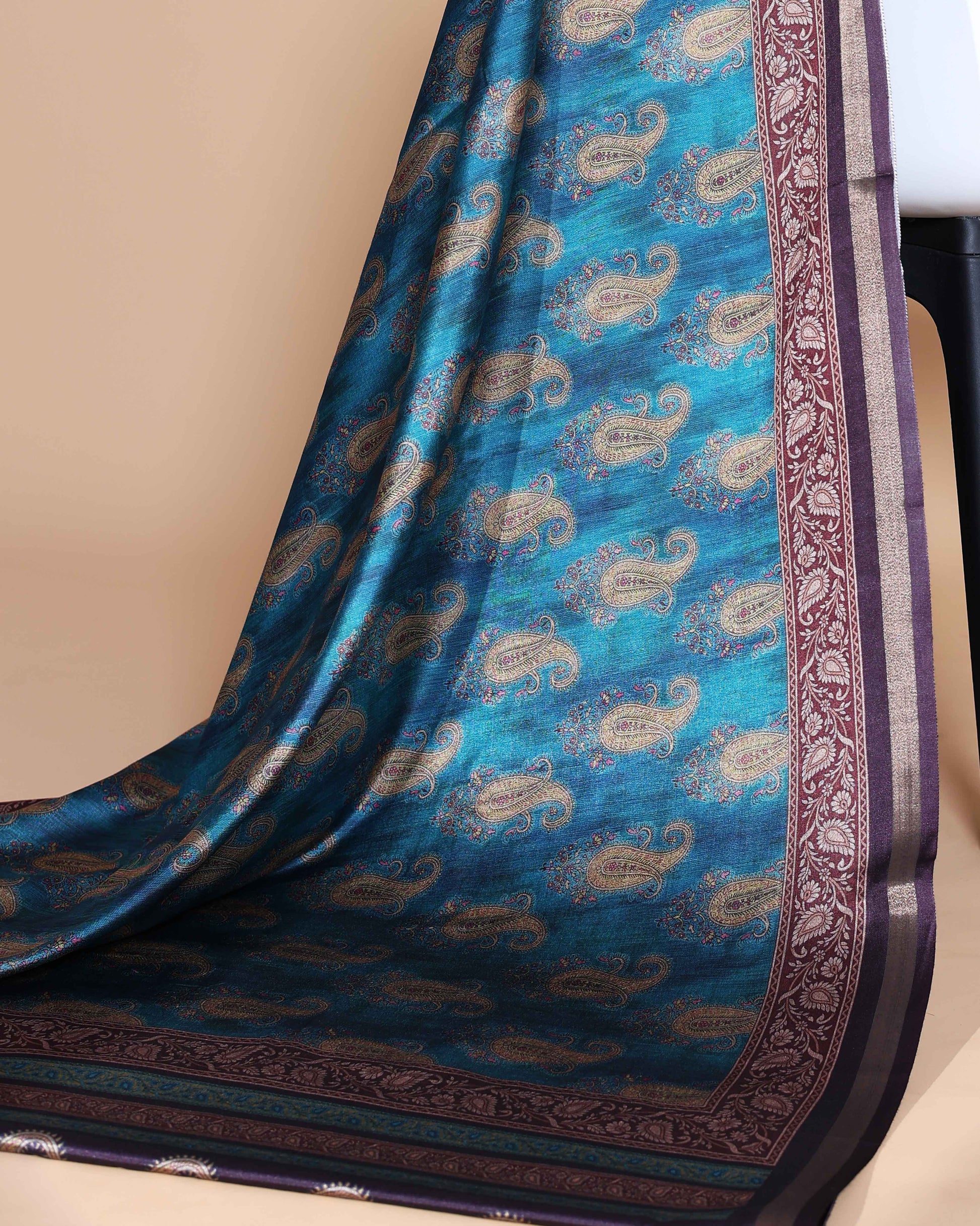 - Drape yourself in elegance with this peacock blue art silk saree, a body with intricate golden paisley motifs
