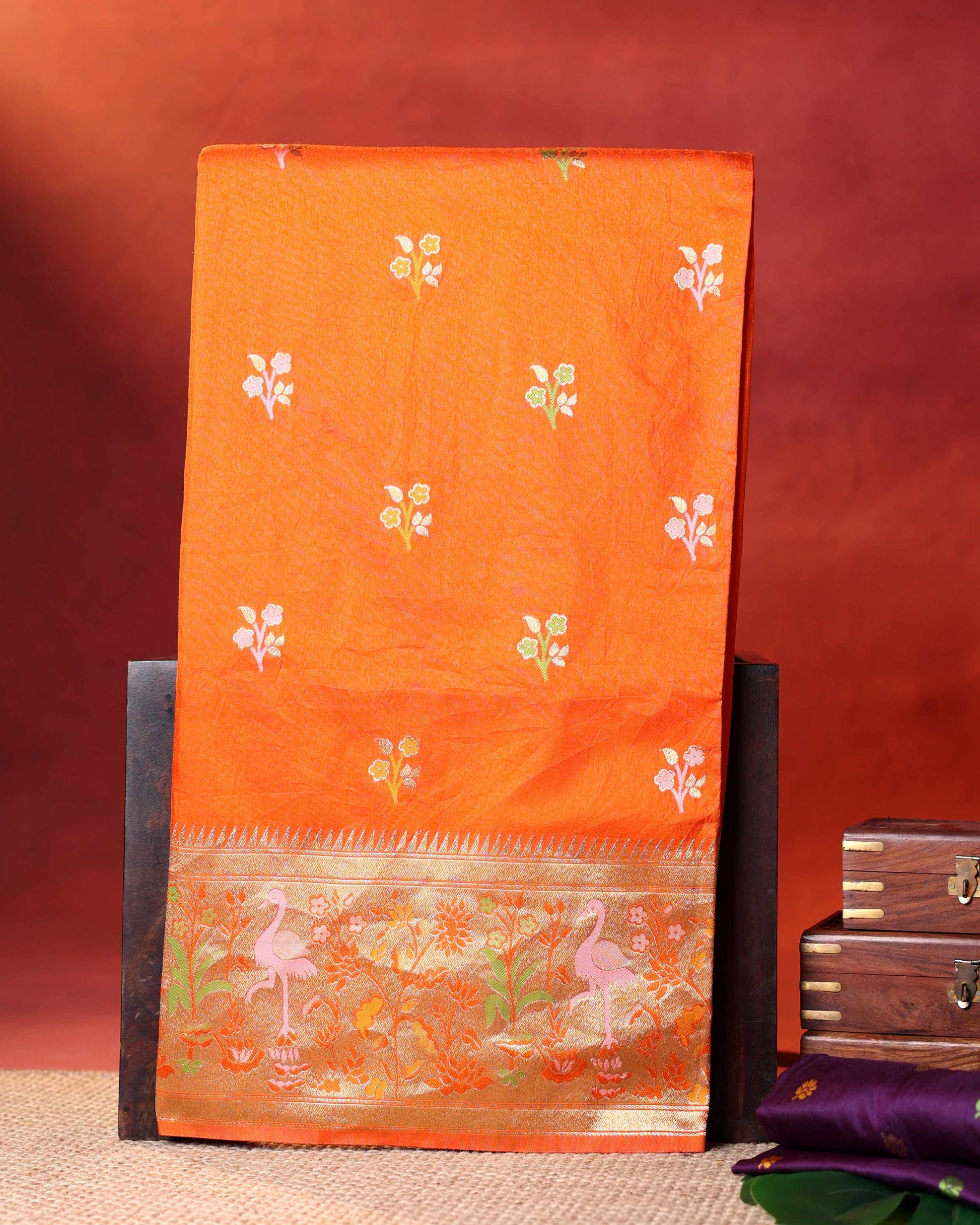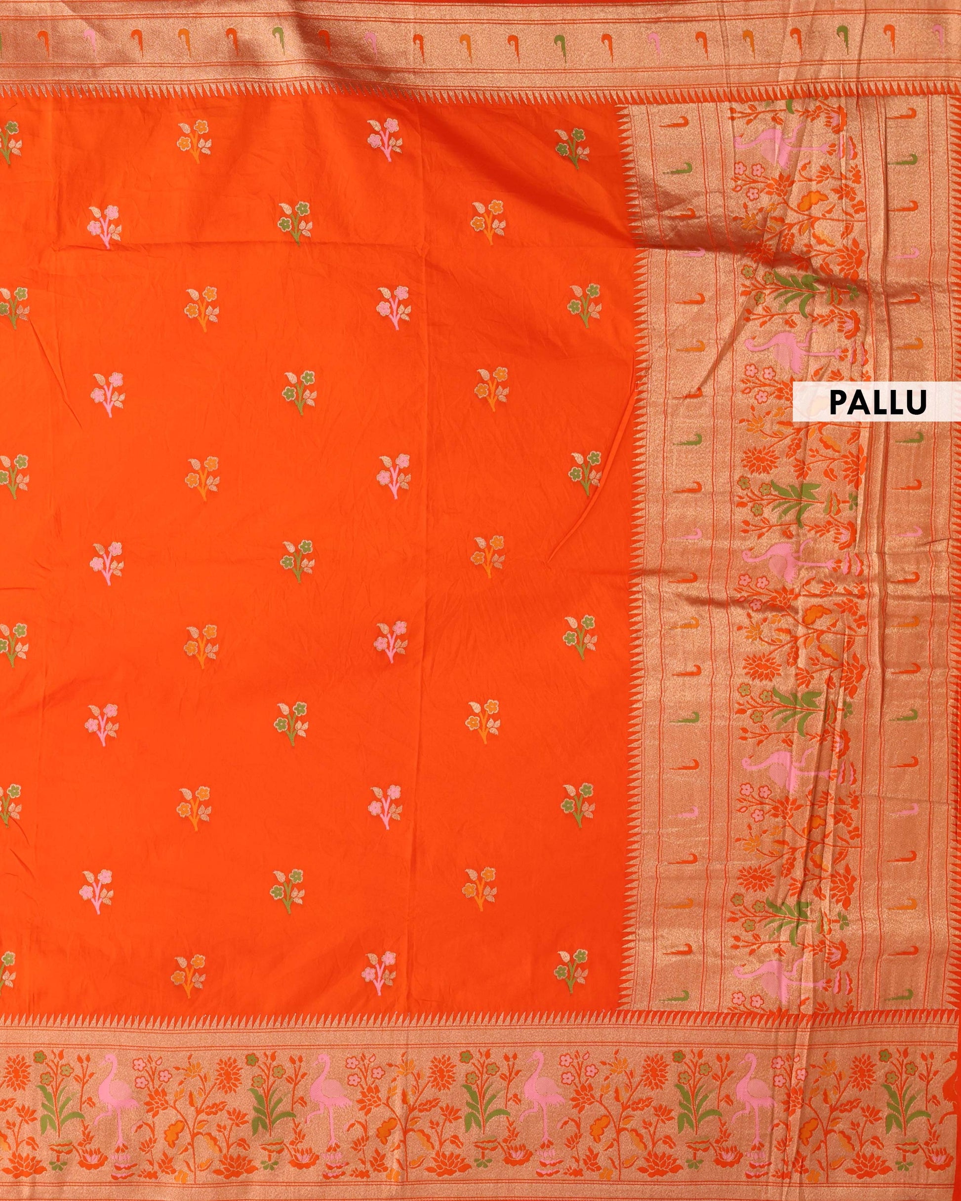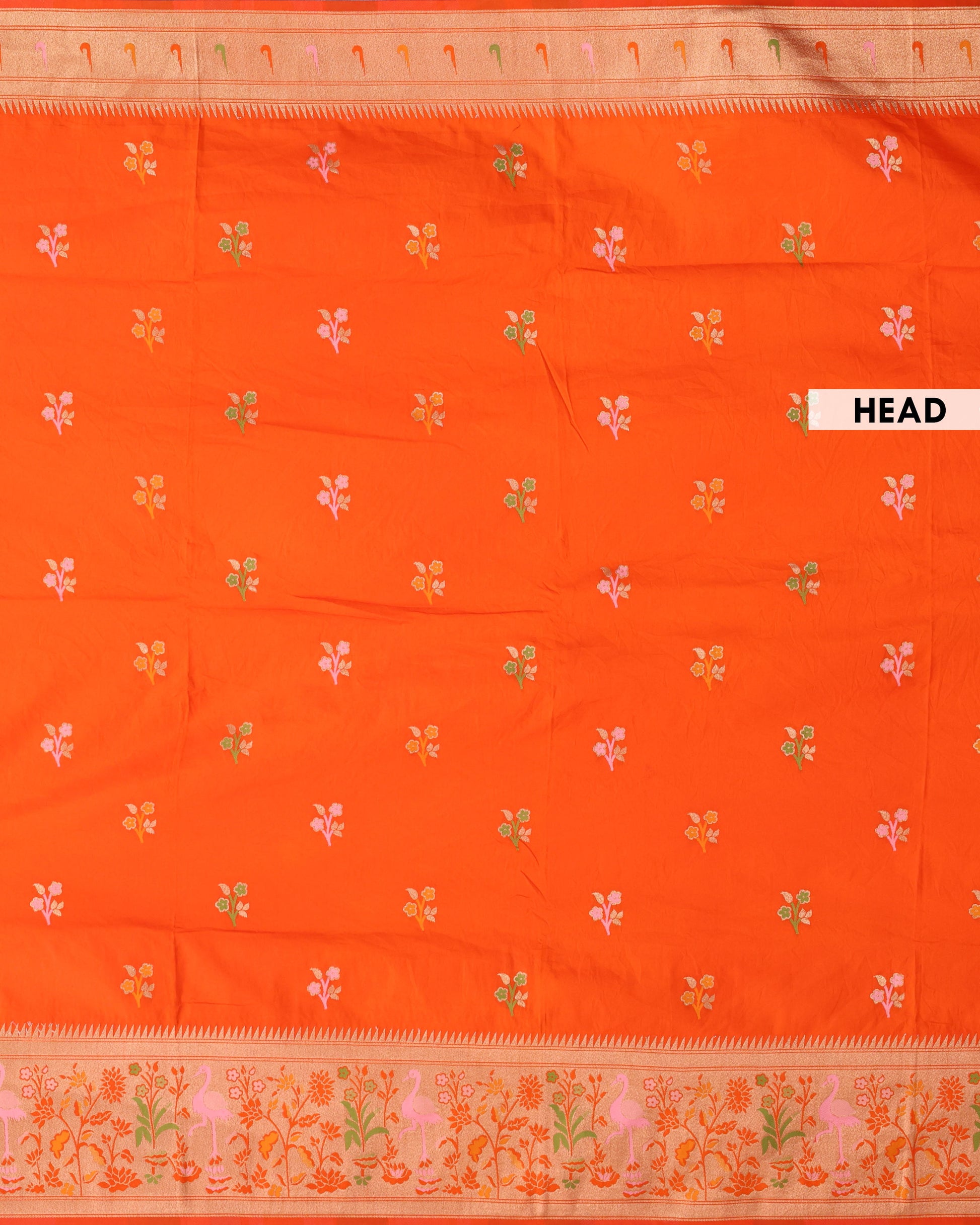 - This exquisite orange Banarasi silk saree intricate gold zari floral motifs and a unique, ornate lower border with charming bird designs.