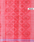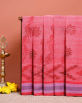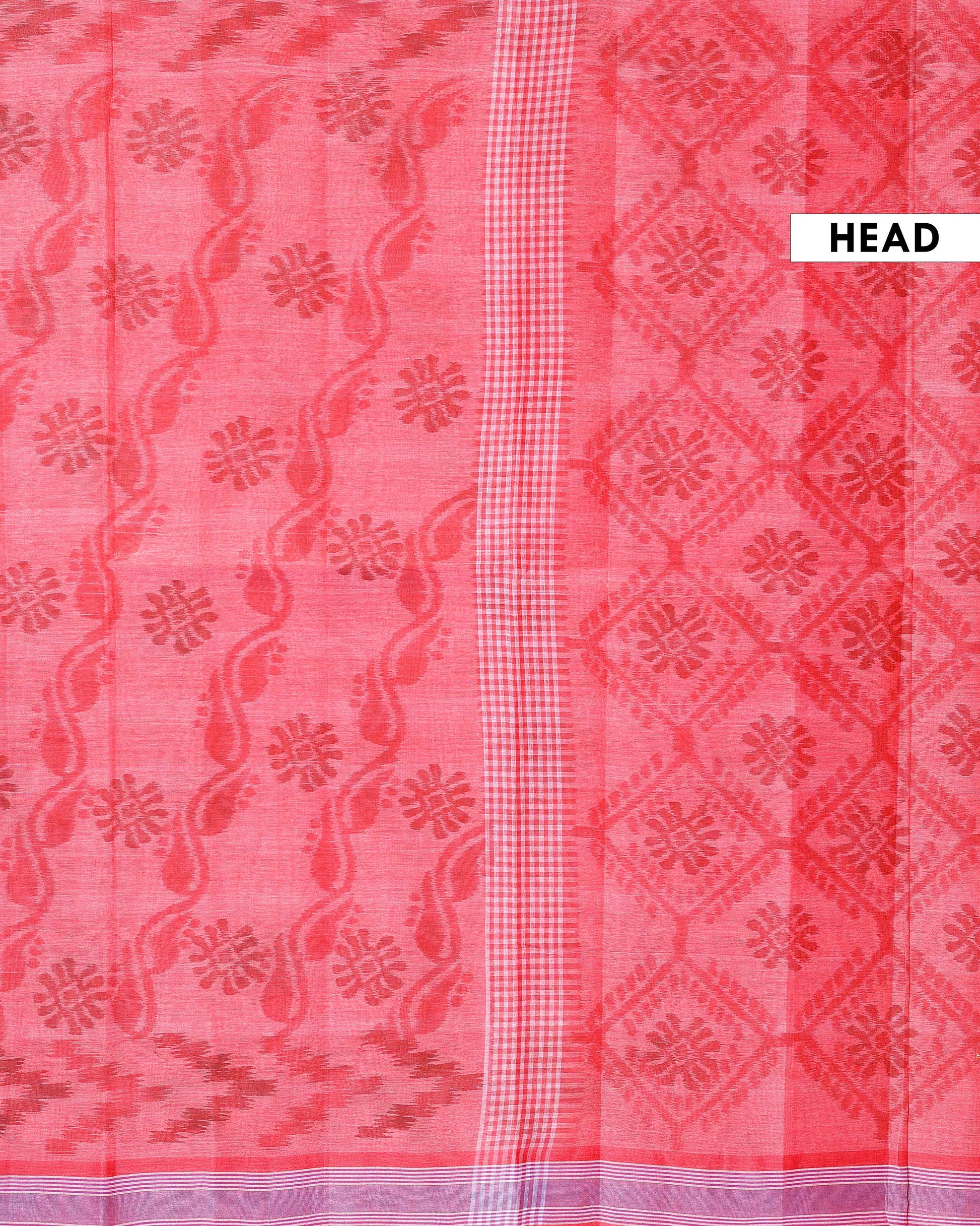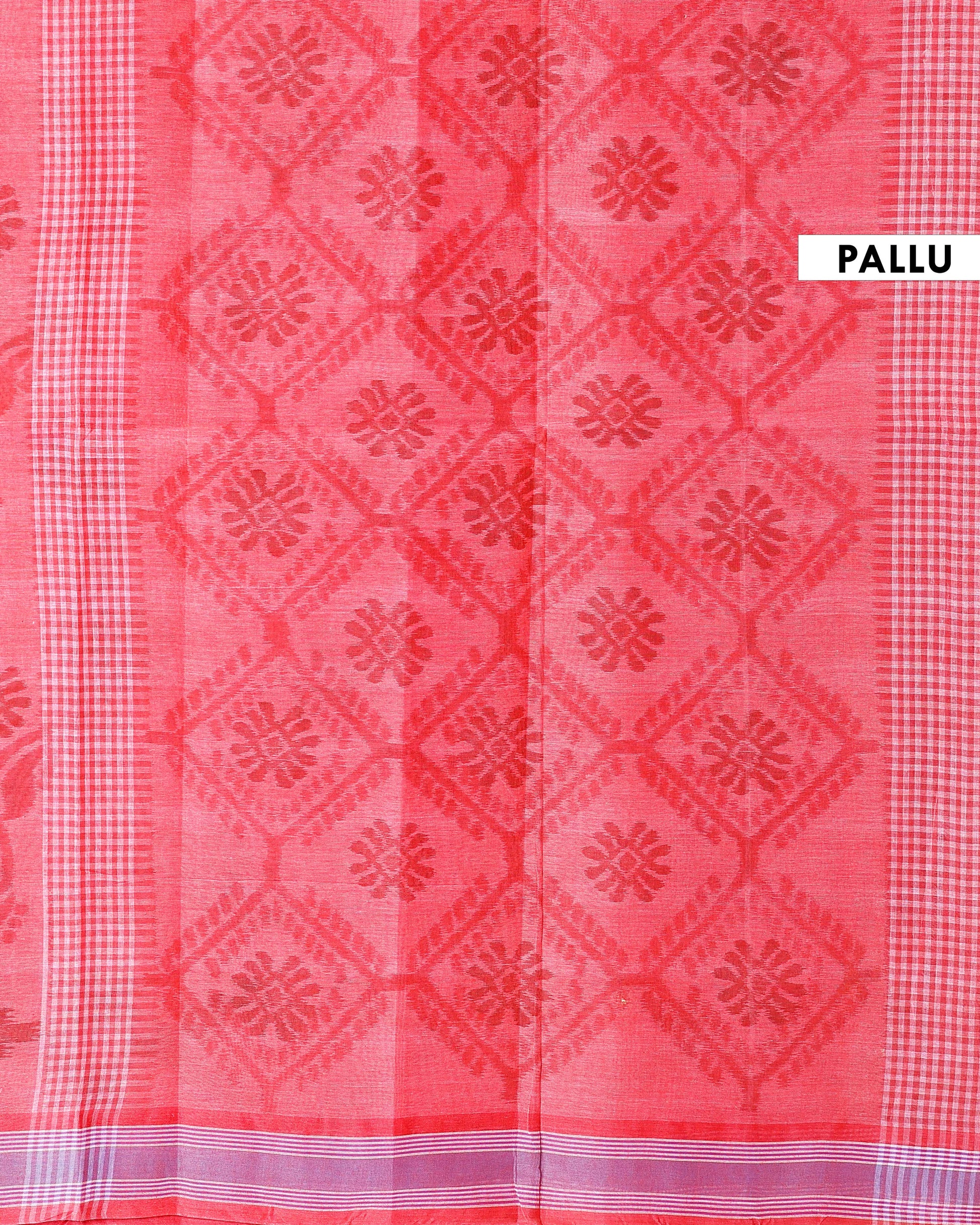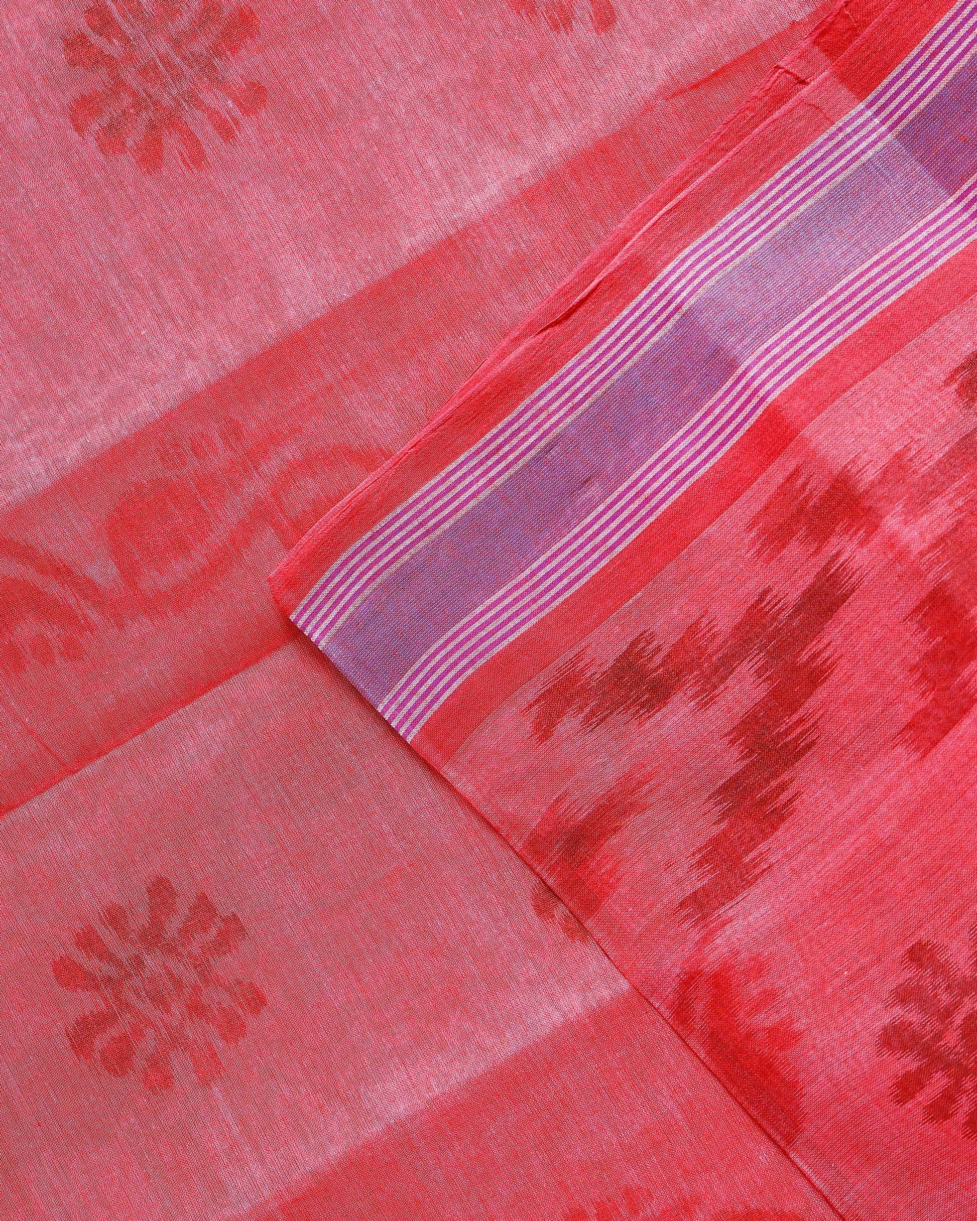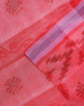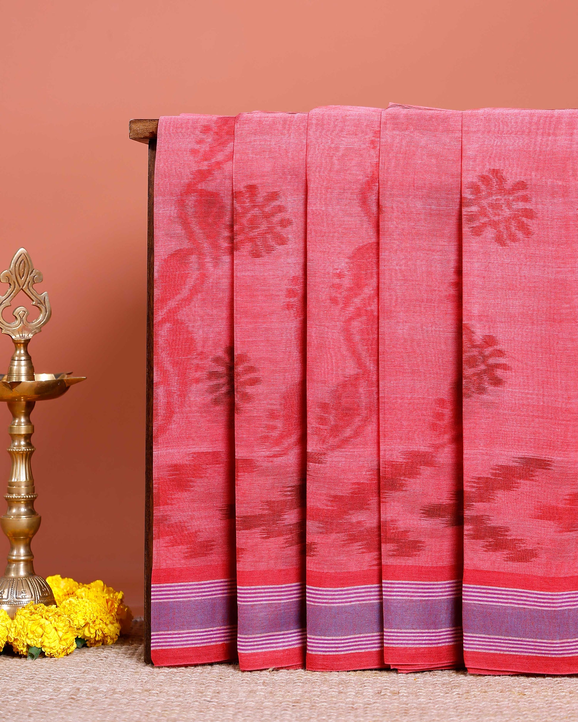 Traditional Bengal Cotton Saree with Floral Block Print and Striped Border - Red
