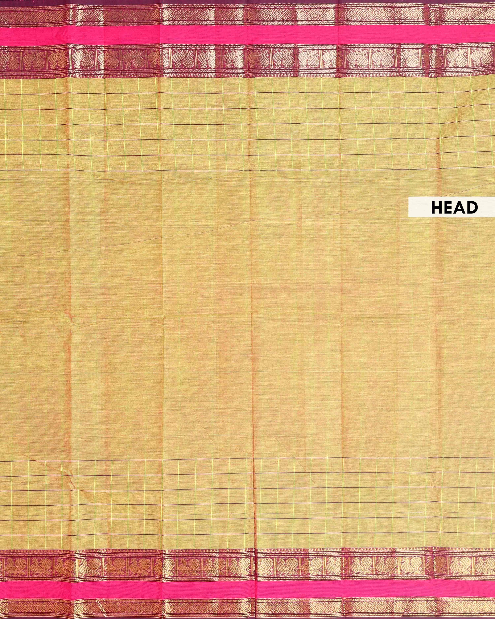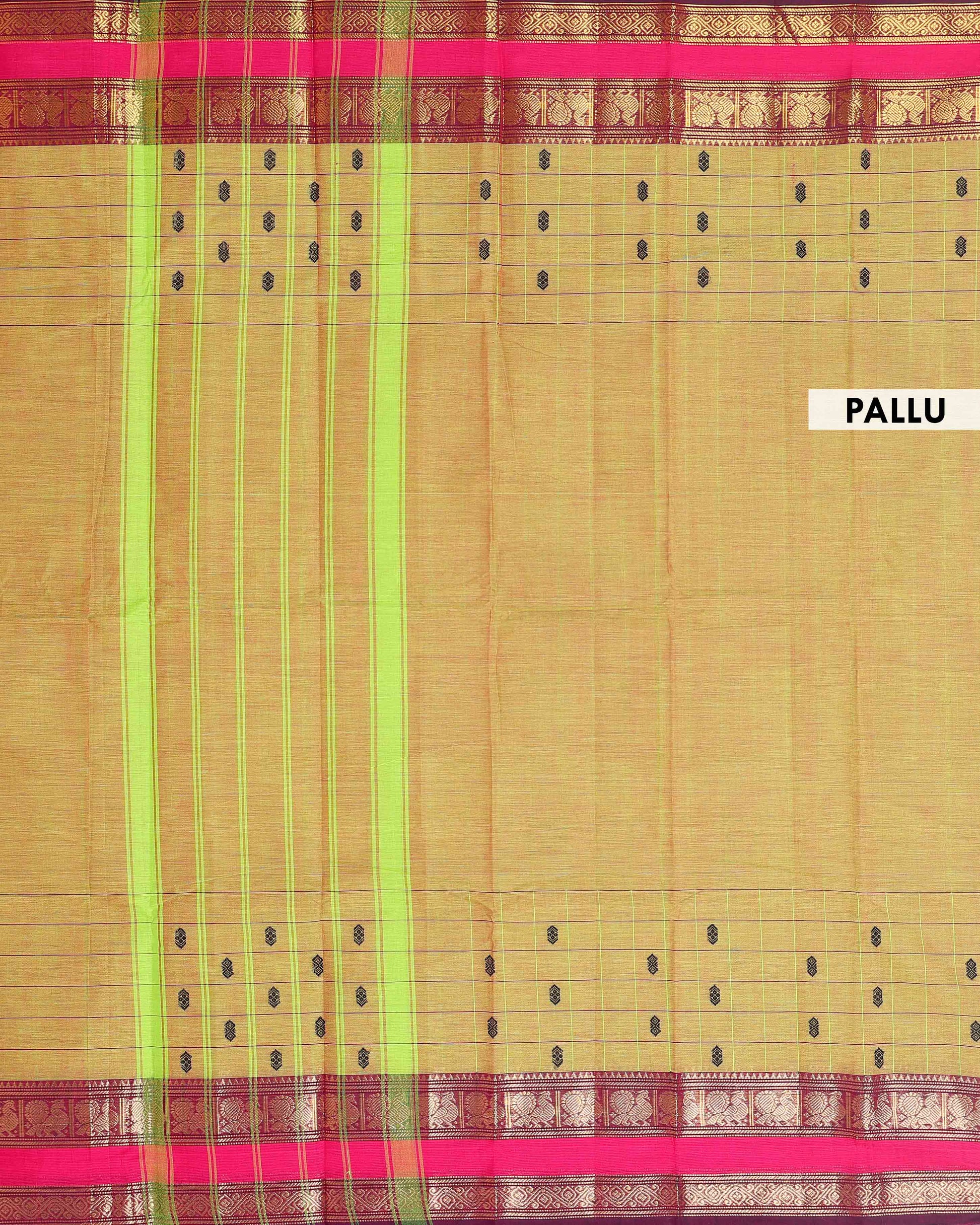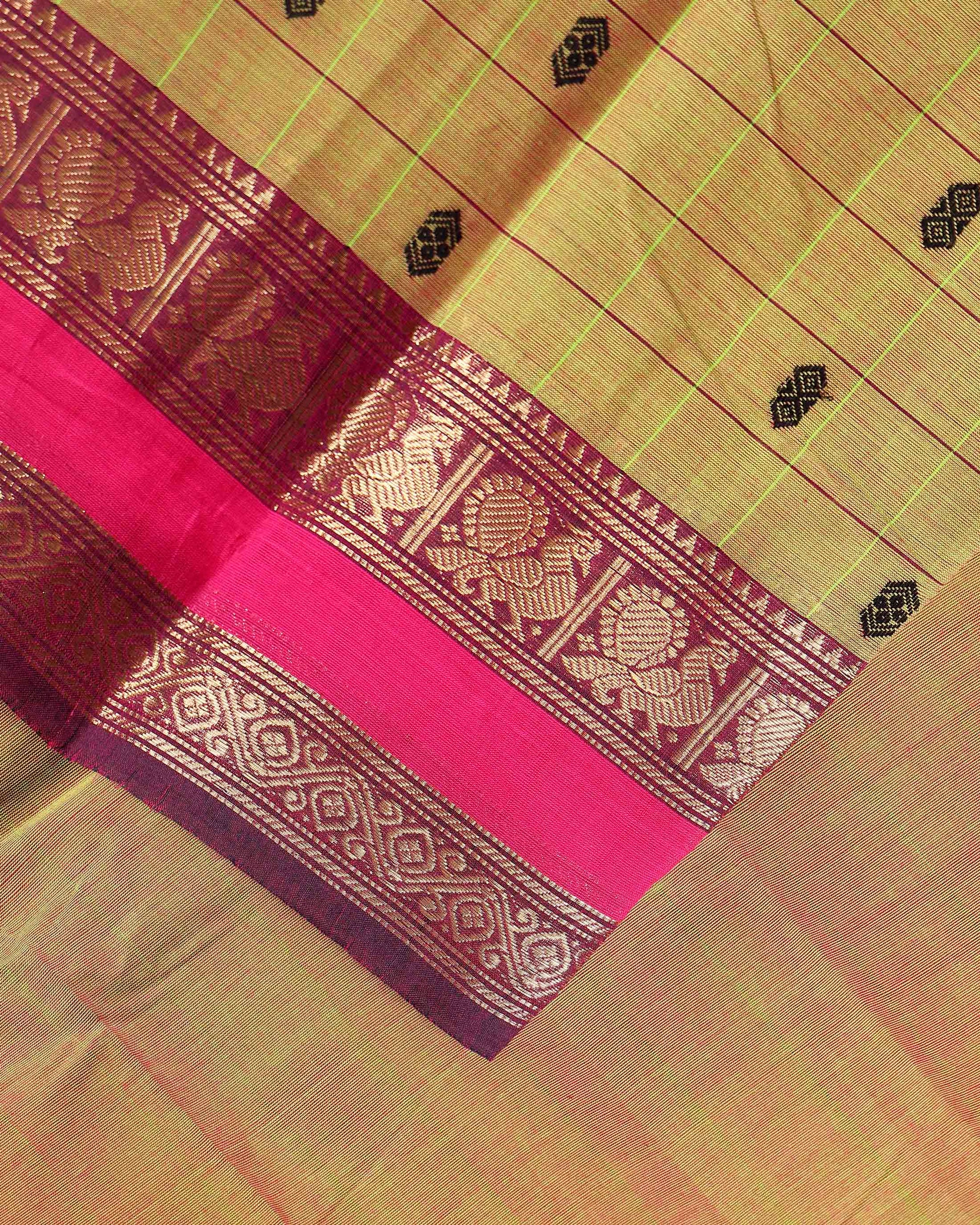 - This handwoven Chettinad cotton saree in Olive Green traditional striped body and a vibrant double-contrast border with intricate peacock and floral motifs.