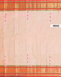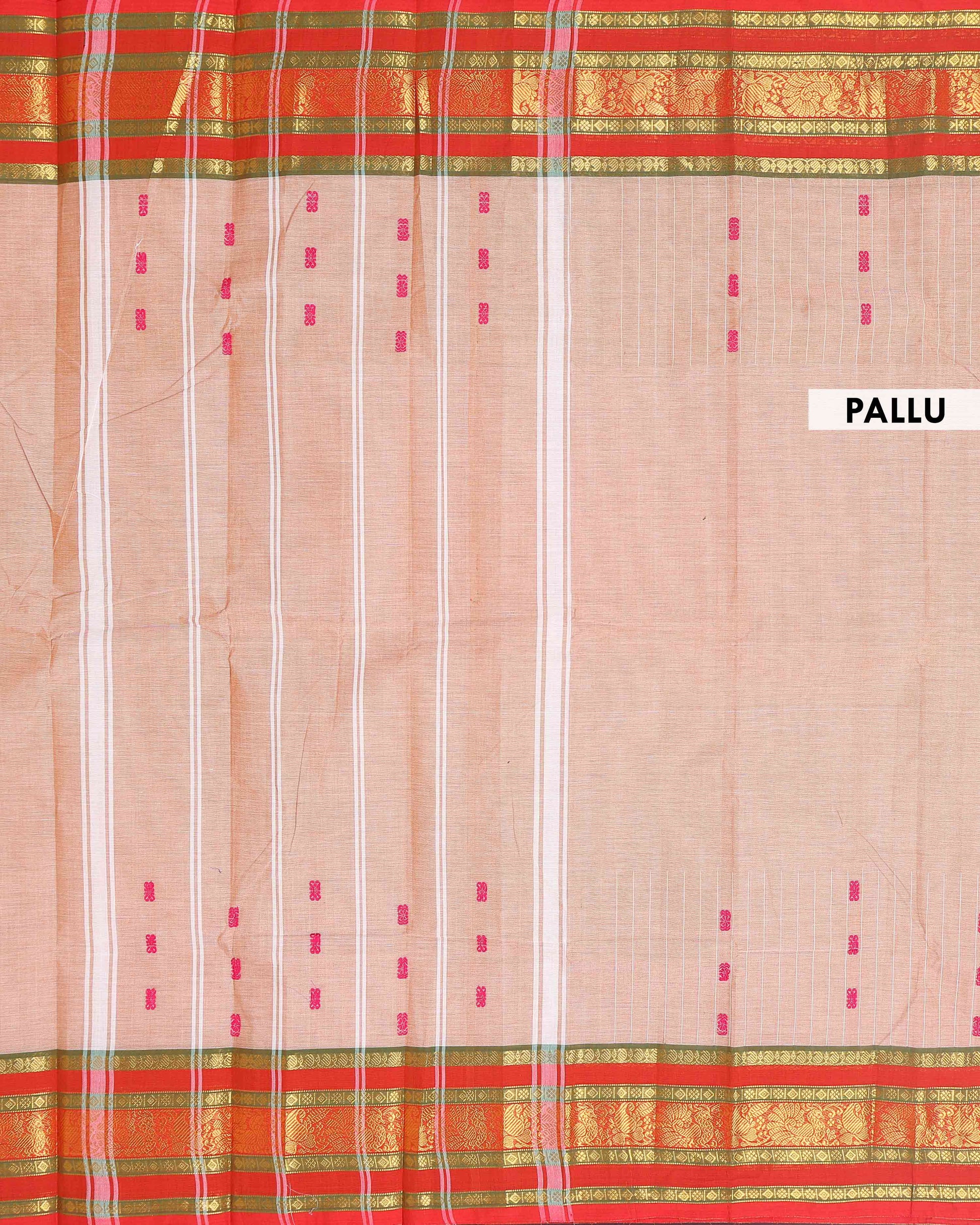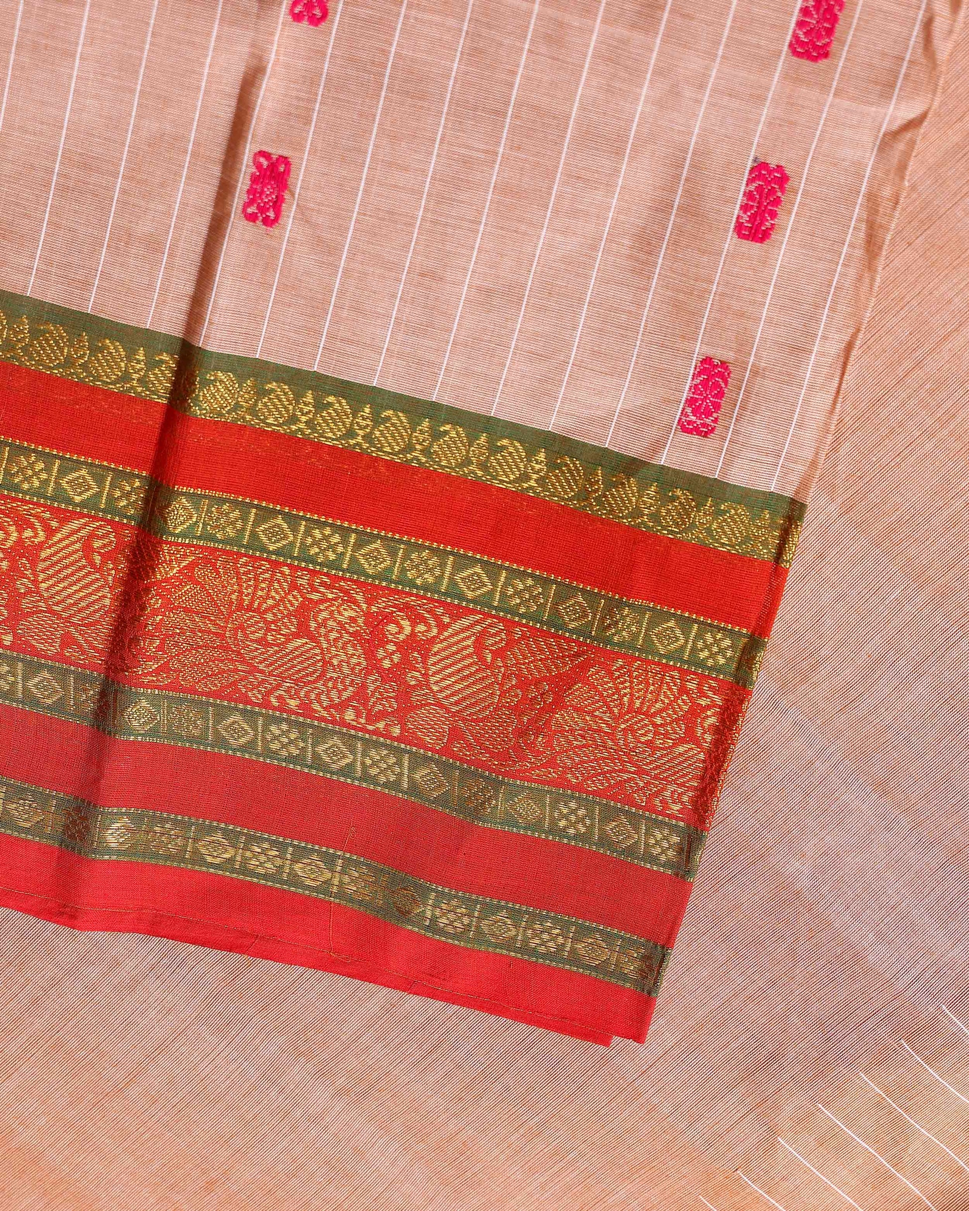 - Elevate your style with this elegant Chettinad cotton saree, a subtle striped pattern and a striking contrast border with traditional motifs