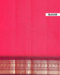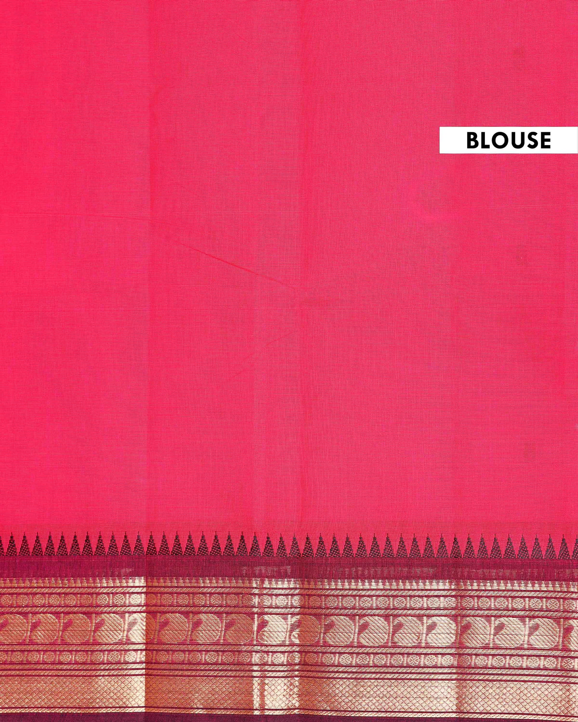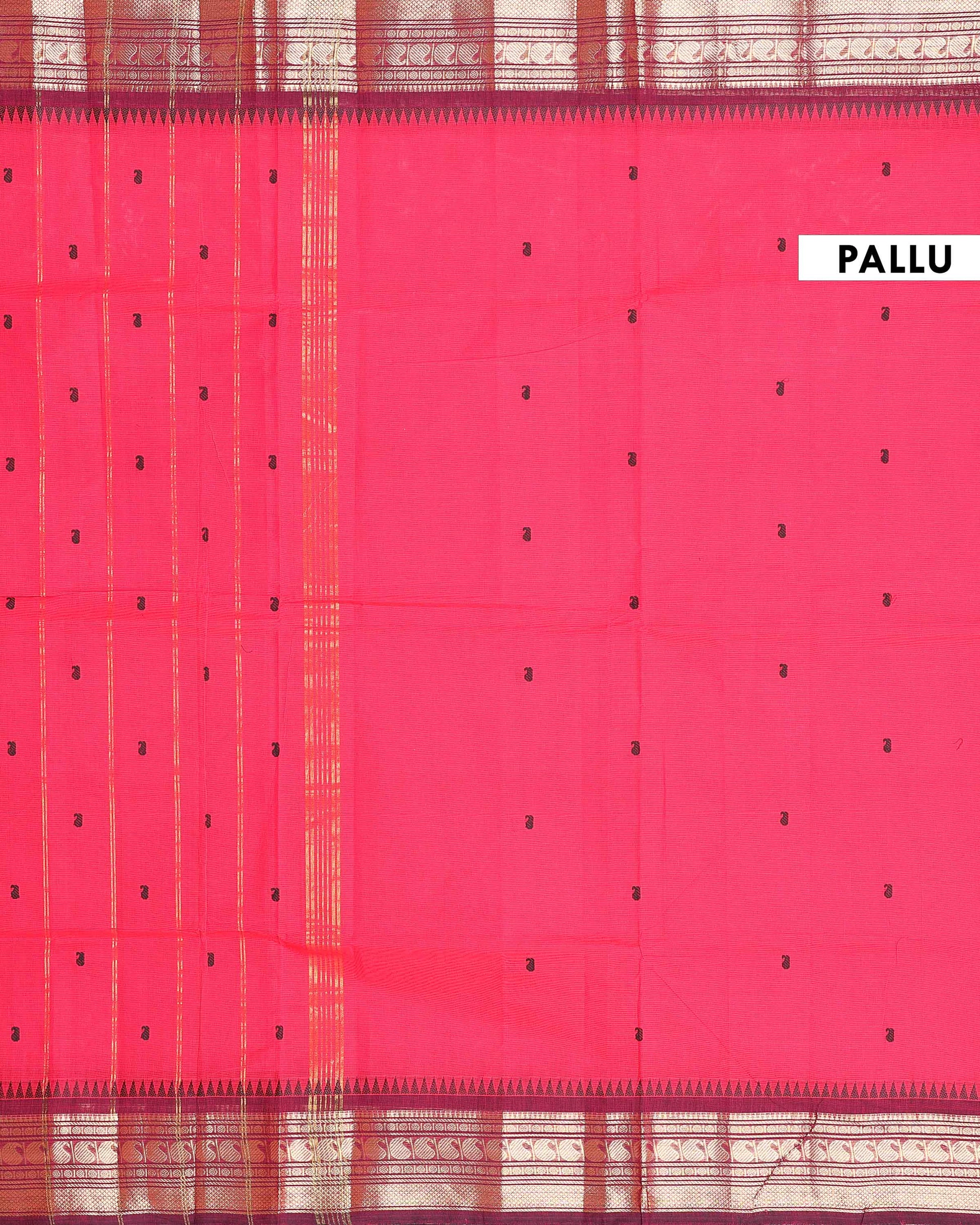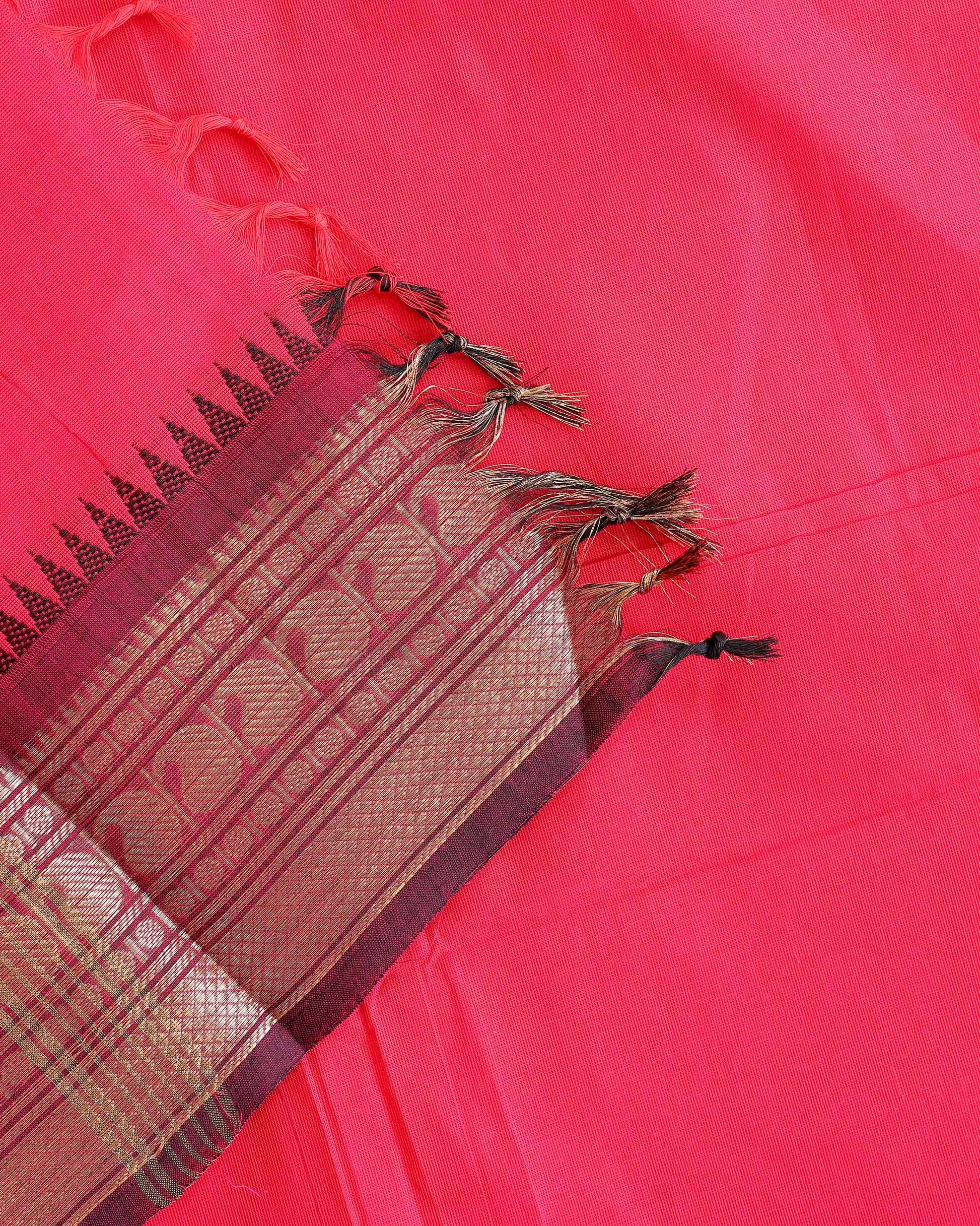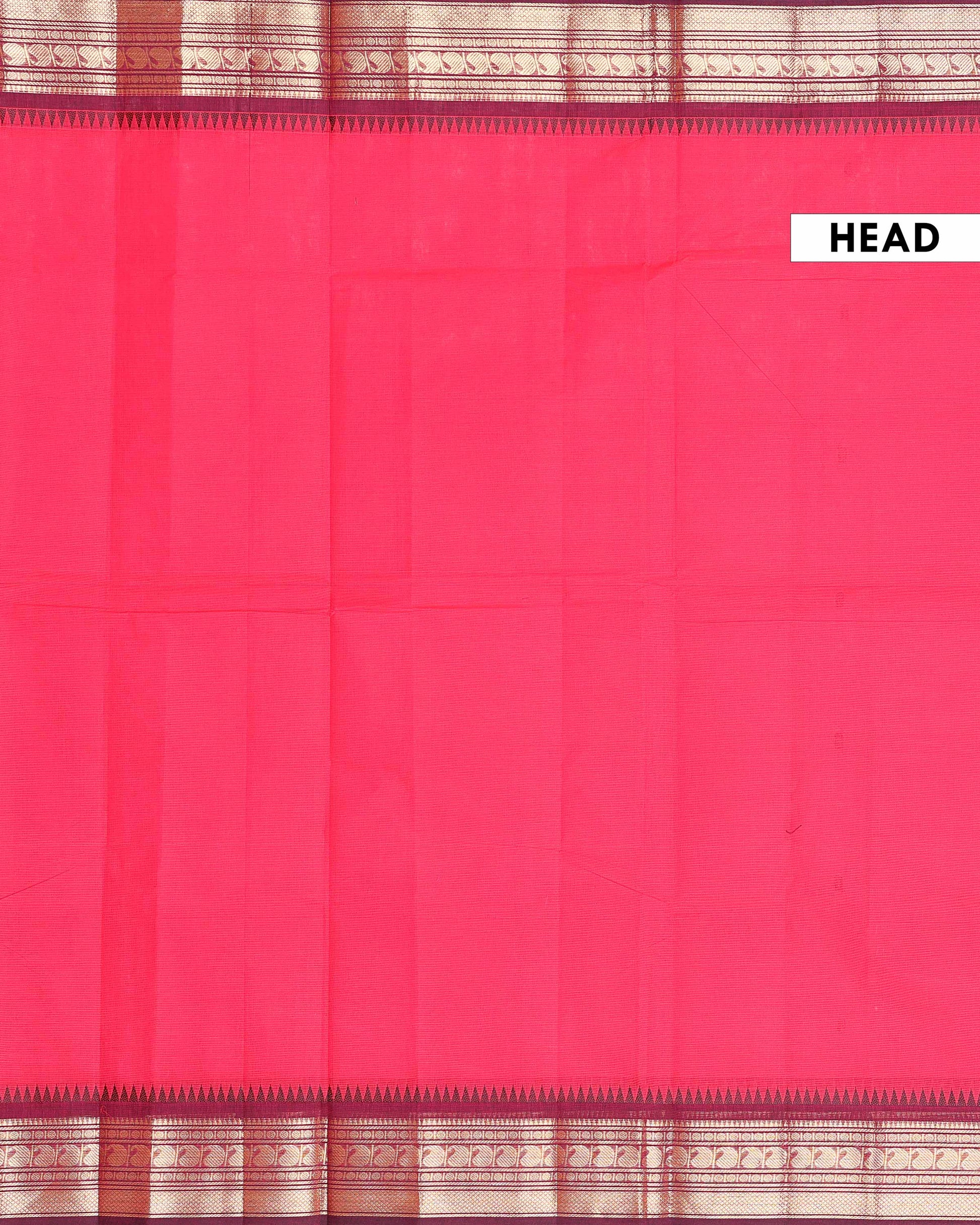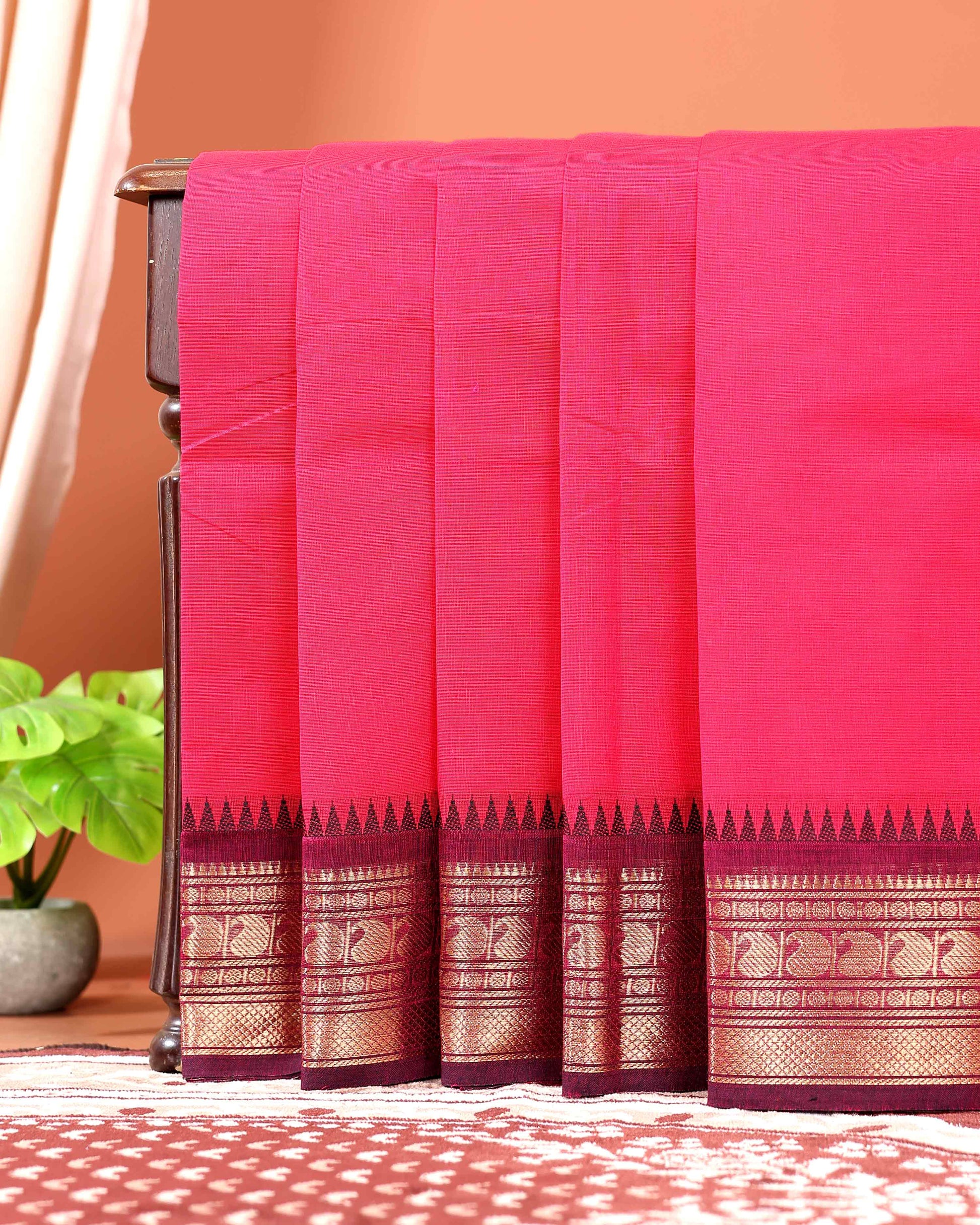 - This handwoven Chettinad cotton saree in vibrant pink a striking contrast maroon border with traditional temple and peacock zari motifs