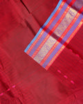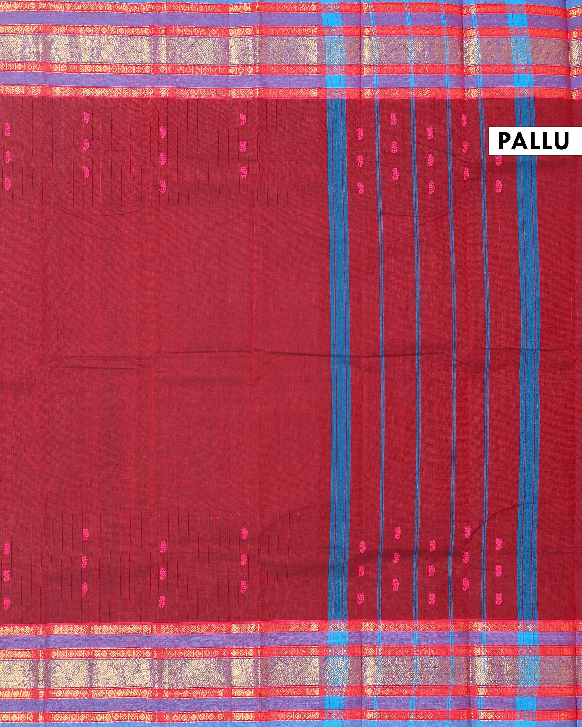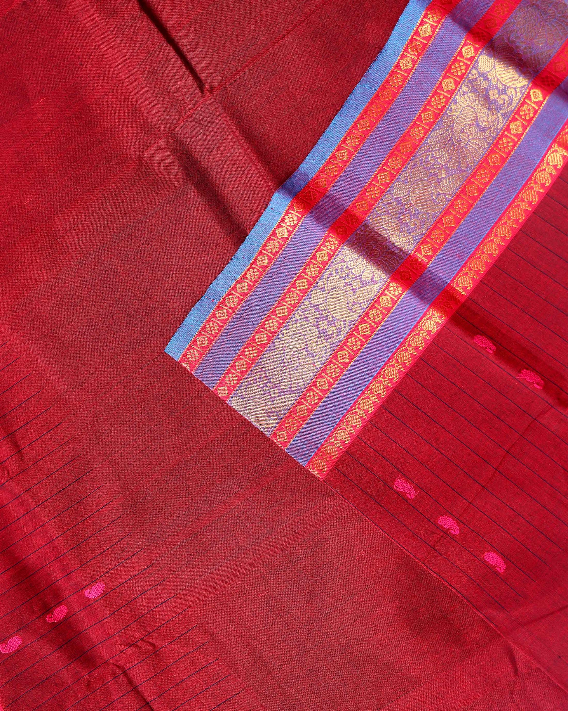 - This handwoven Chettinad cotton saree in Maroon a traditional striped body and a vibrant double-contrast border with intricate peacock and floral motifs.
