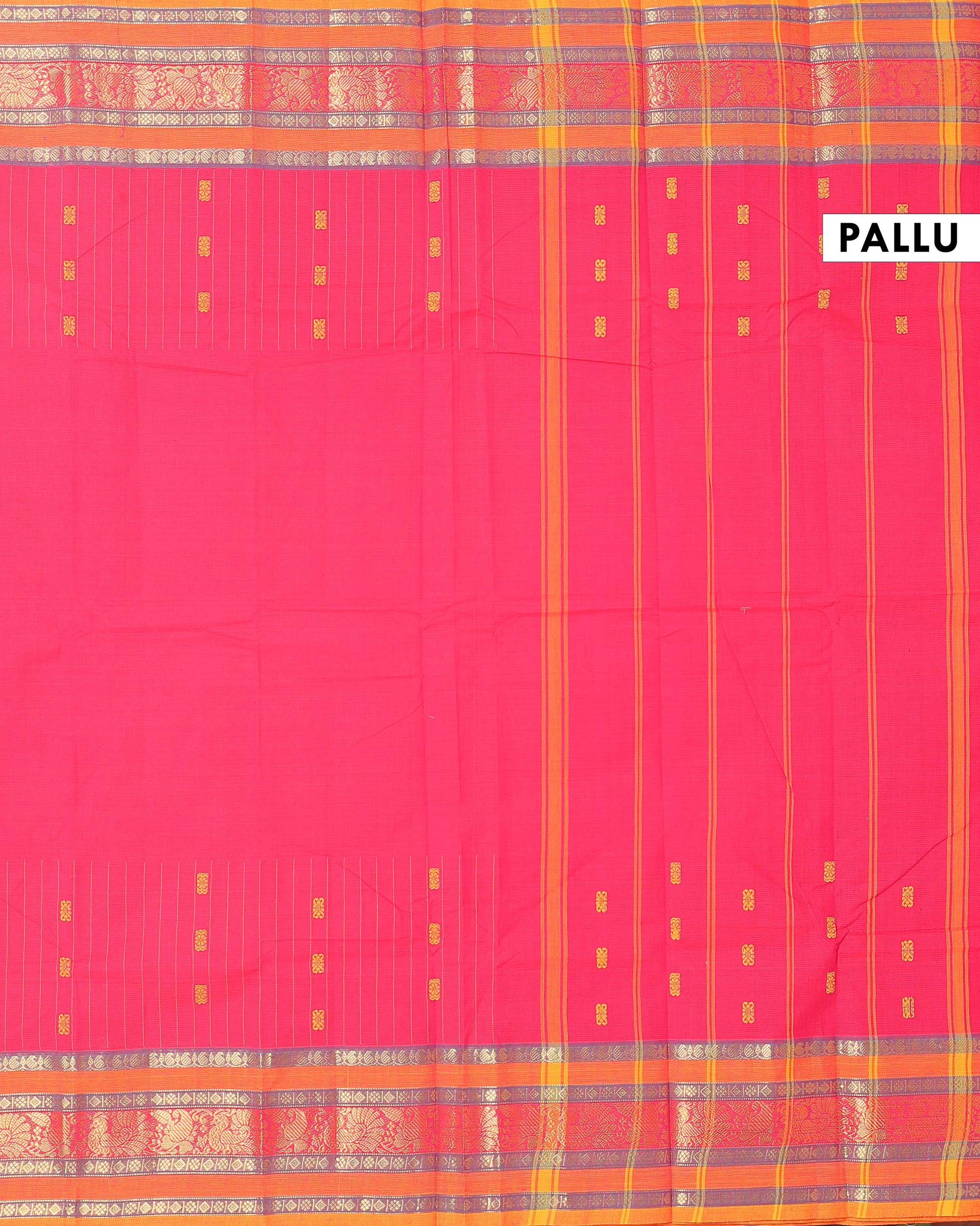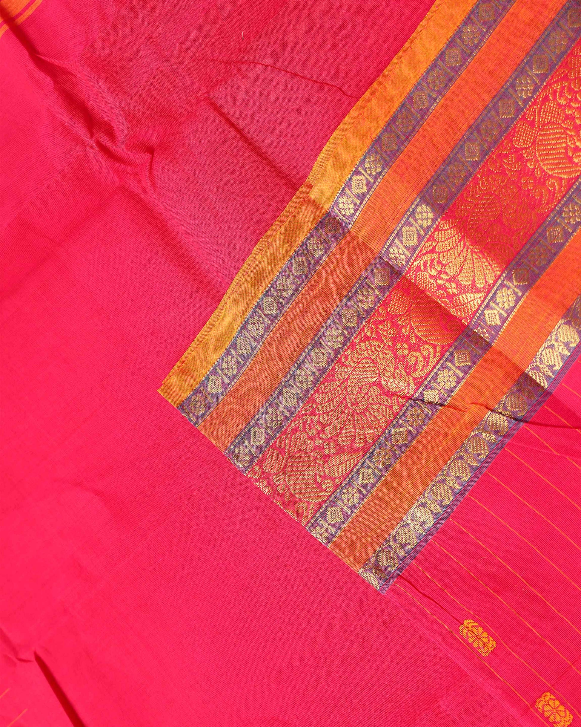 - This handwoven Chettinad cotton saree in magenta pink a traditional striped body and a vibrant double-contrast border with intricate peacock and floral motifs.