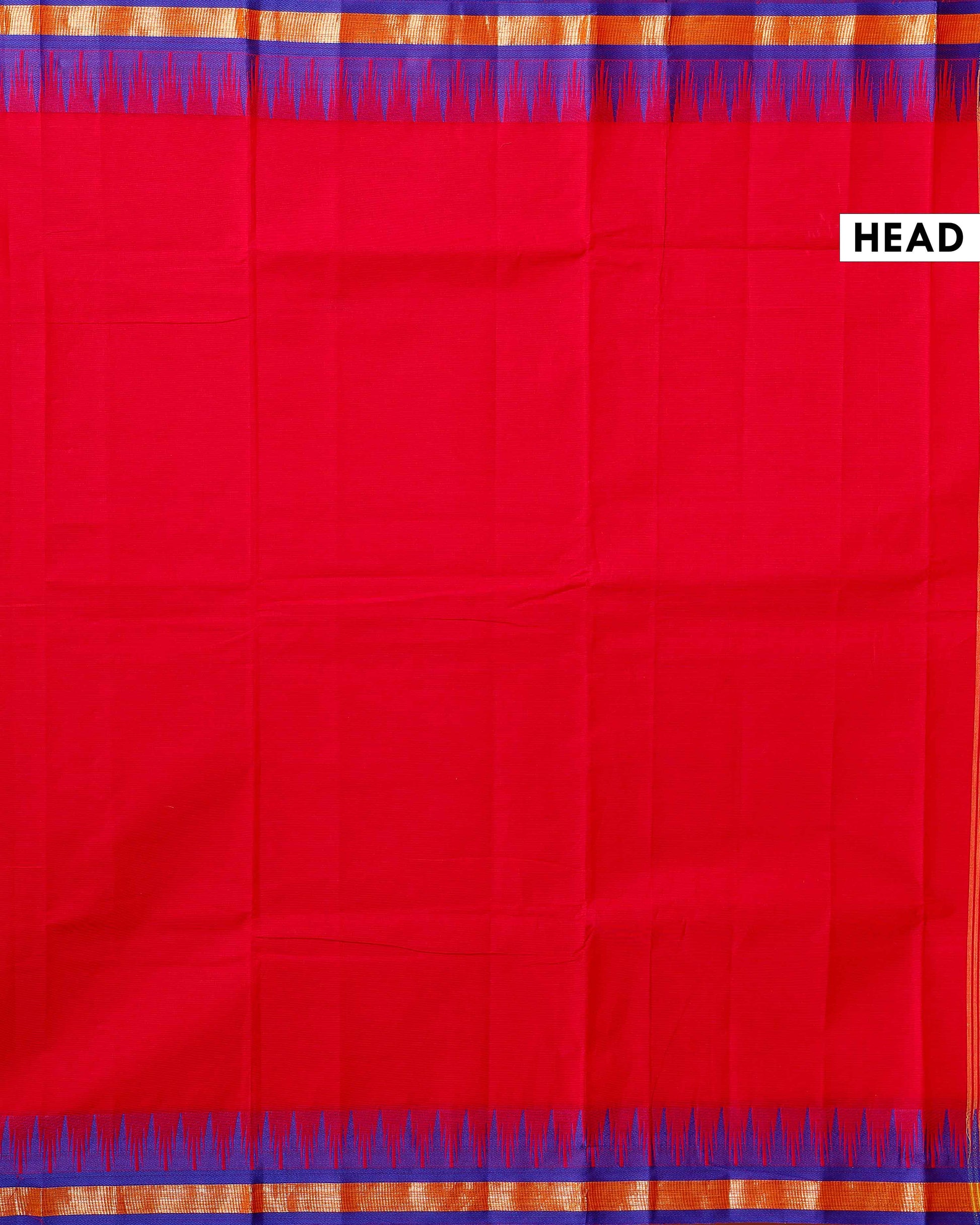 Traditional Chettinad Cotton Saree with Contrast Temple Border and Intricate Zari Detailing - Red