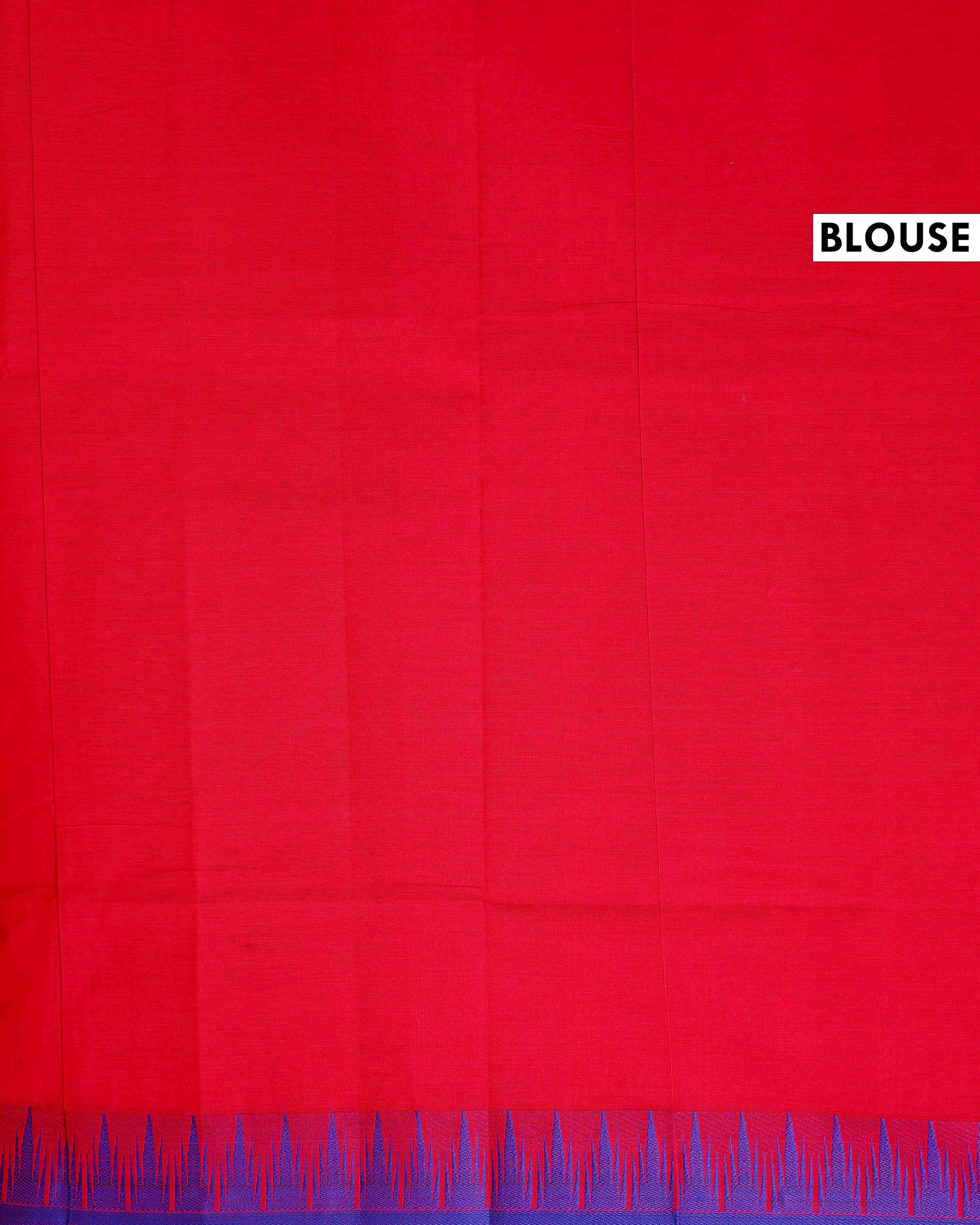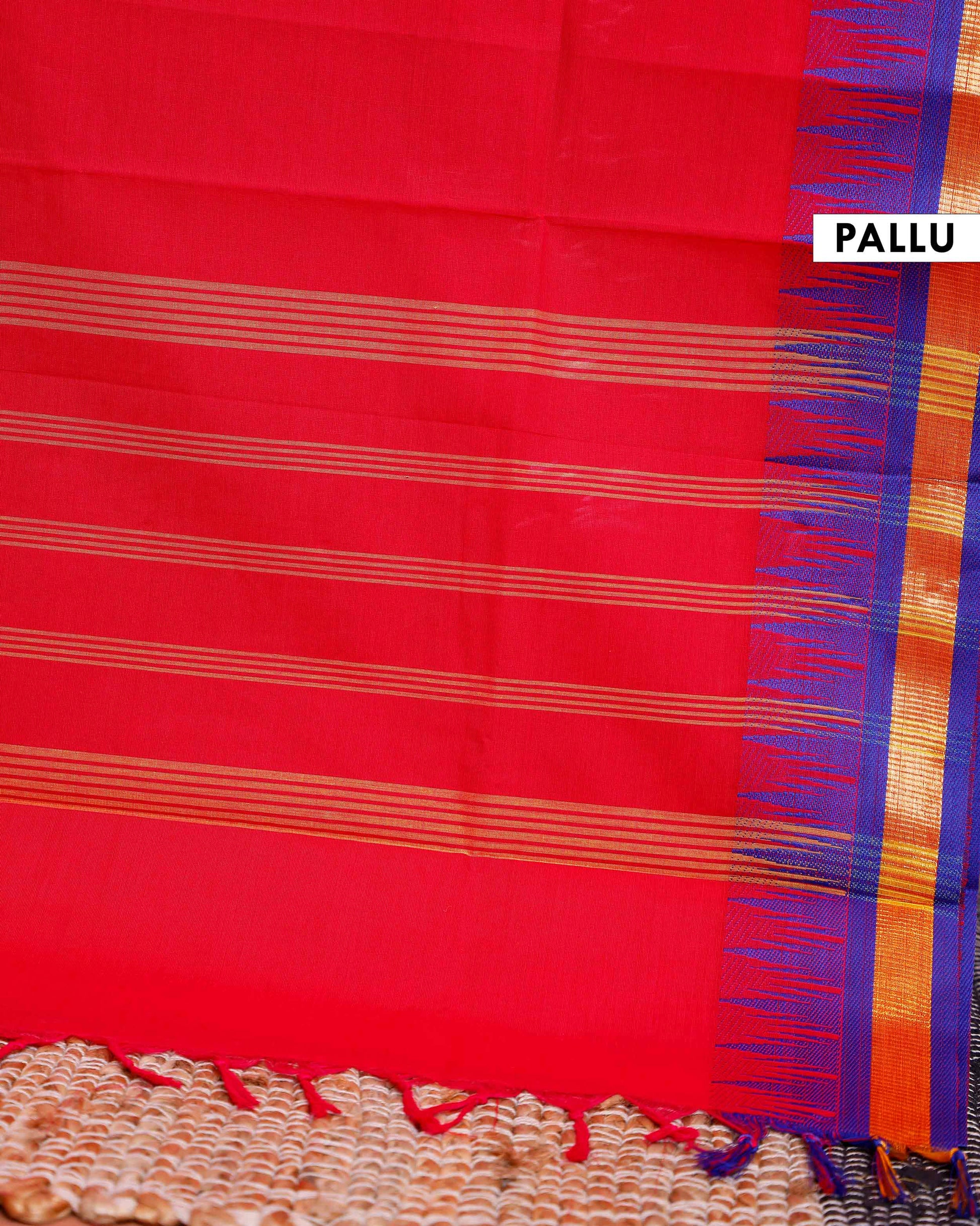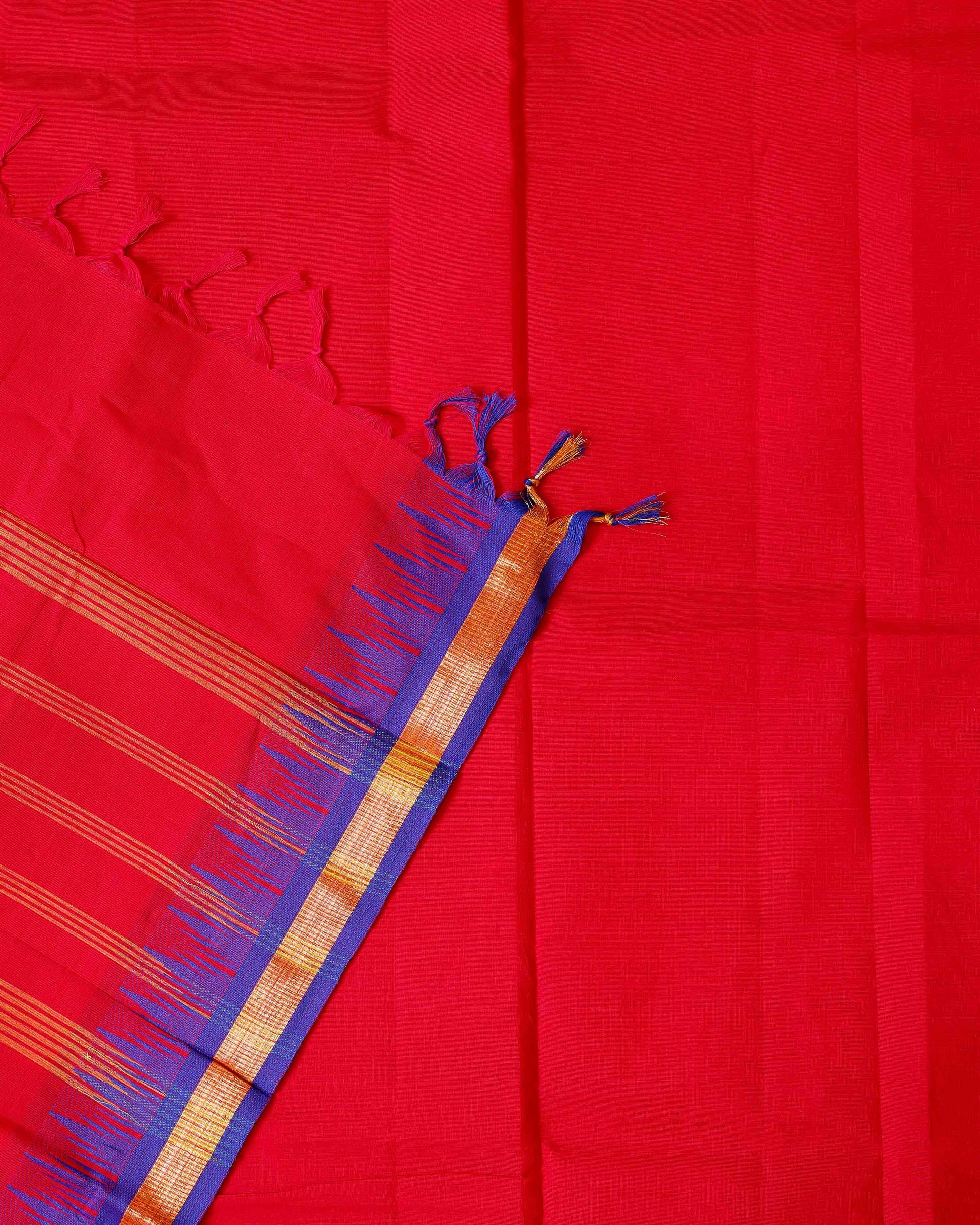 - This Chettinad Cotton Saree a vibrant Red body with subtle stripes, complemented by a striking blue temple-style border and a traditional patterned trim