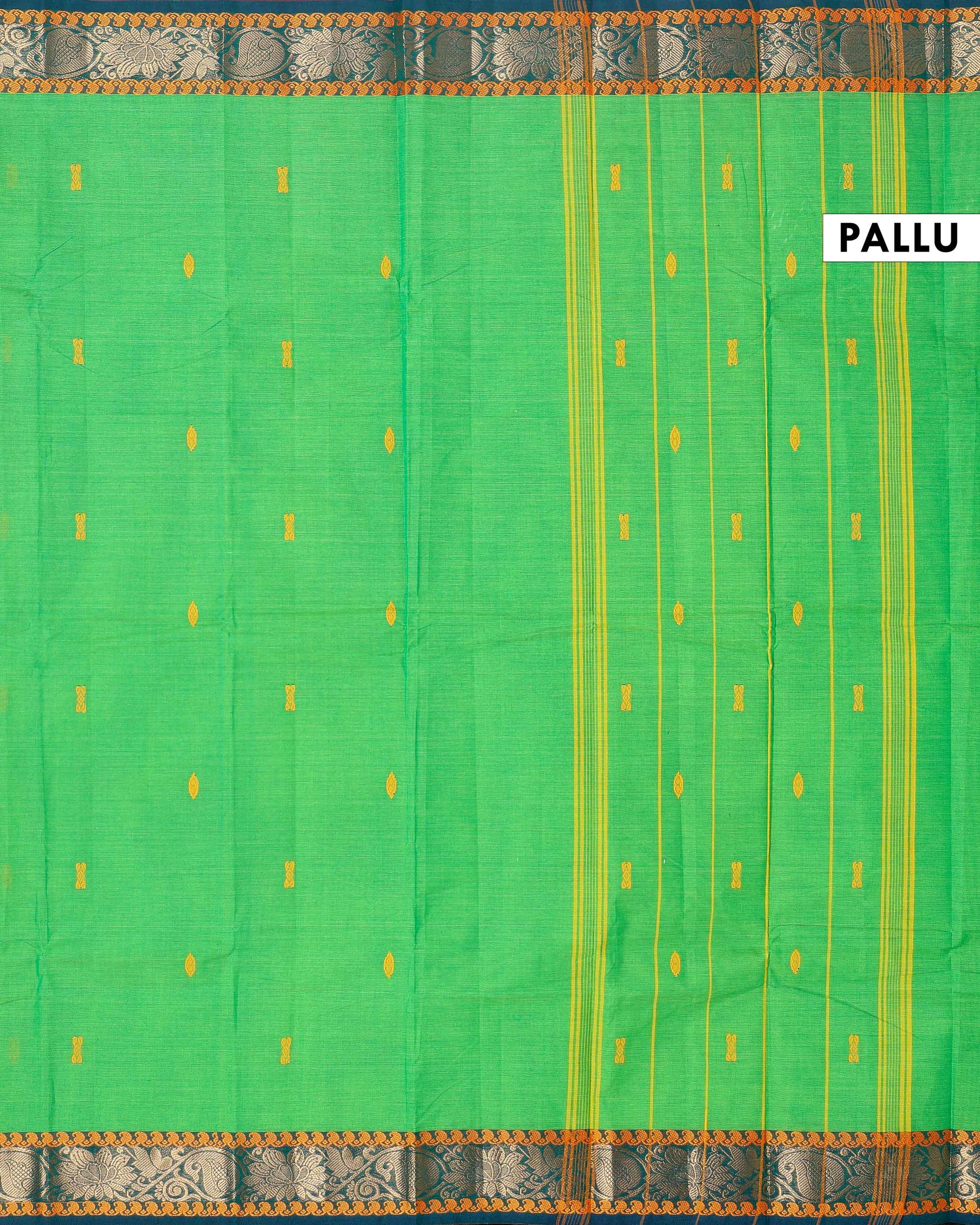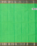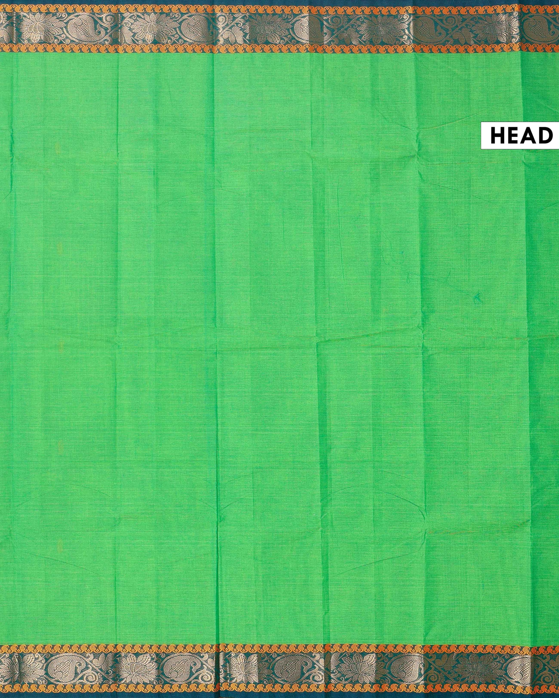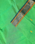- Elevate your ethnic wardrobe with this Handloom Chettinad Cotton Saree, a vibrant green body with a rich, contrasting border with intricate peacock and temple zari motifs