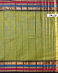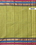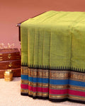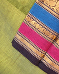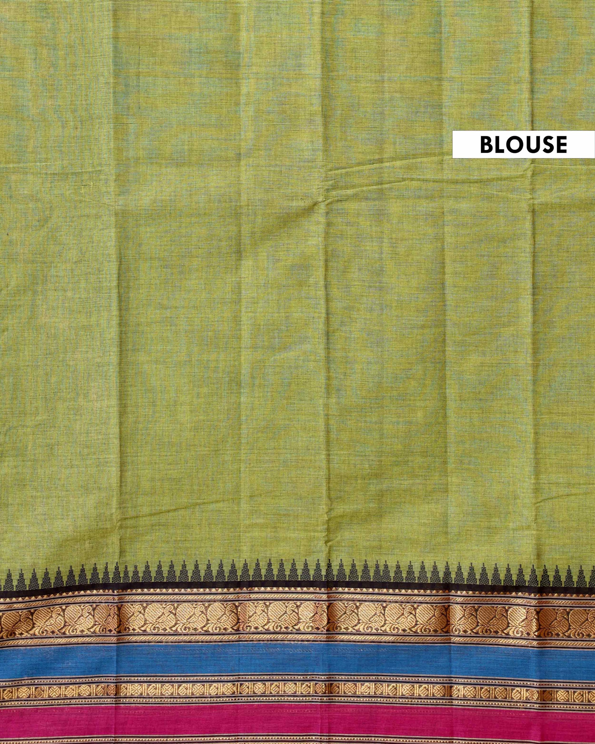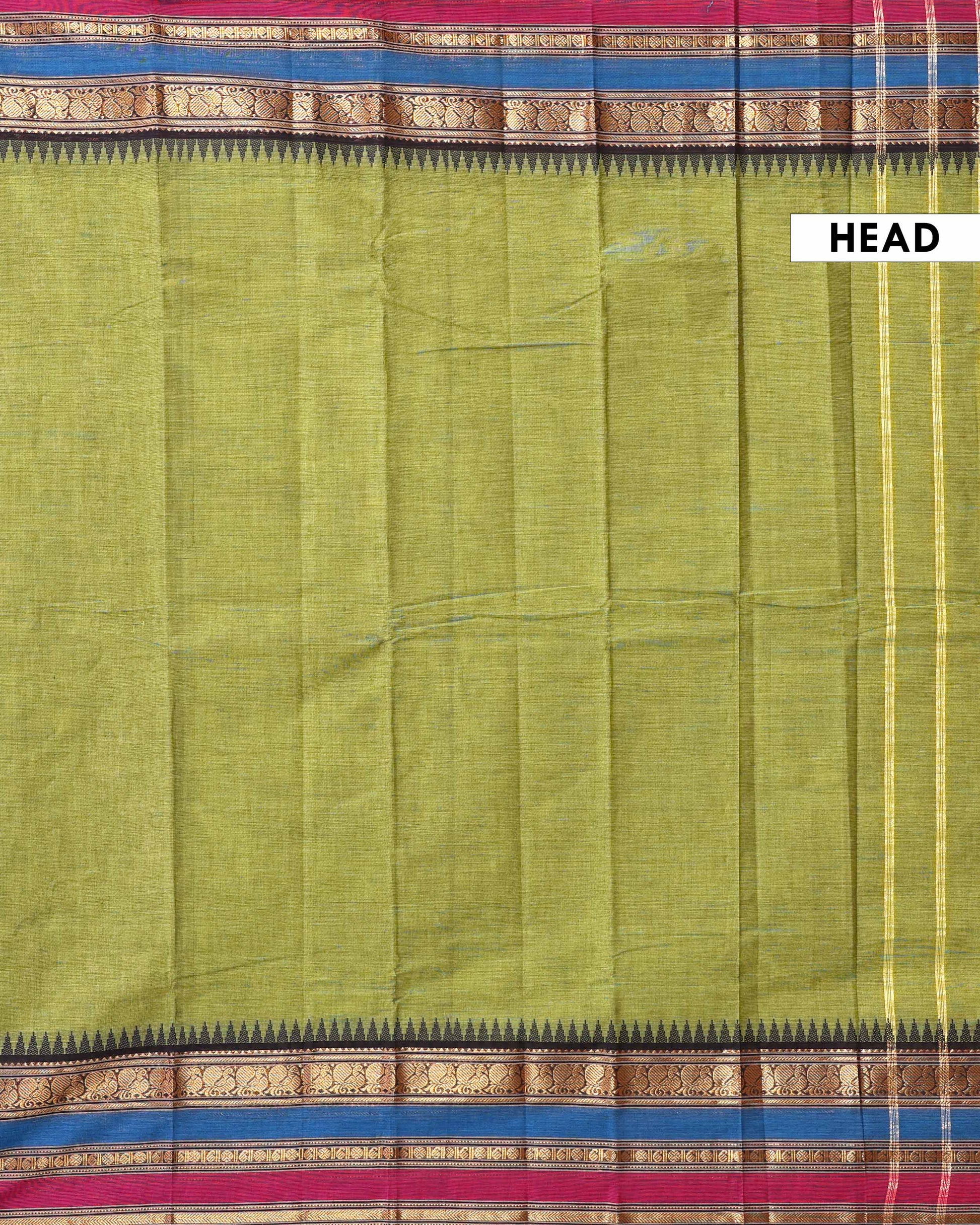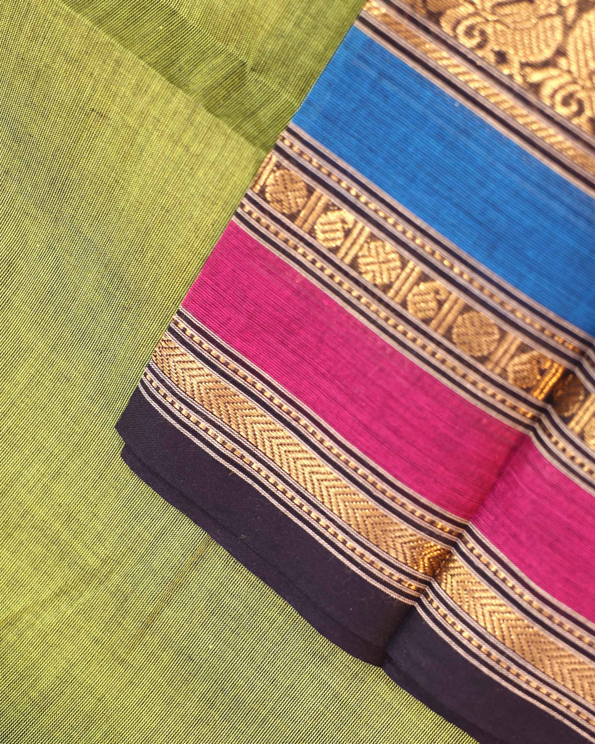 - This stunning handwoven Chettinad cotton saree a vibrant olive green body with a classic gap border in contrasting blue and pink hues