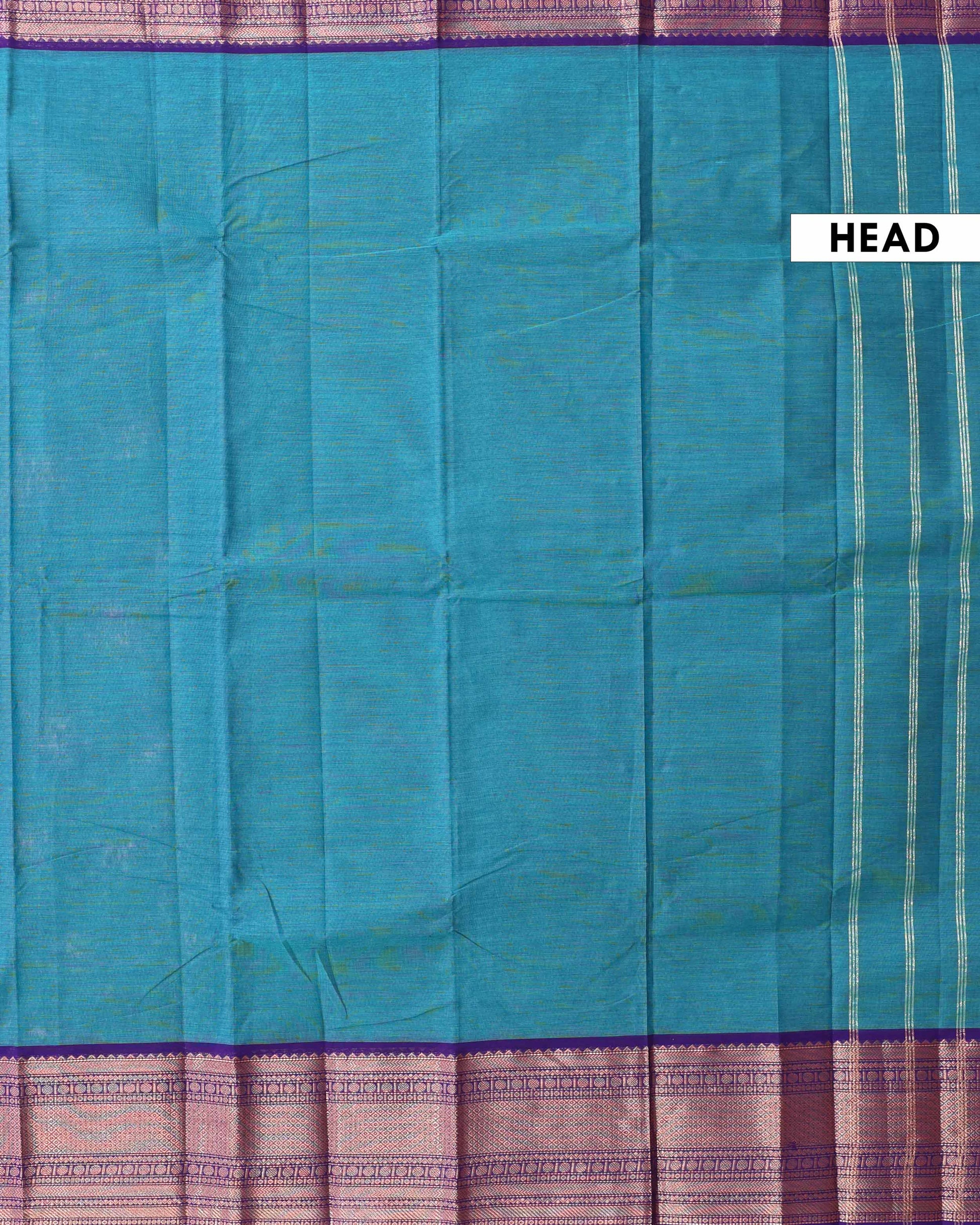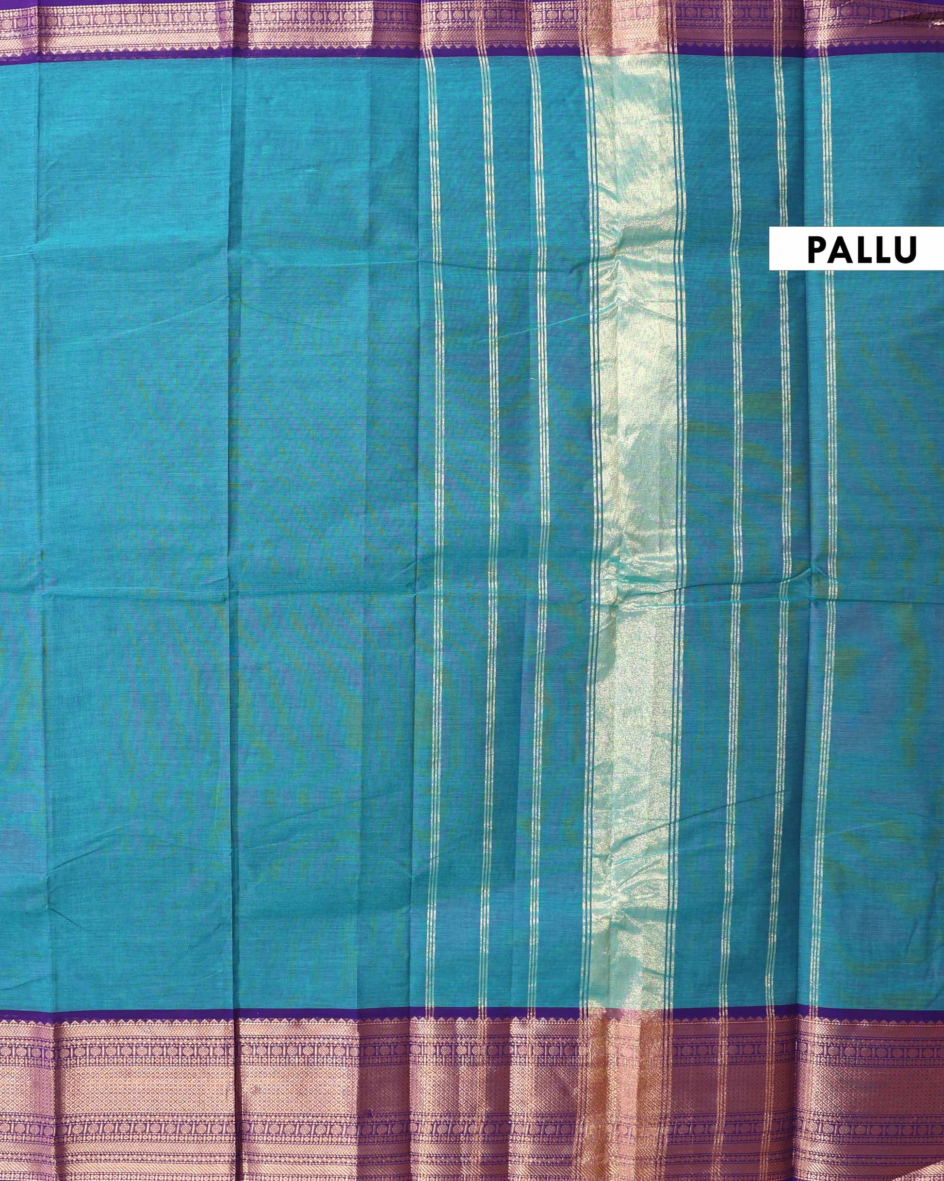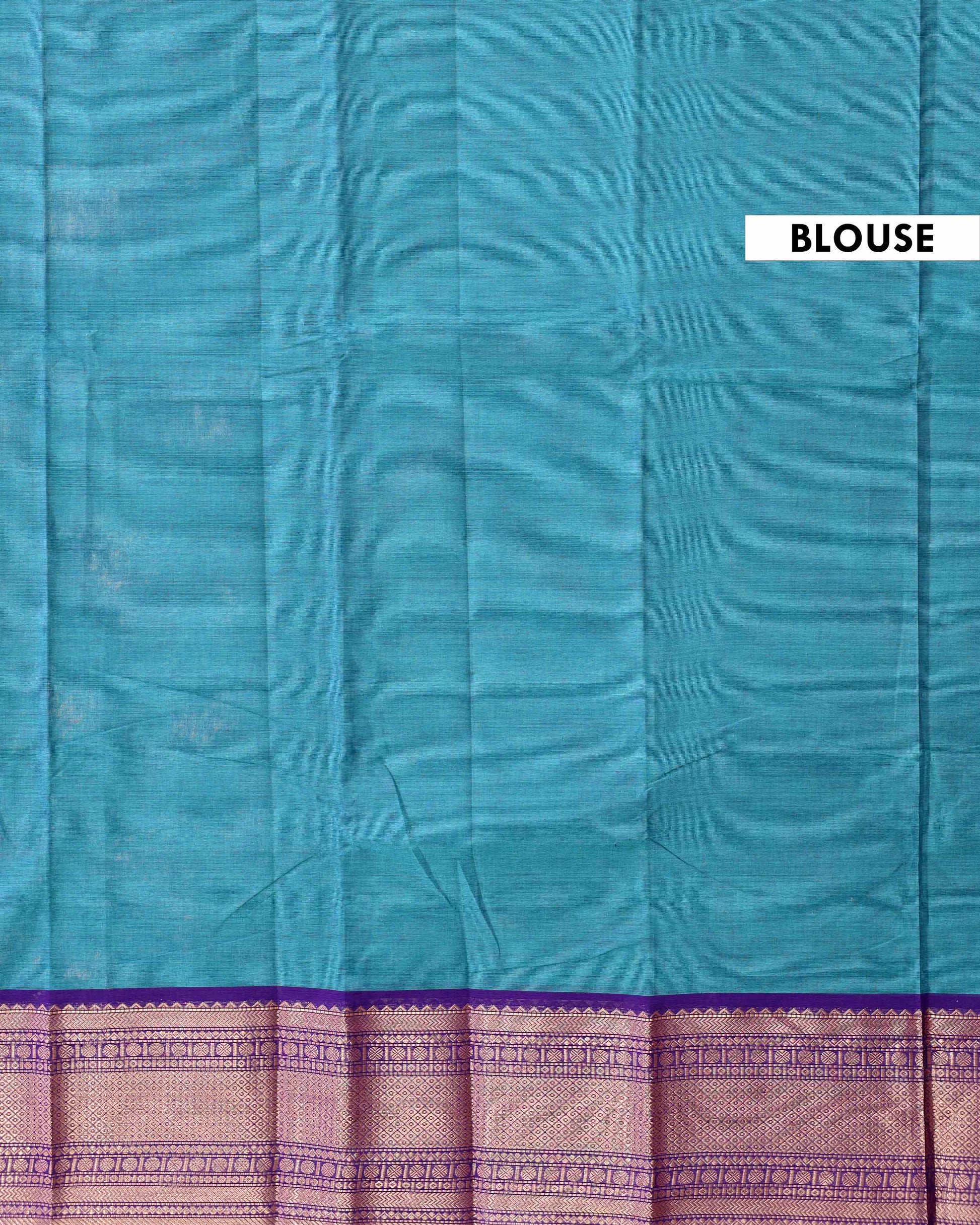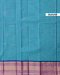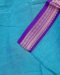 - This stunning Sky Blue Chettinad Cotton saree is a masterpiece of traditional handloom weaving a vibrant contrast purple and gold zari border.
