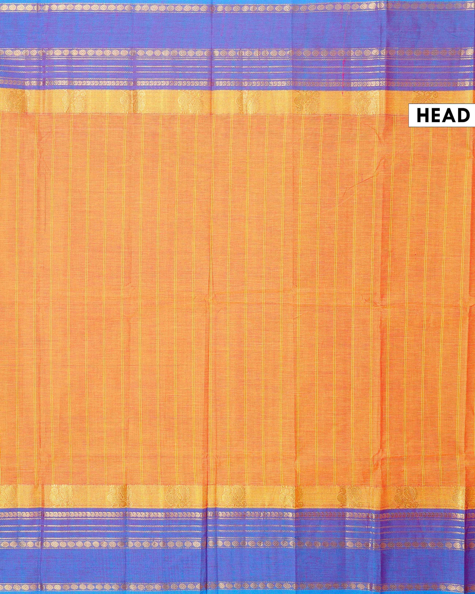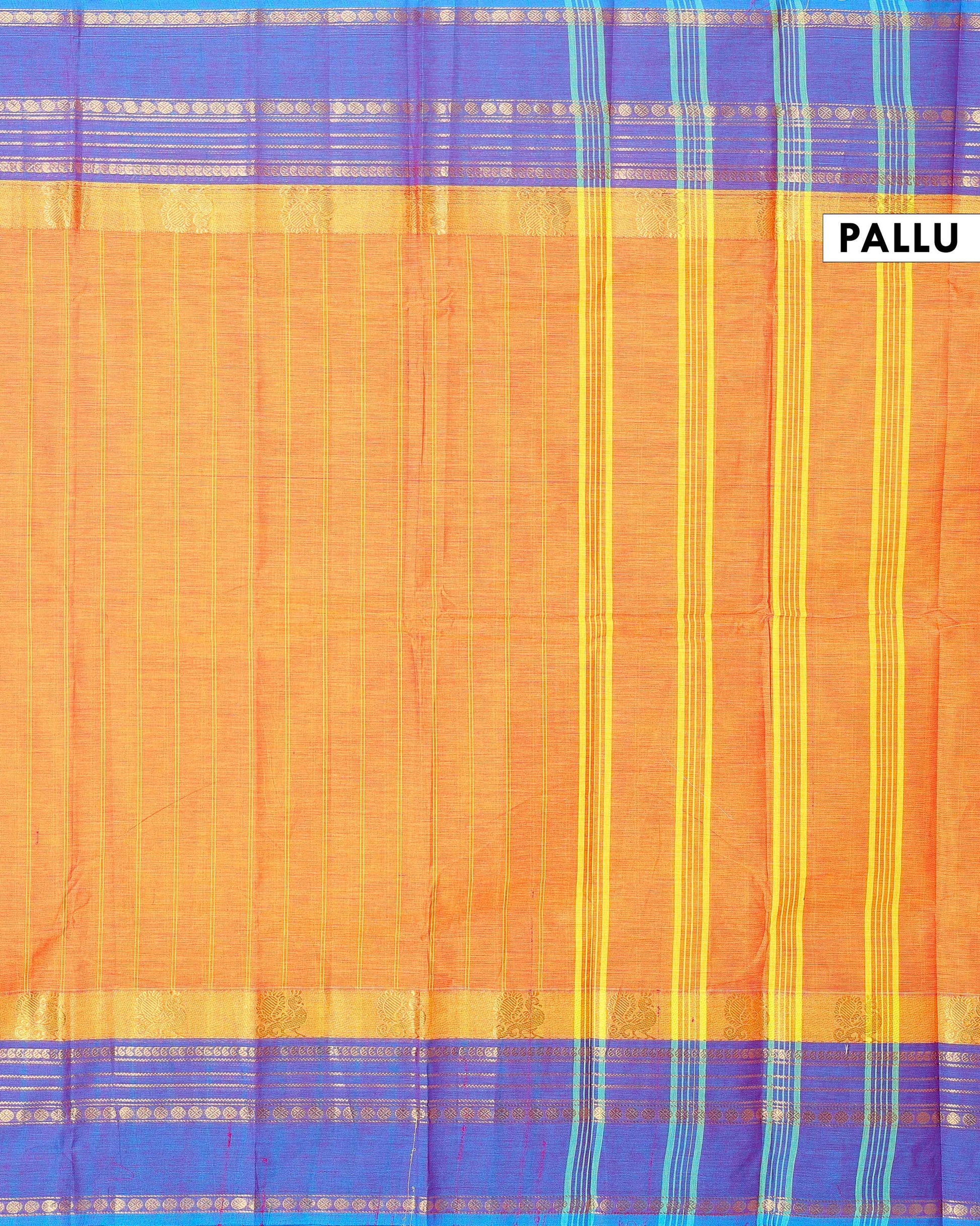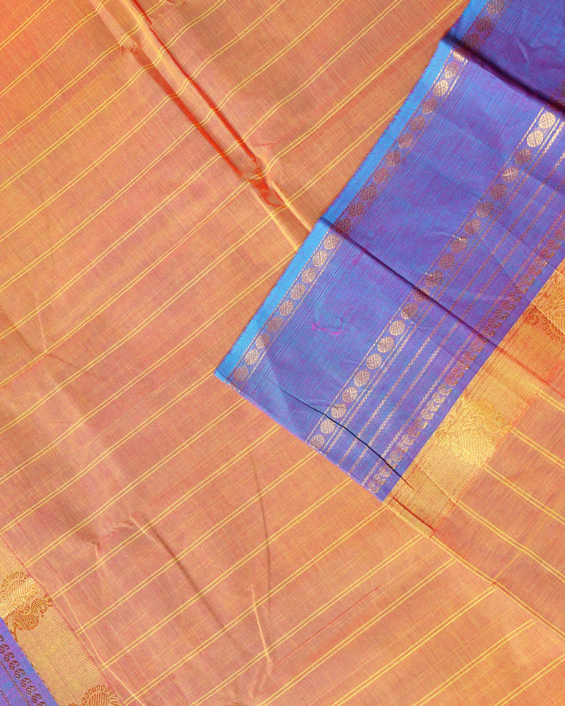 - Elevate your ethnic wardrobe with this handwoven Chettinad cotton saree, a vibrant Sandal body with subtle stripes and a rich, contrasting border