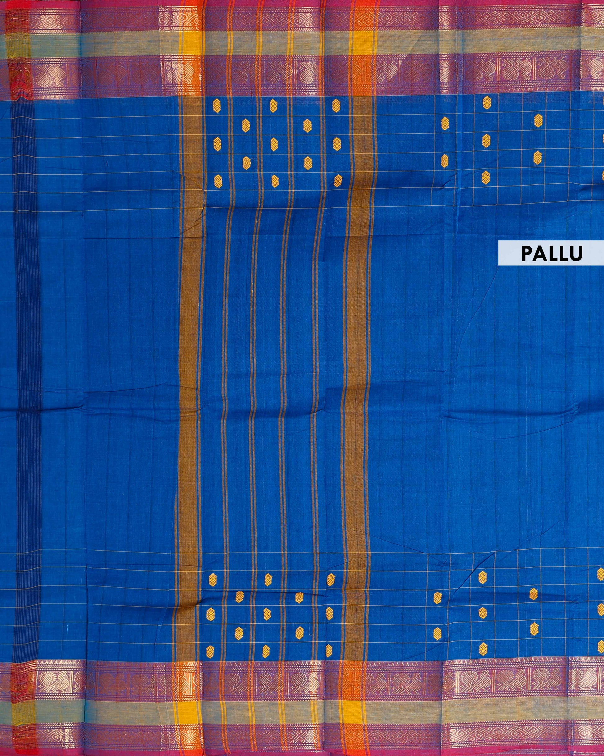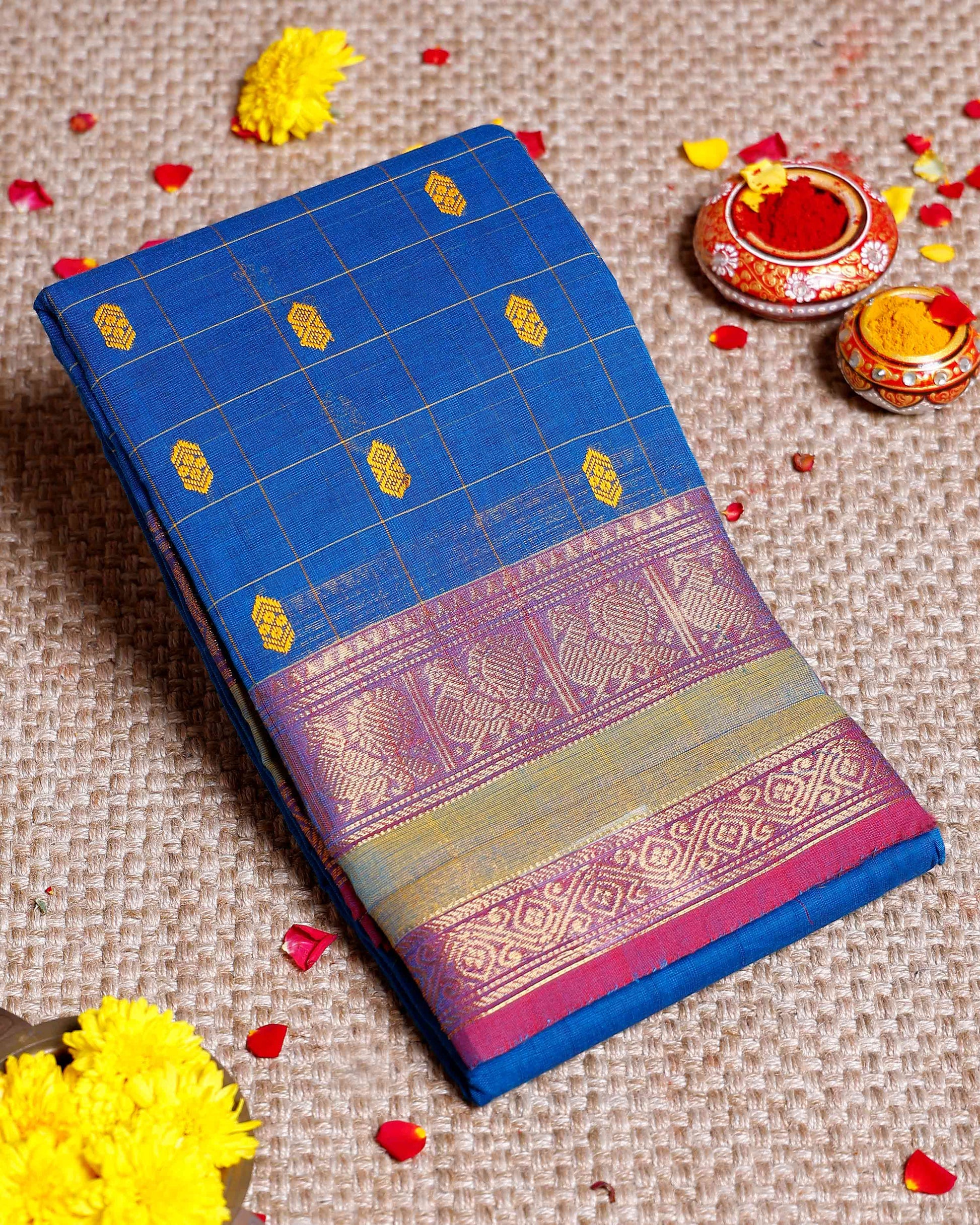 Elegant Chettinad Cotton Saree with Traditional Zari Border & Butta Motifs - Blue