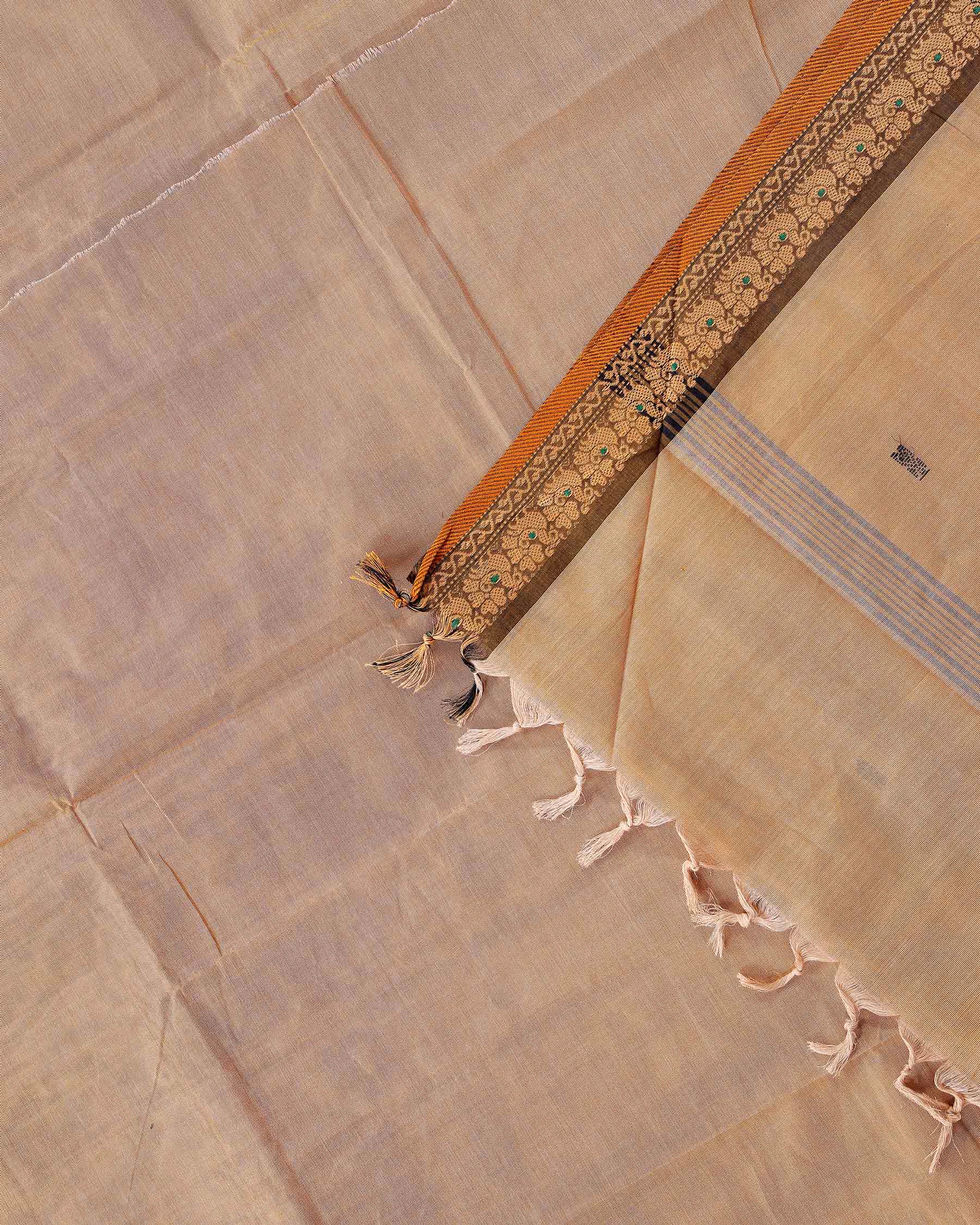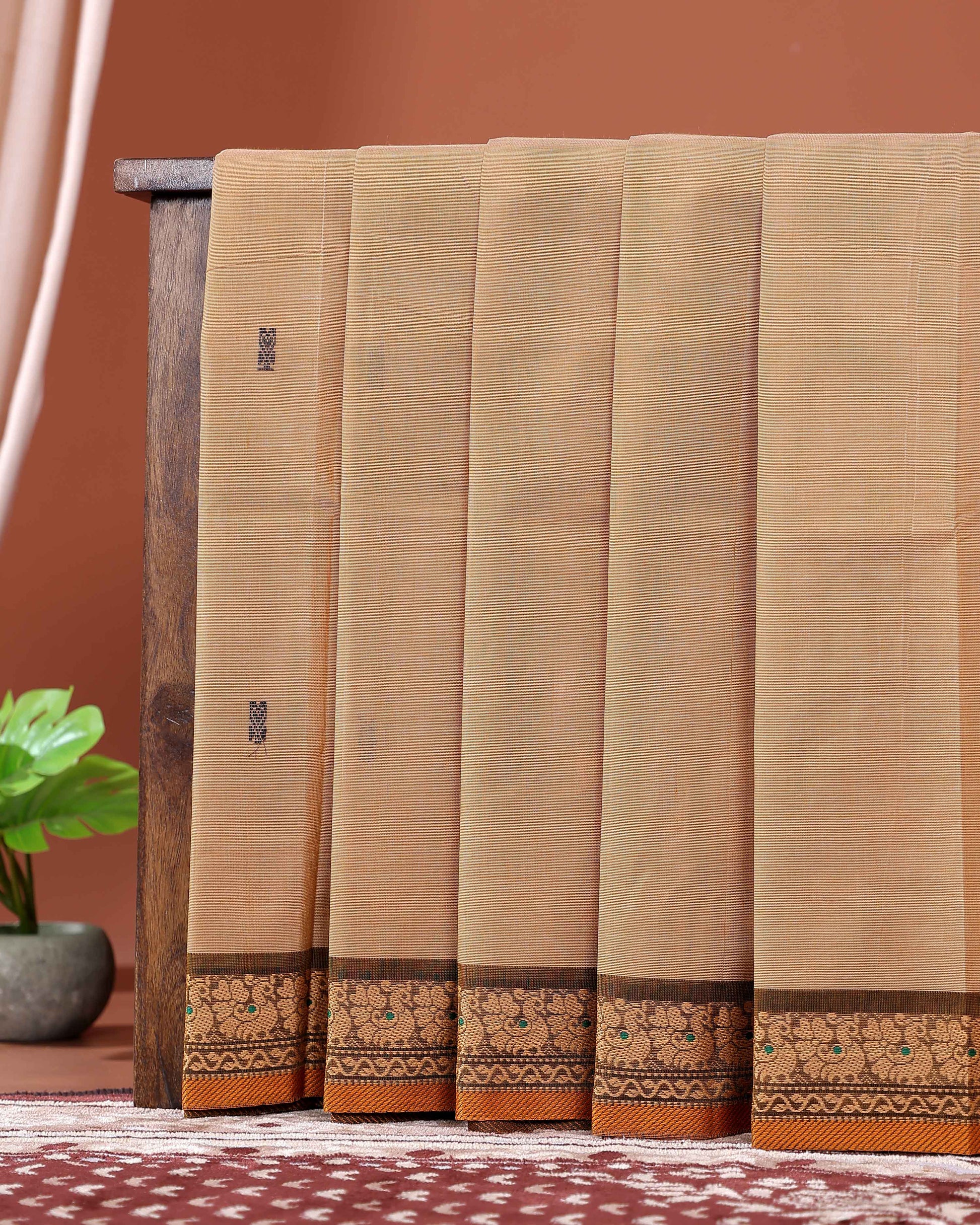 Step into refined tradition with this elegant brown Chettinad cotton saree a subtly striped body and a contrasting, intricately woven border with peacock and Floral motifs.