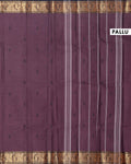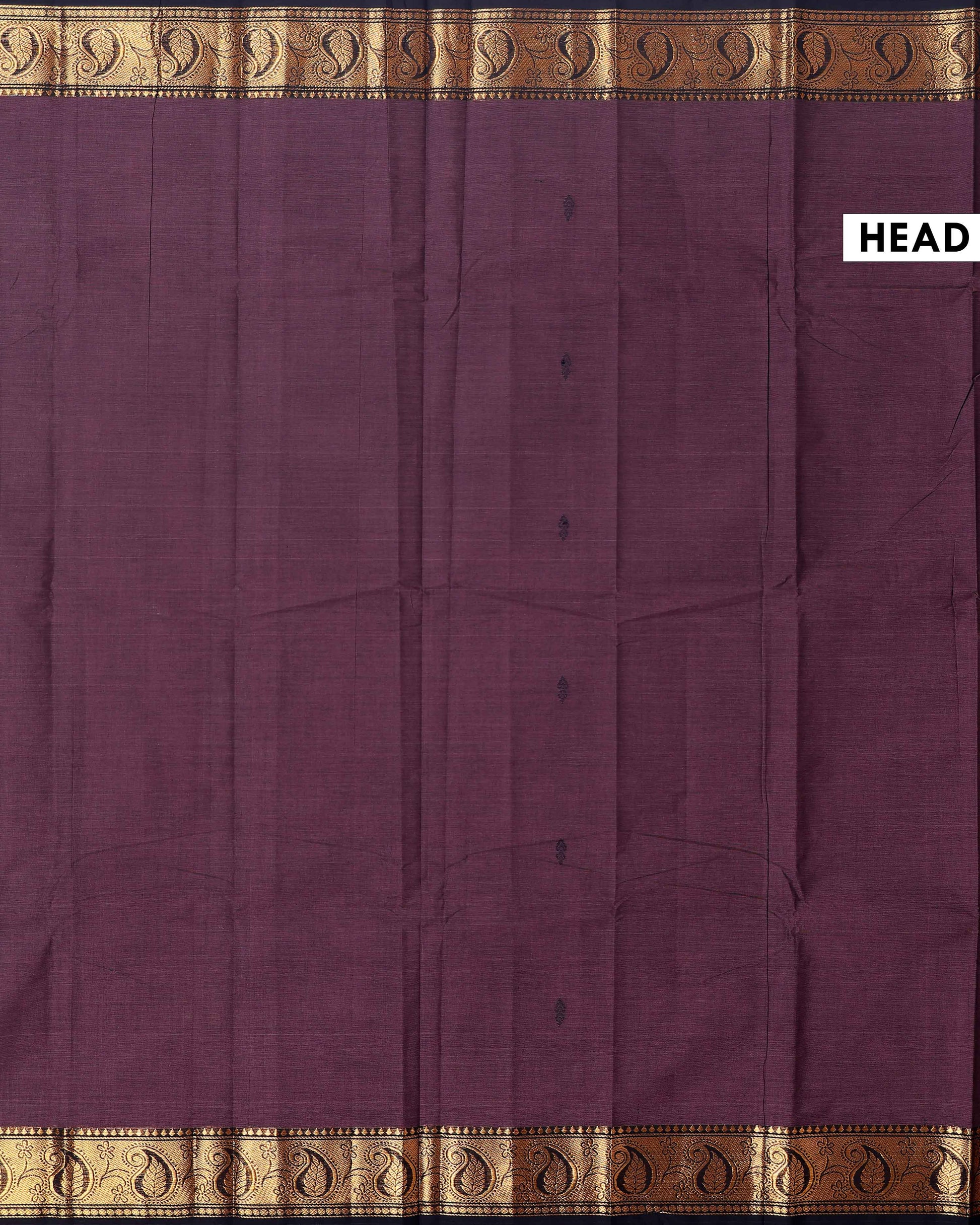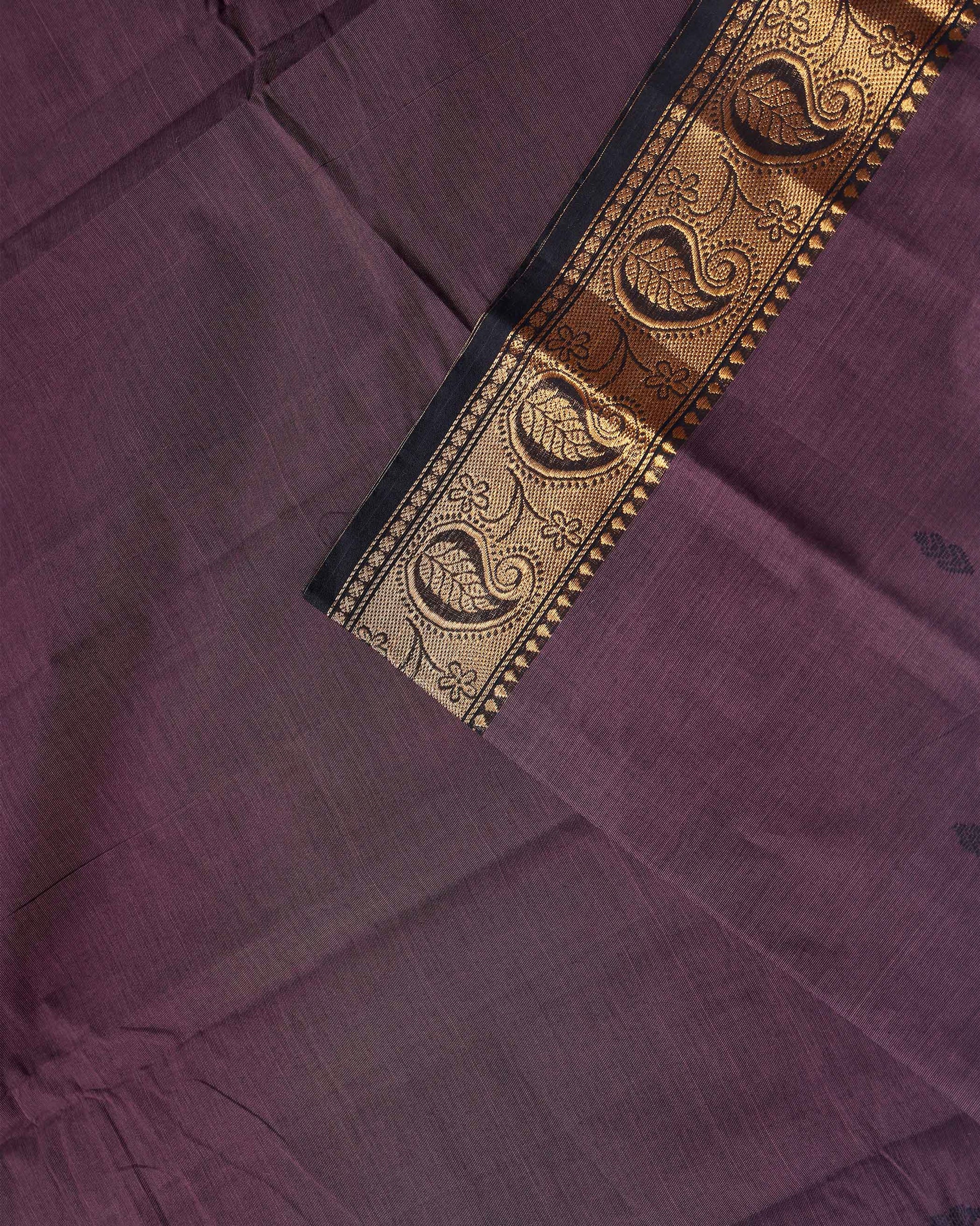 Traditional Chettinad Handloom Cotton Saree with Golden Zari Woven Border and Buttas - Dark Brown
