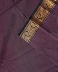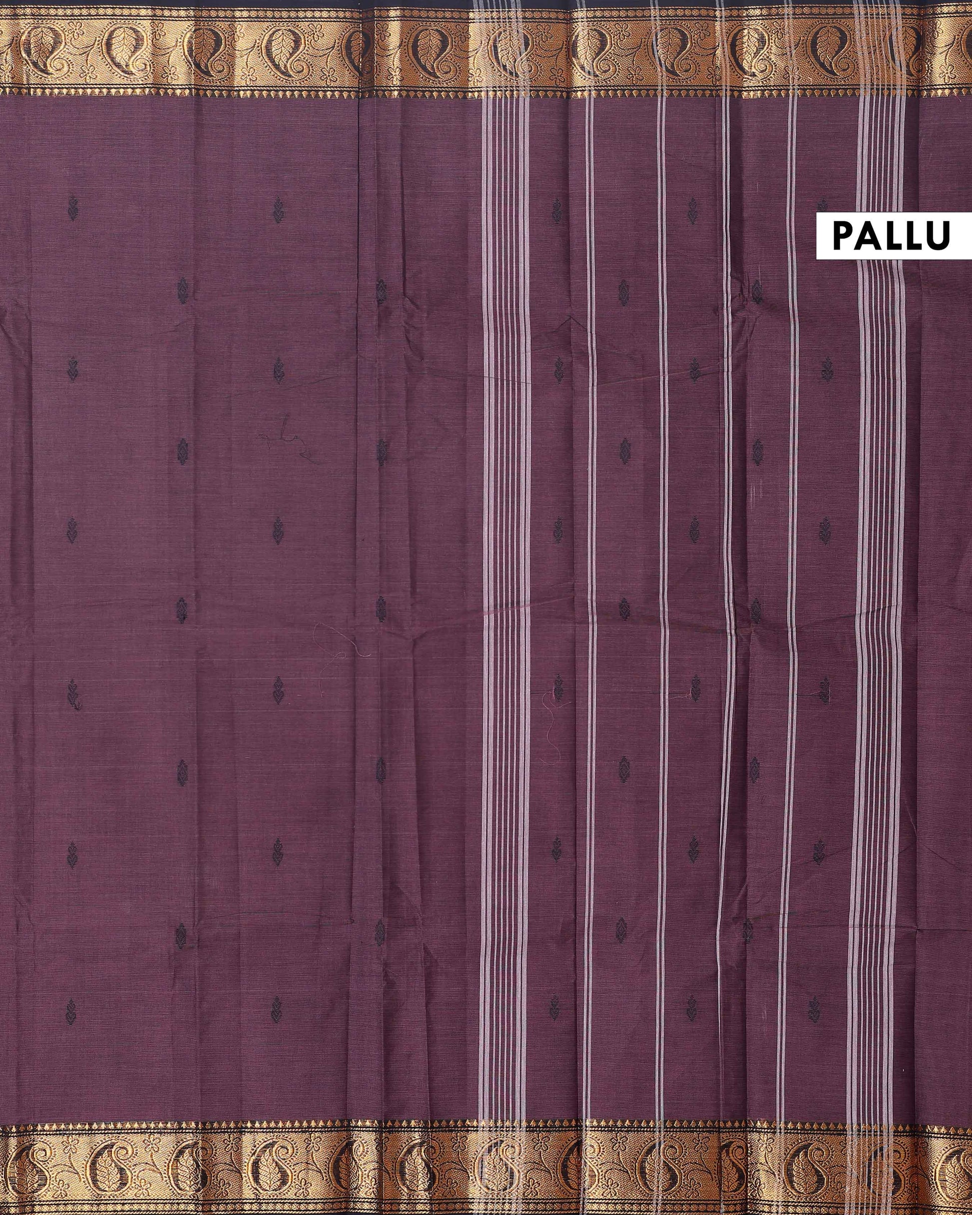 - This elegant Chettinad cotton saree a Dark Brown body with subtle stripes and a rich, contrasting dark green and gold zari border with traditional motifs